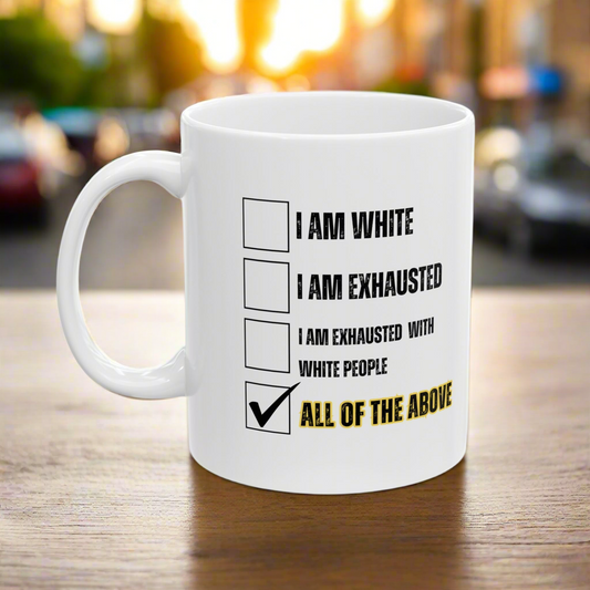 “I AM EXHAUSTED WITH WHITE PEOPLE” Ceramic Mug, (11oz, 15oz)