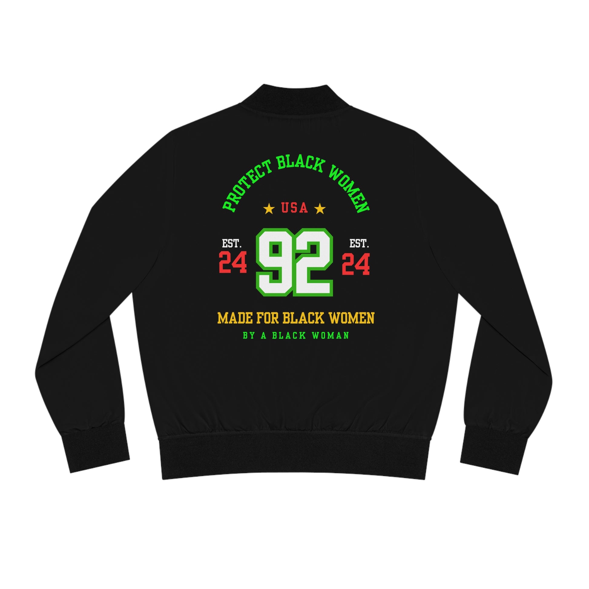 Featuring the vibrant black, red, green, and yellow palette synonymous with Black culture and freedom, this jacket is a tribute to unity, and resilience. Crafted with premium materials, it offers a sleek fit, ribbed cuffs, and a lightweight design for year-round wear. The back proudly displays a custom “92% Club” graphic, symbolizing your role in shaping history and leading change.