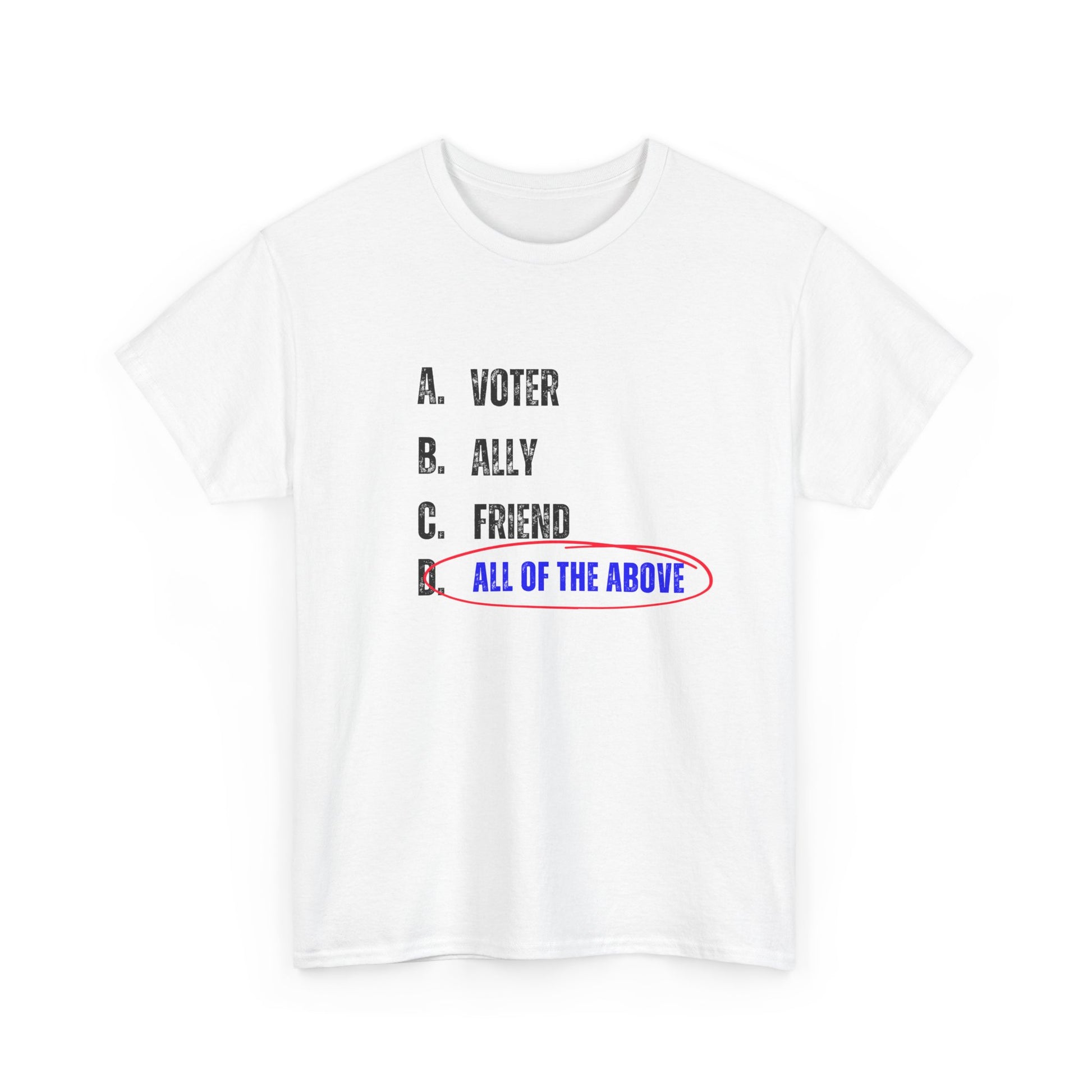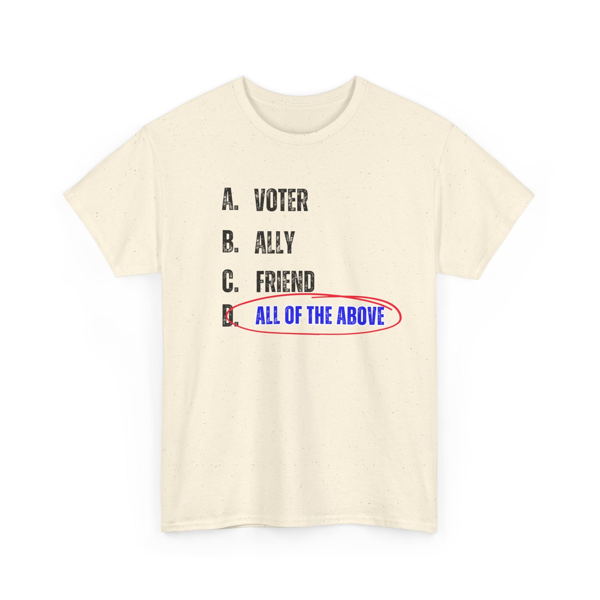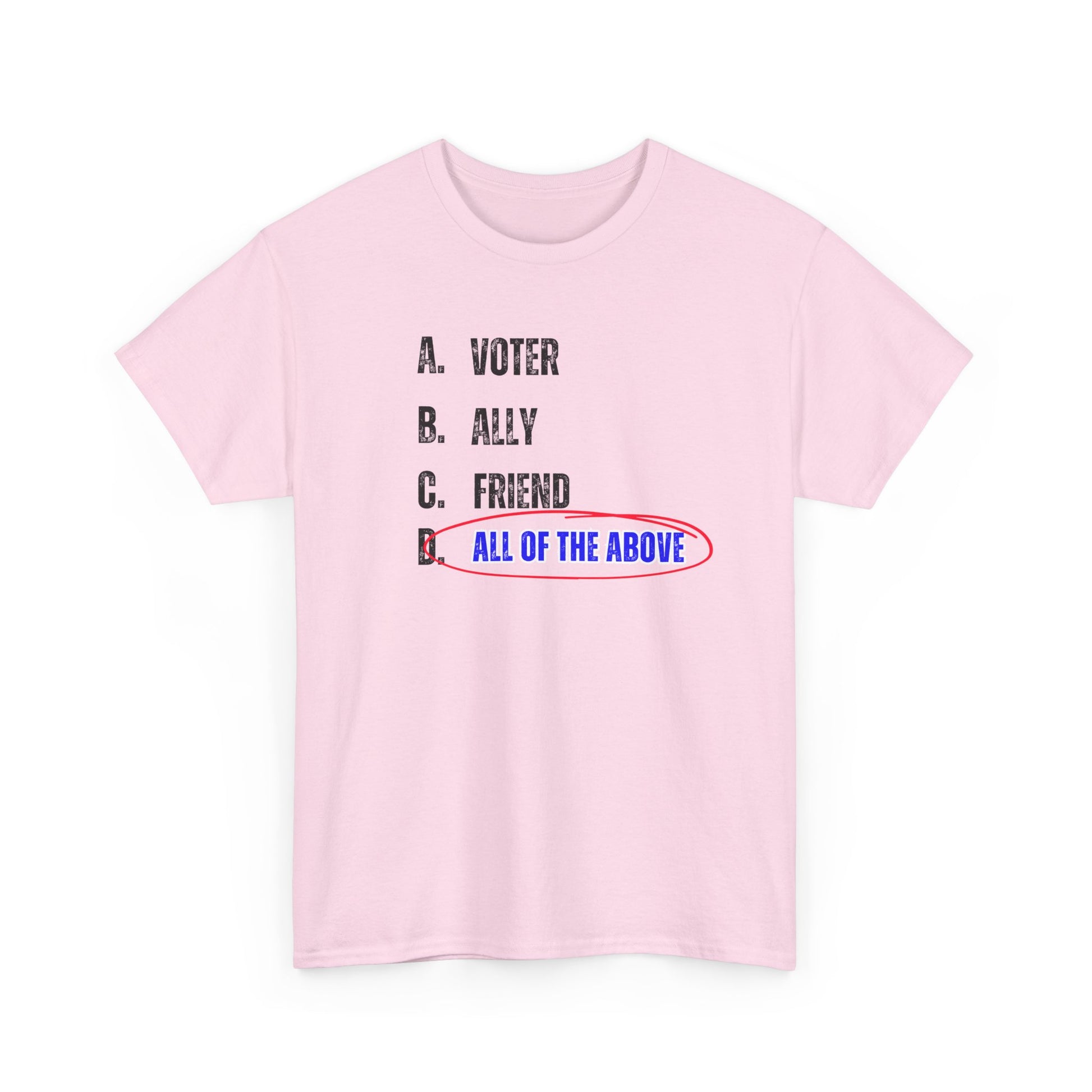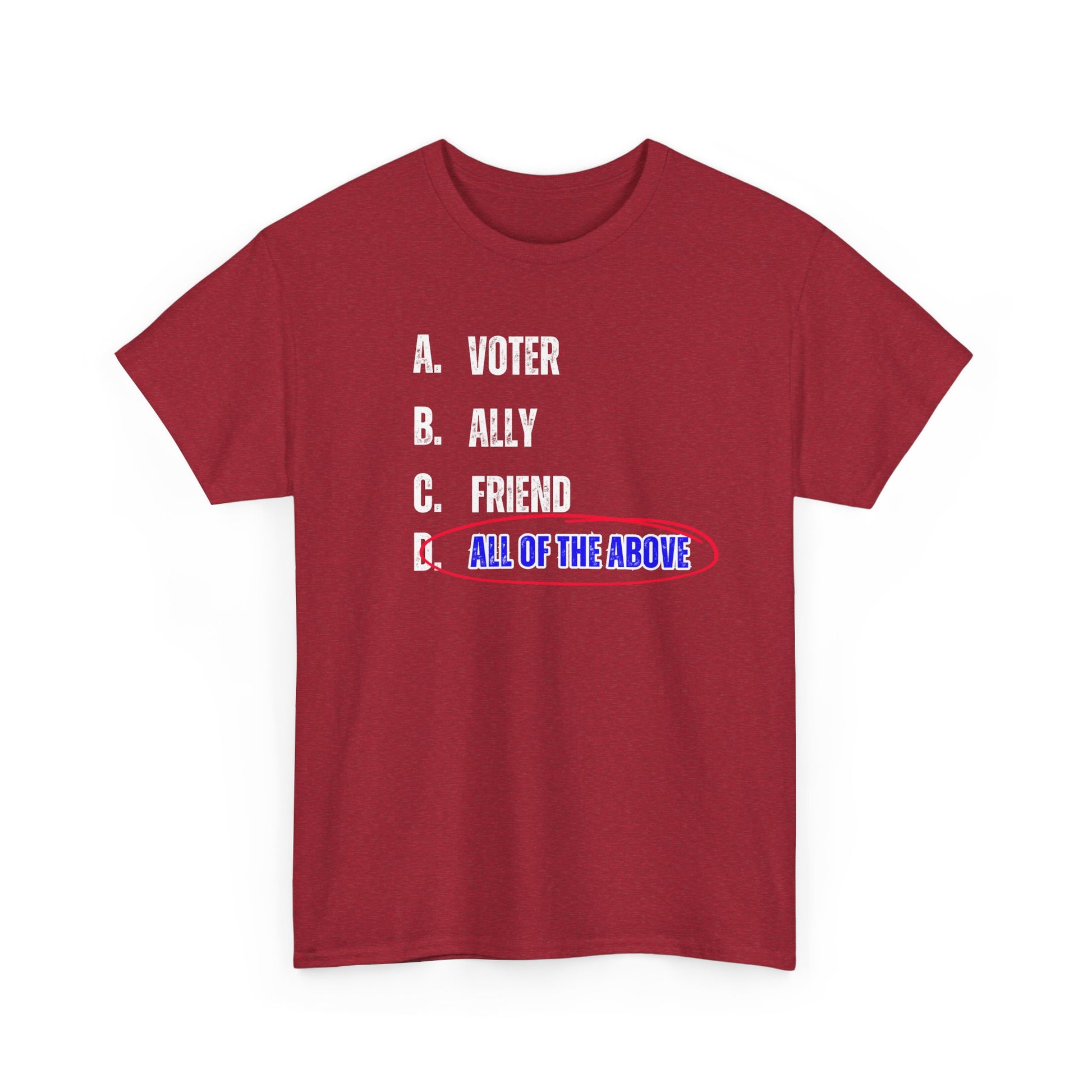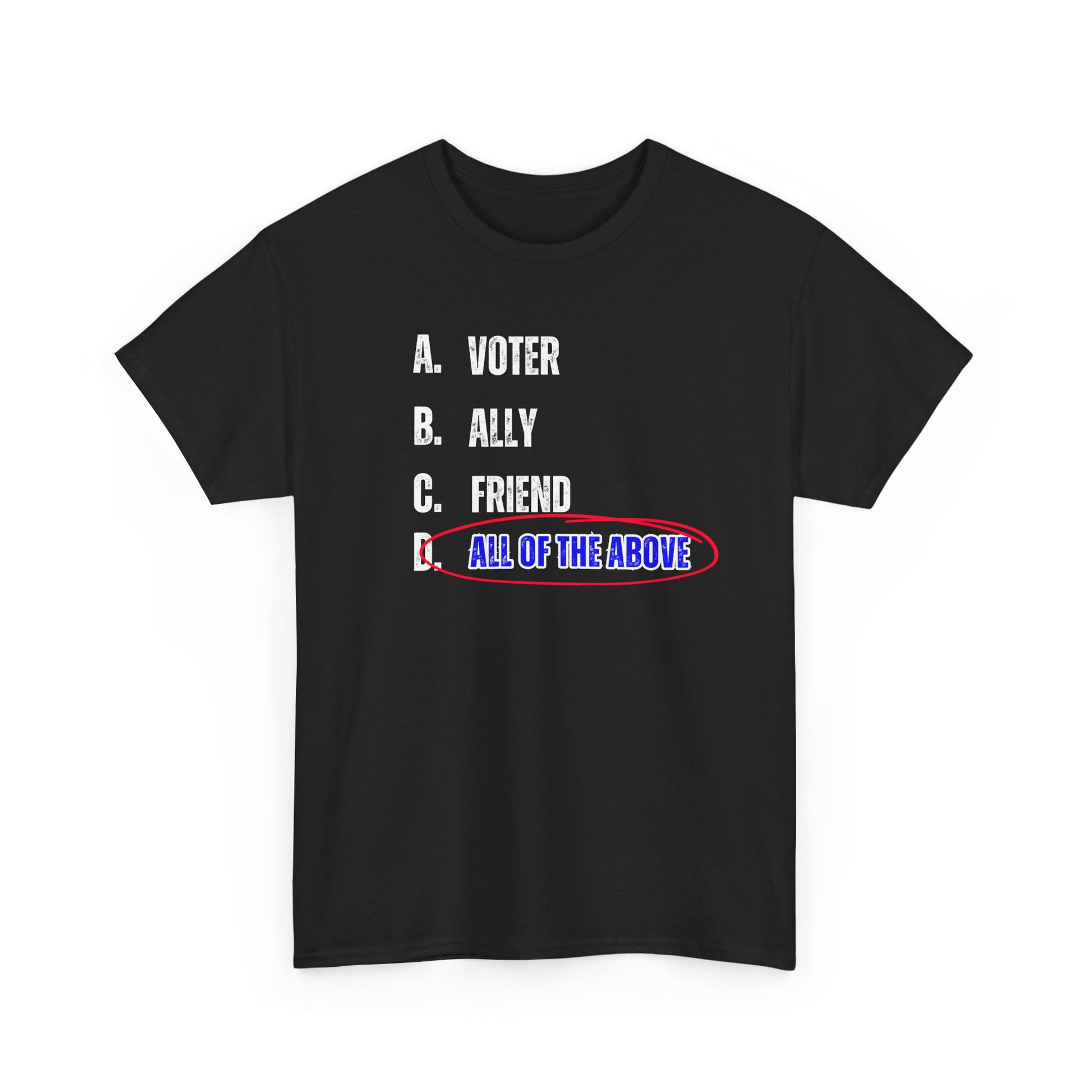 This "All of the Above" T-shirt is a subtle but impactful way to show where you stand. Featuring a design styled like a multiple-choice question, it reads, "Voter, Ally, Friend, or all of the above?" with "D. All of the above" circled. This shirt is for those who were proud to support human rights during the 2024 presidential election. Made from soft, breathable cotton, it’s perfect for making a statement about unity, compassion, and standing up for what’s right.