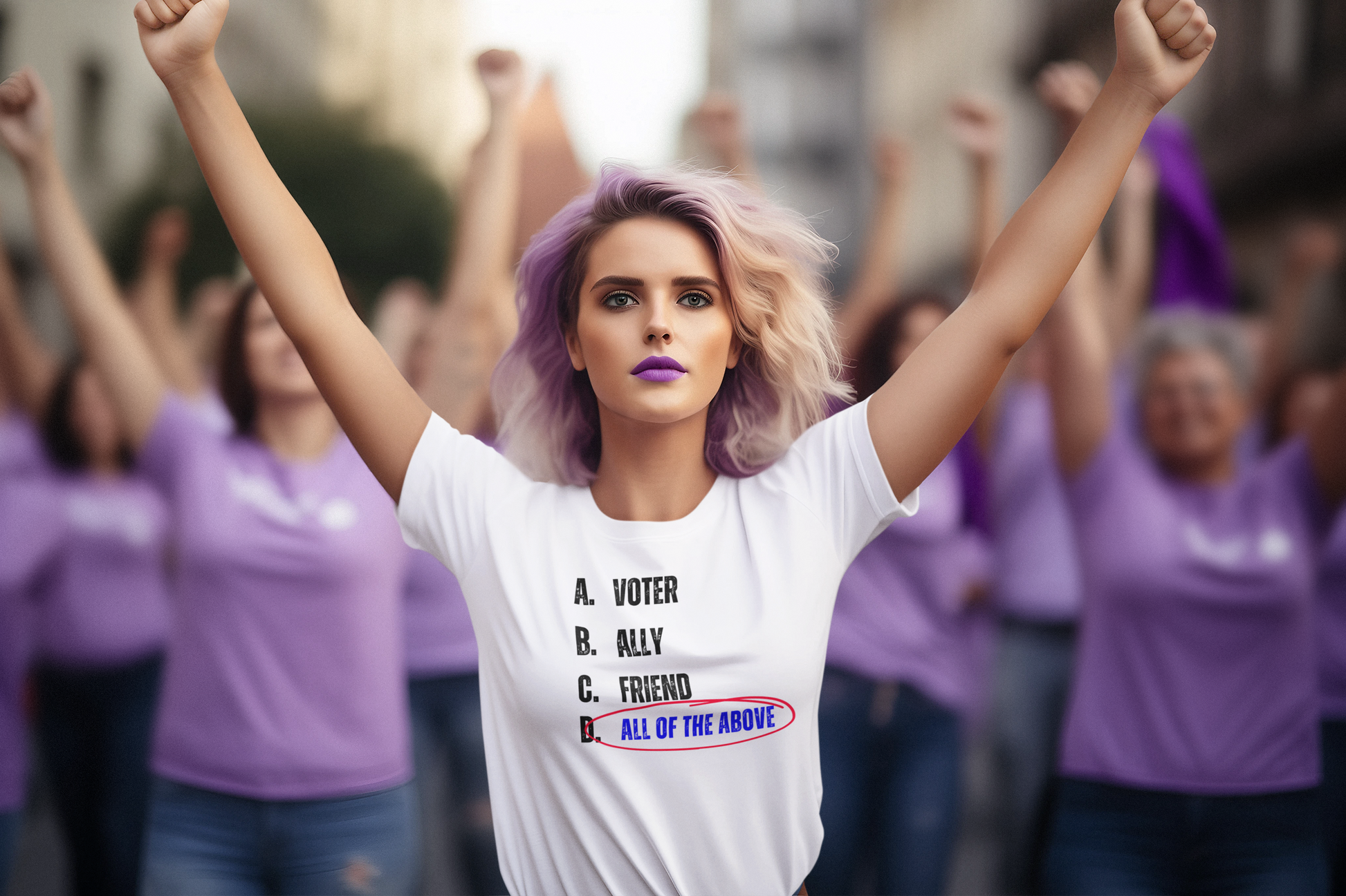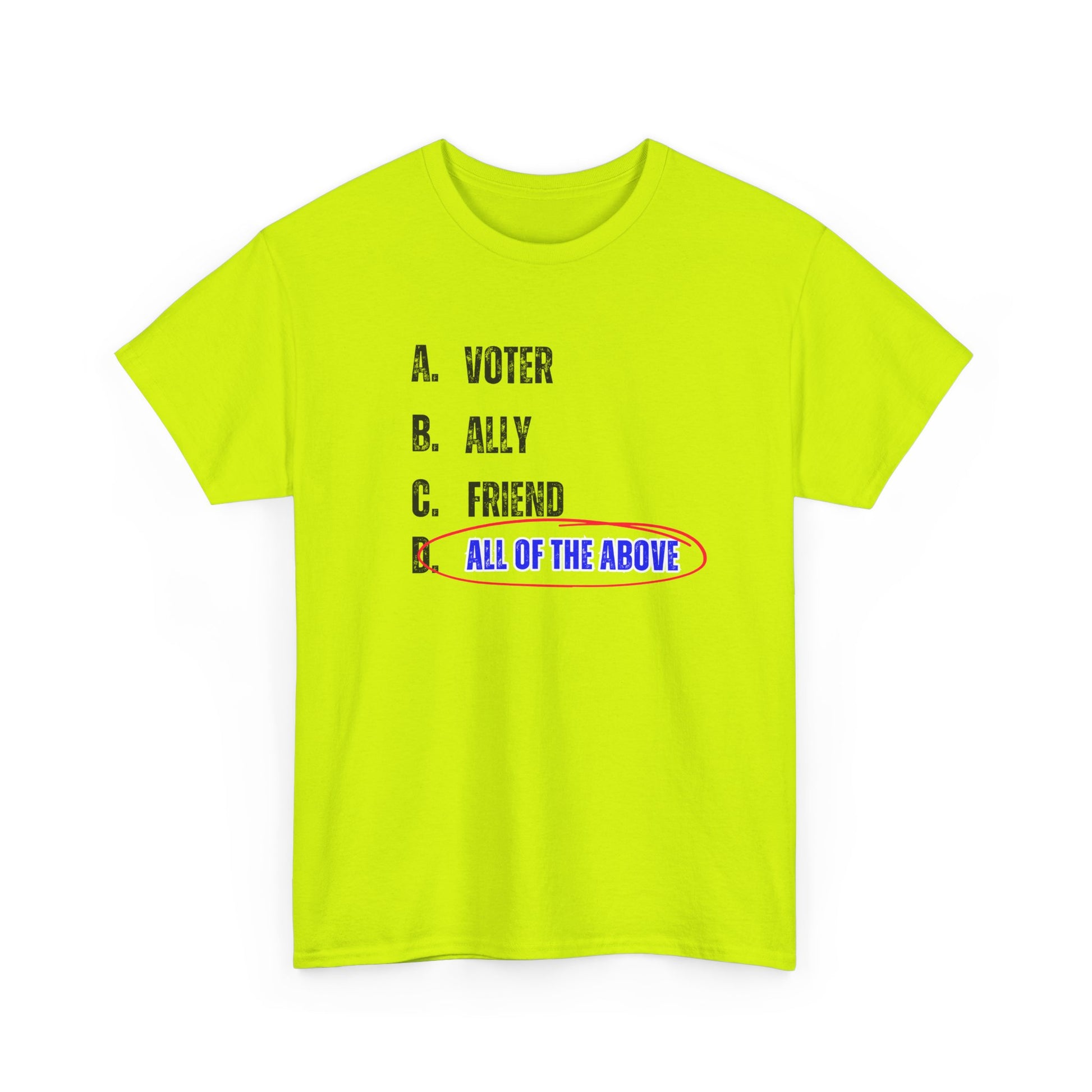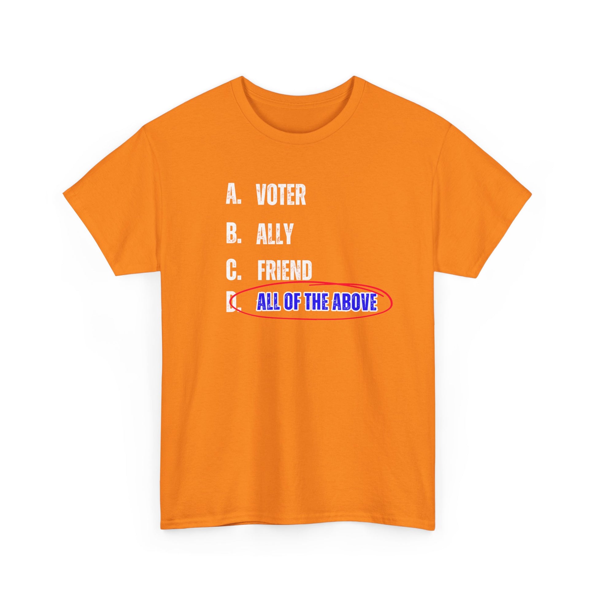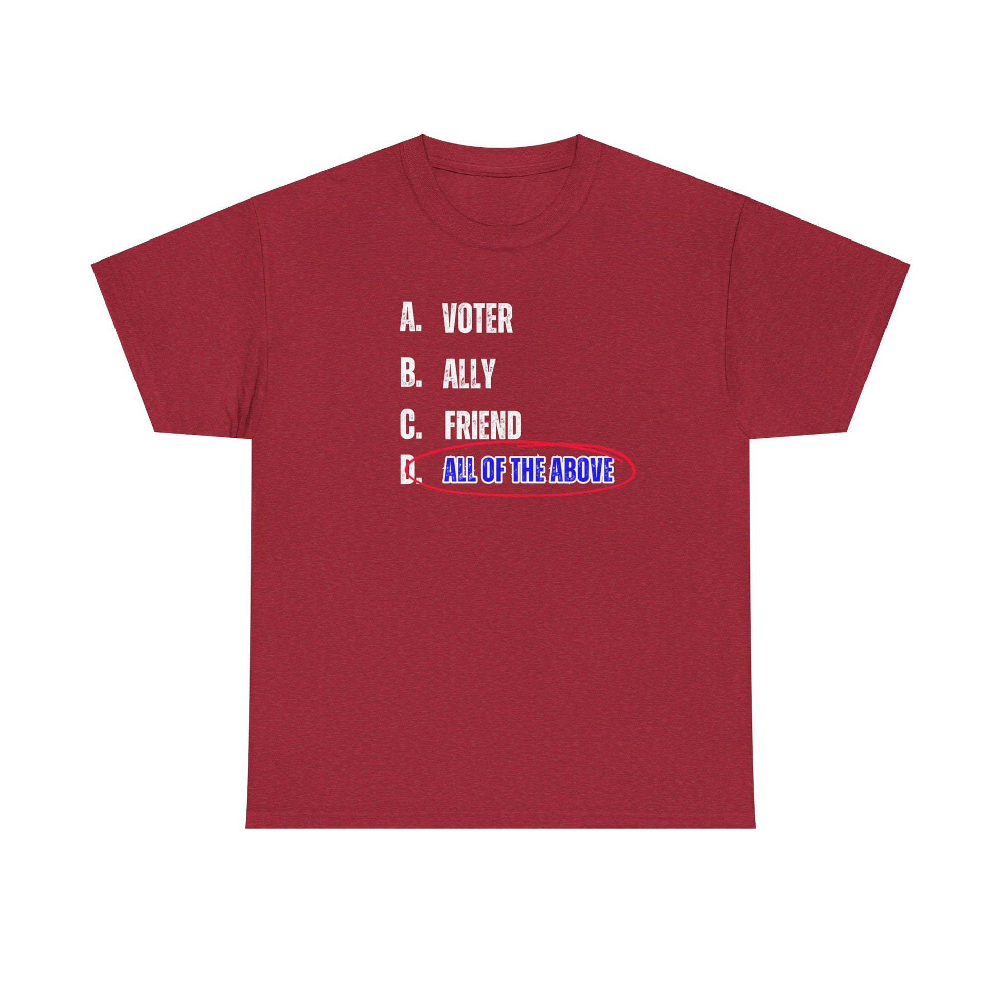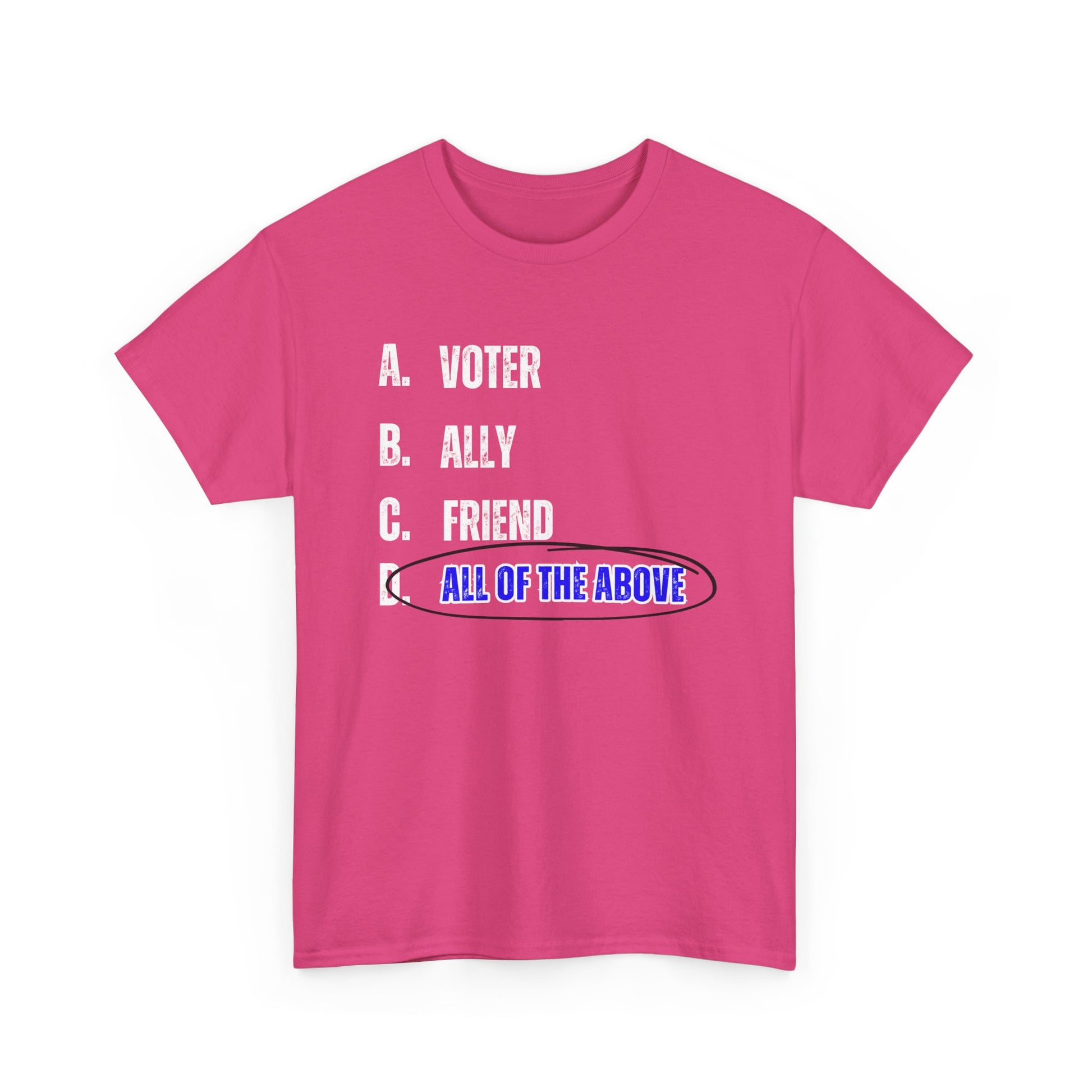 This "All of the Above" T-shirt is a subtle but impactful way to show where you stand. Featuring a design styled like a multiple-choice question, it reads, "Voter, Ally, Friend, or all of the above?" with "D. All of the above" circled. This shirt is for those who were proud to support human rights during the 2024 presidential election. Made from soft, breathable cotton, it’s perfect for making a statement about unity, compassion, and standing up for what’s right.