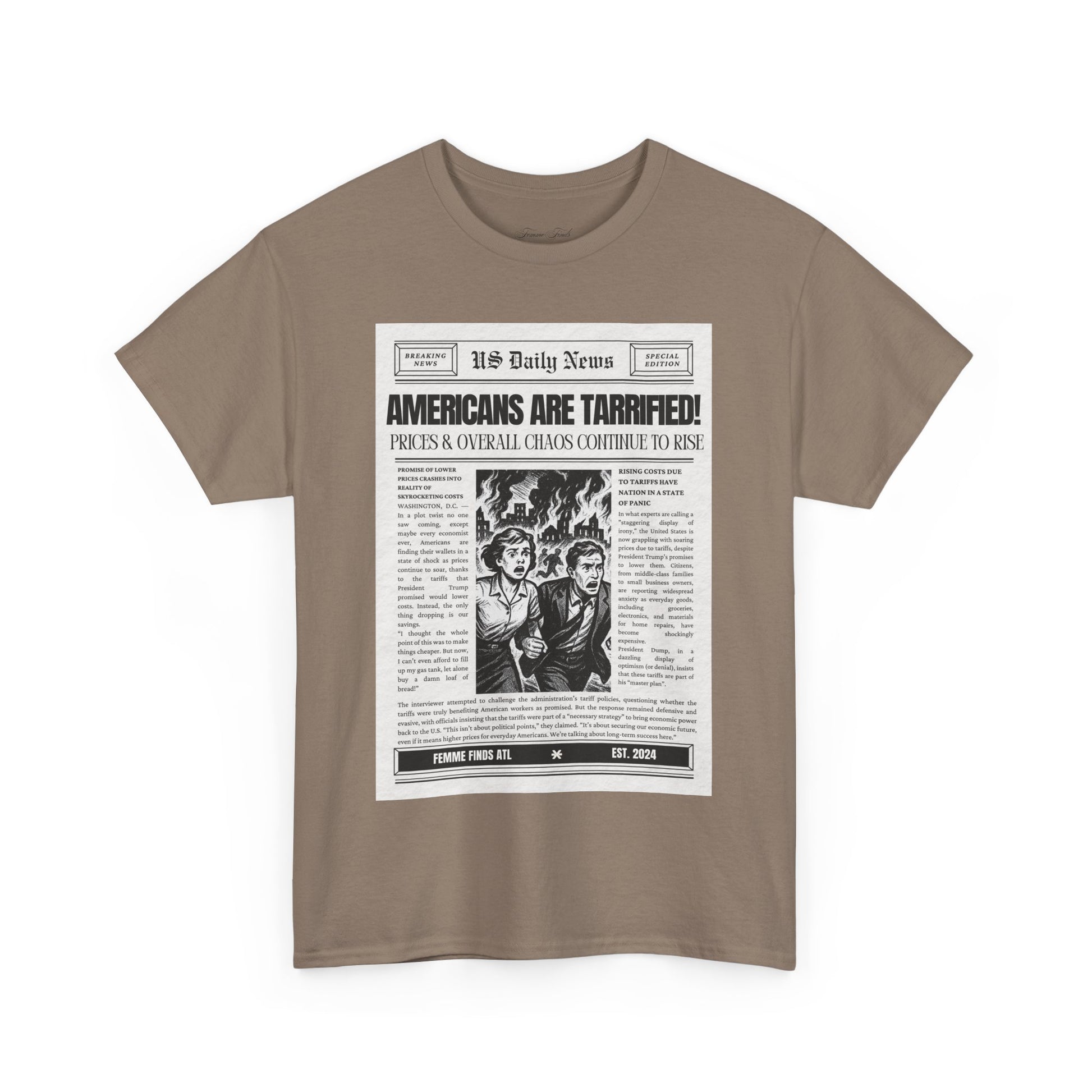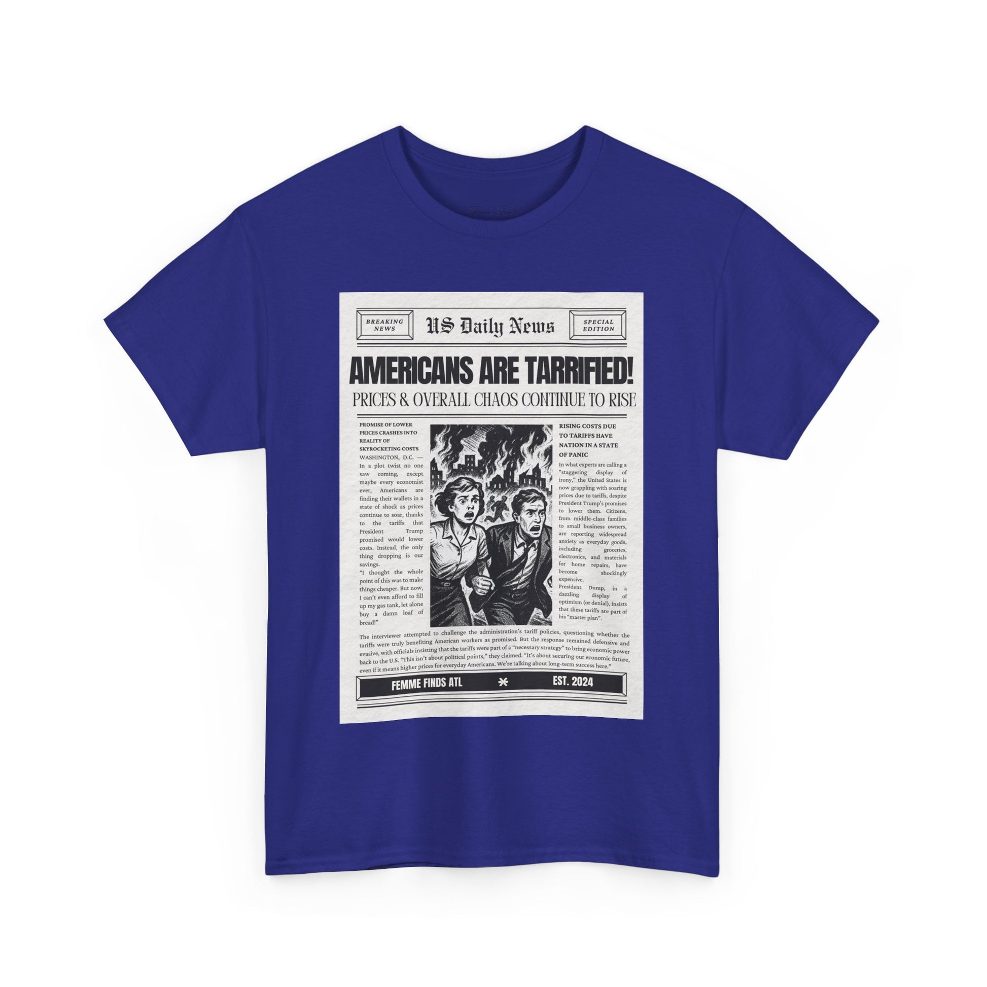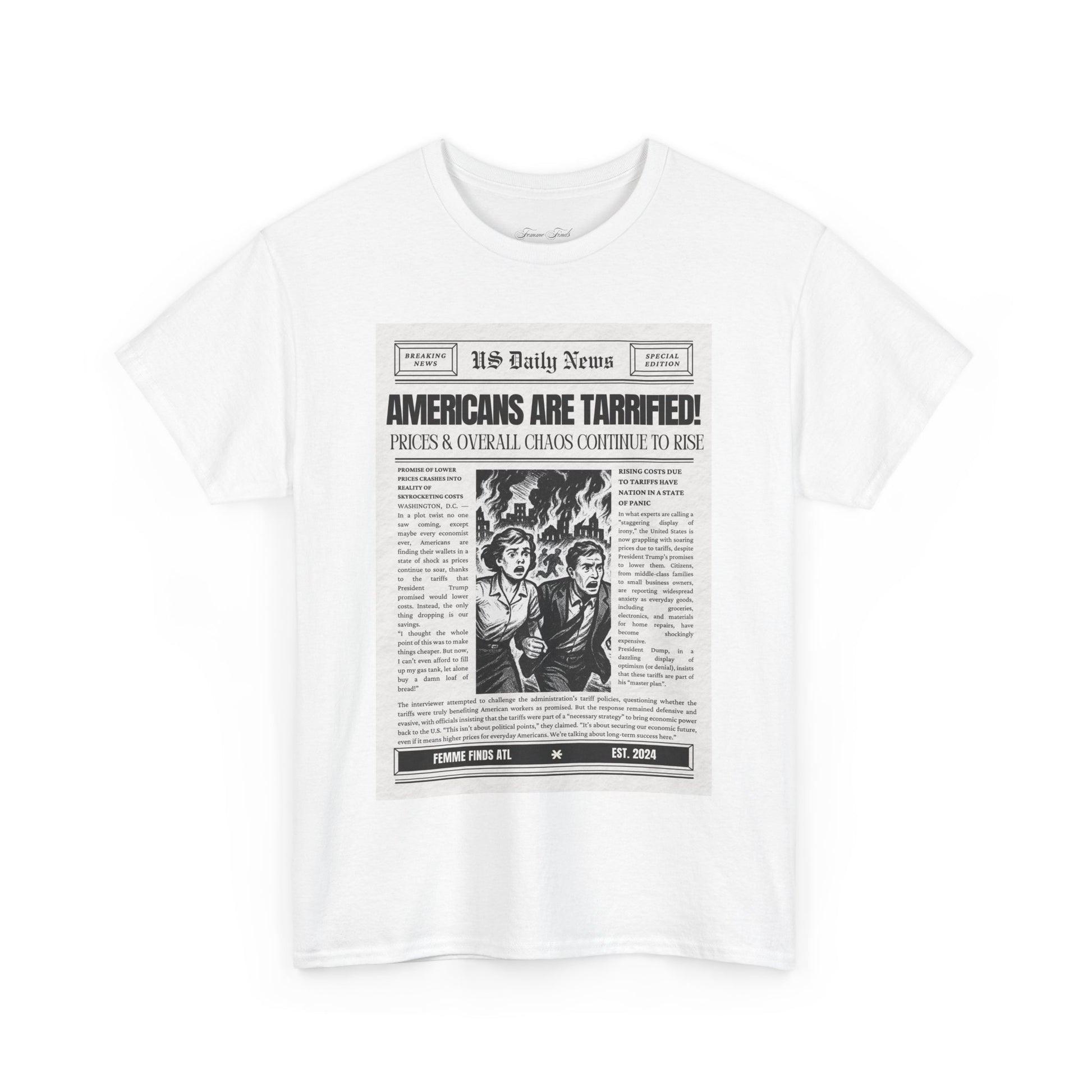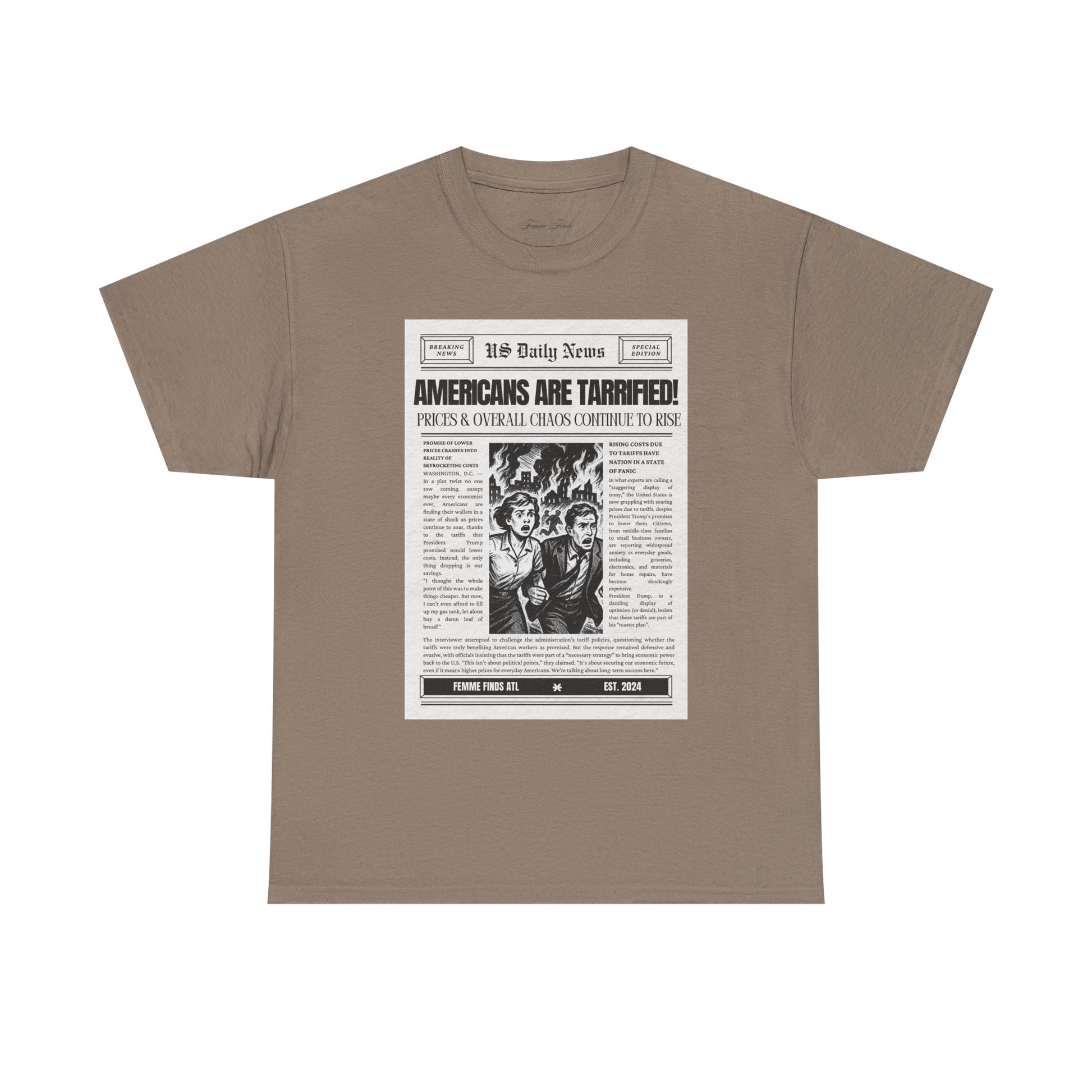Get ready to wear your sarcasm loud and clear with our "Americans Are TARRIFIED" T-shirt. This novelty tee features a bold, fake newspaper article that pokes fun at the economic fallout of tariffs and broken promises. With a clever and snarky headline, it captures the frustration many are feeling as prices rise and the promises of cheaper goods vanish.