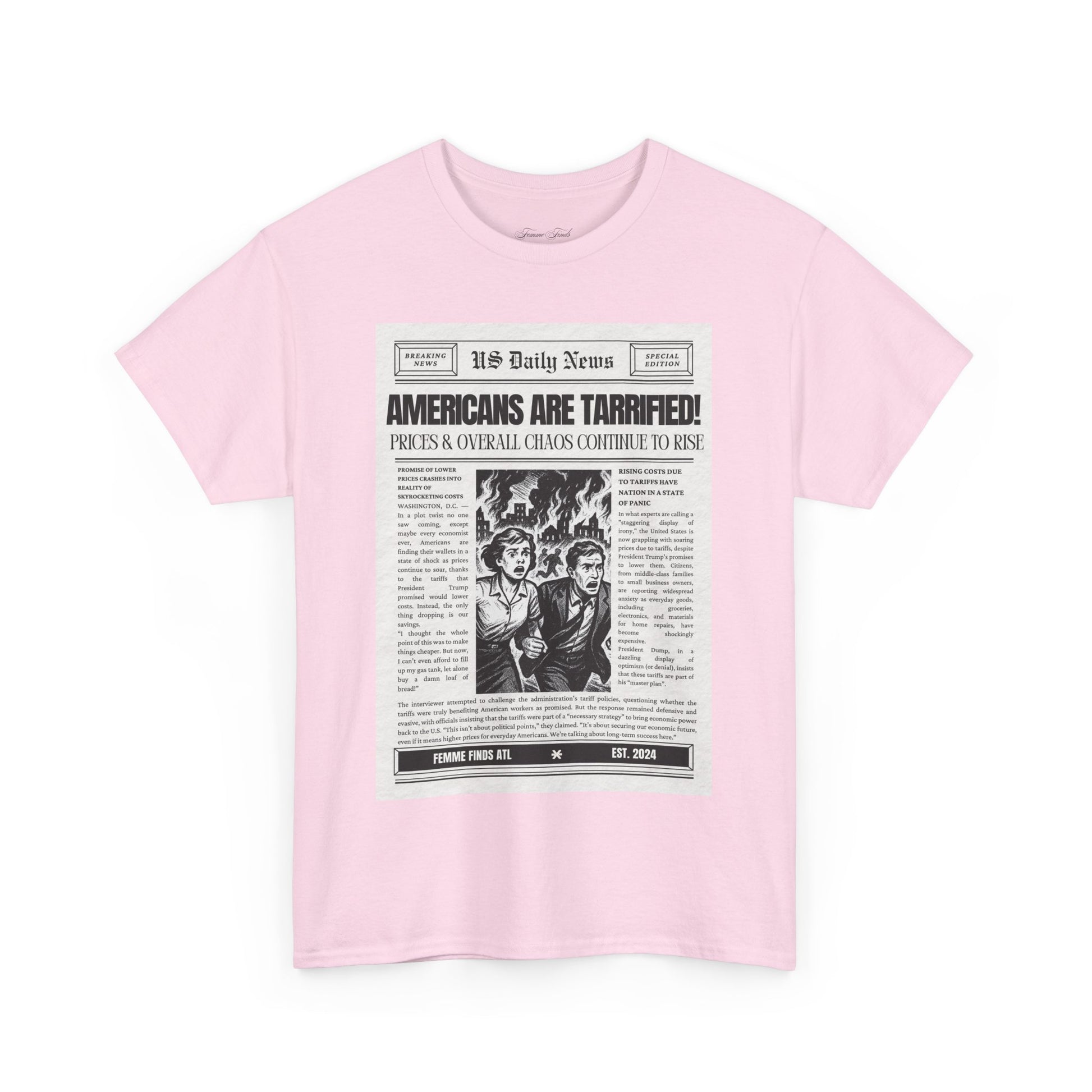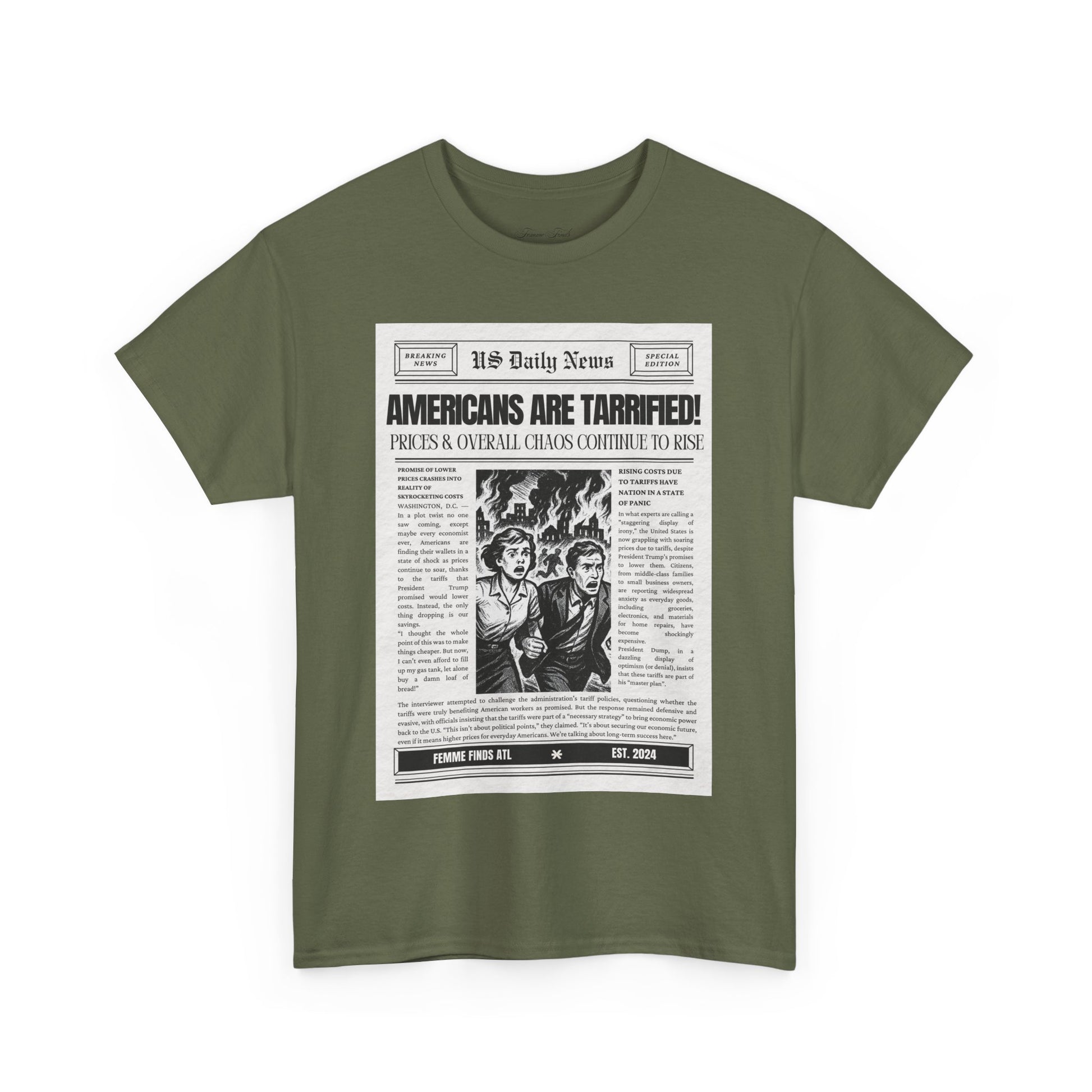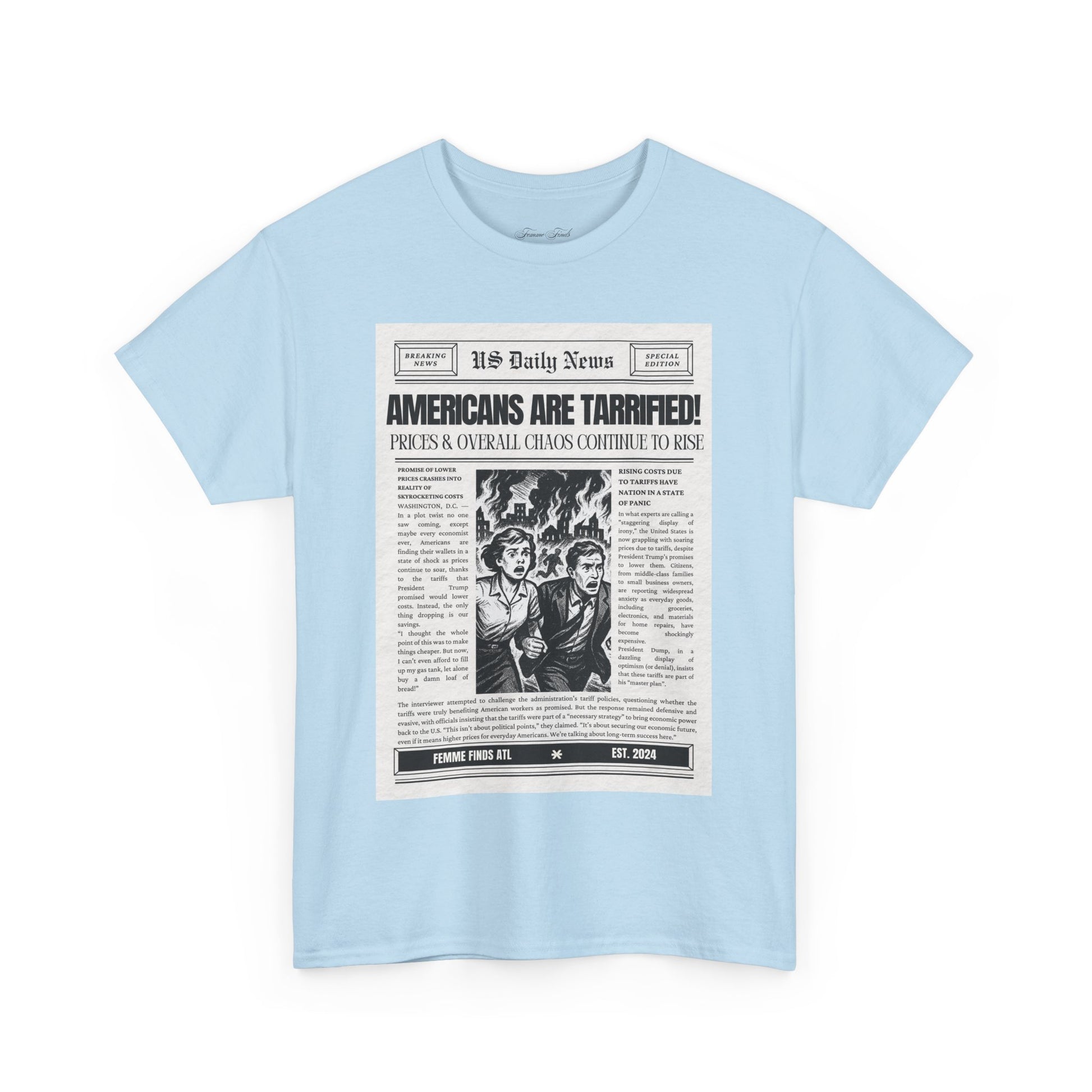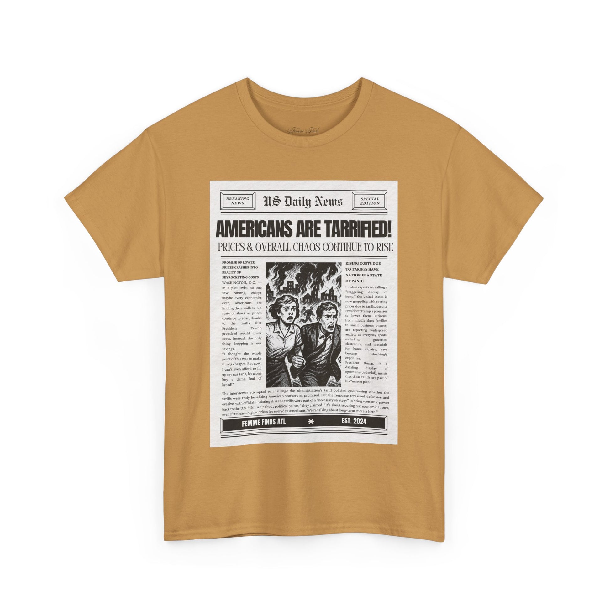 Get ready to wear your sarcasm loud and clear with our "Americans Are TARRIFIED" T-shirt. This novelty tee features a bold, fake newspaper article that pokes fun at the economic fallout of tariffs and broken promises. With a clever and snarky headline, it captures the frustration many are feeling as prices rise and the promises of cheaper goods vanish.
