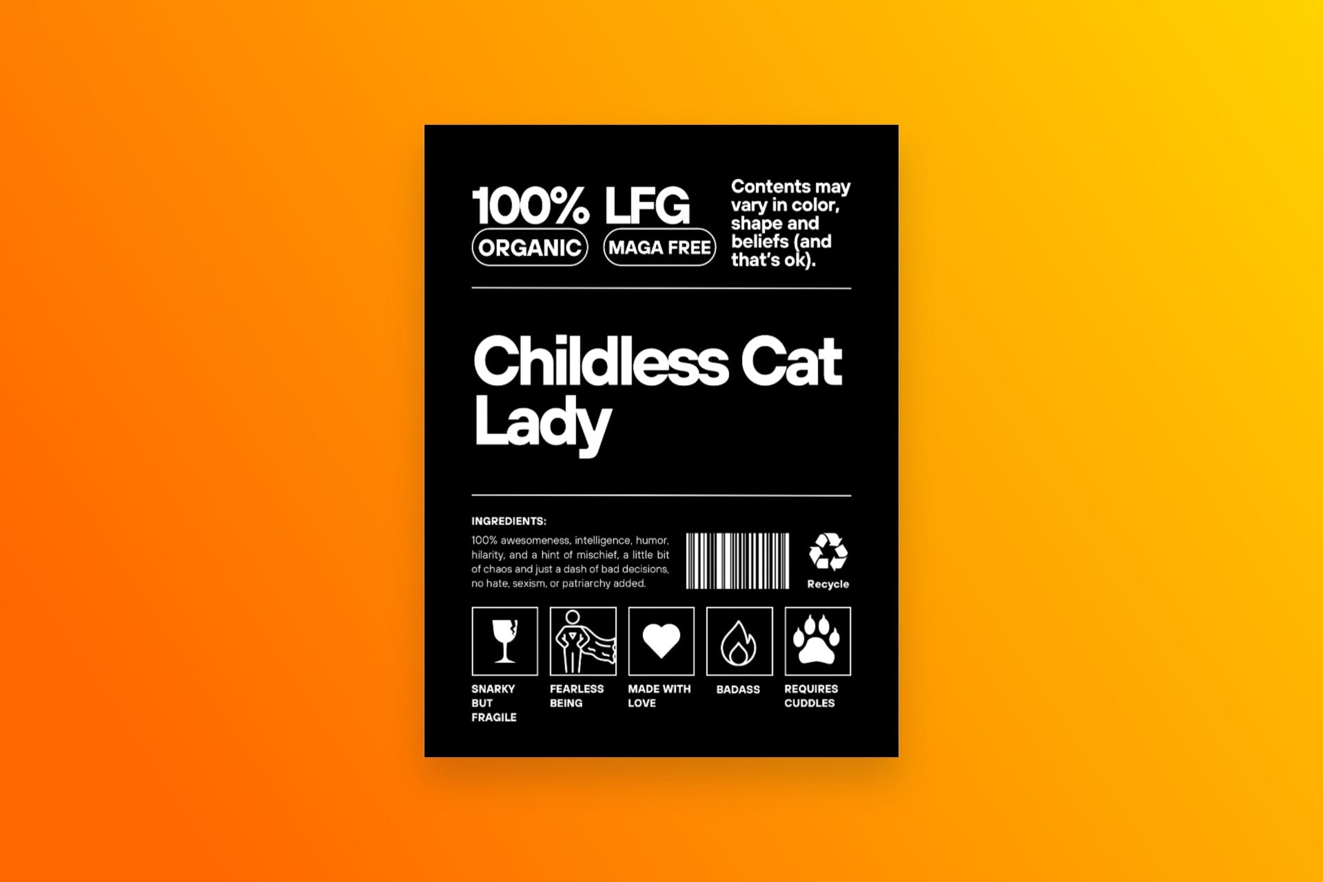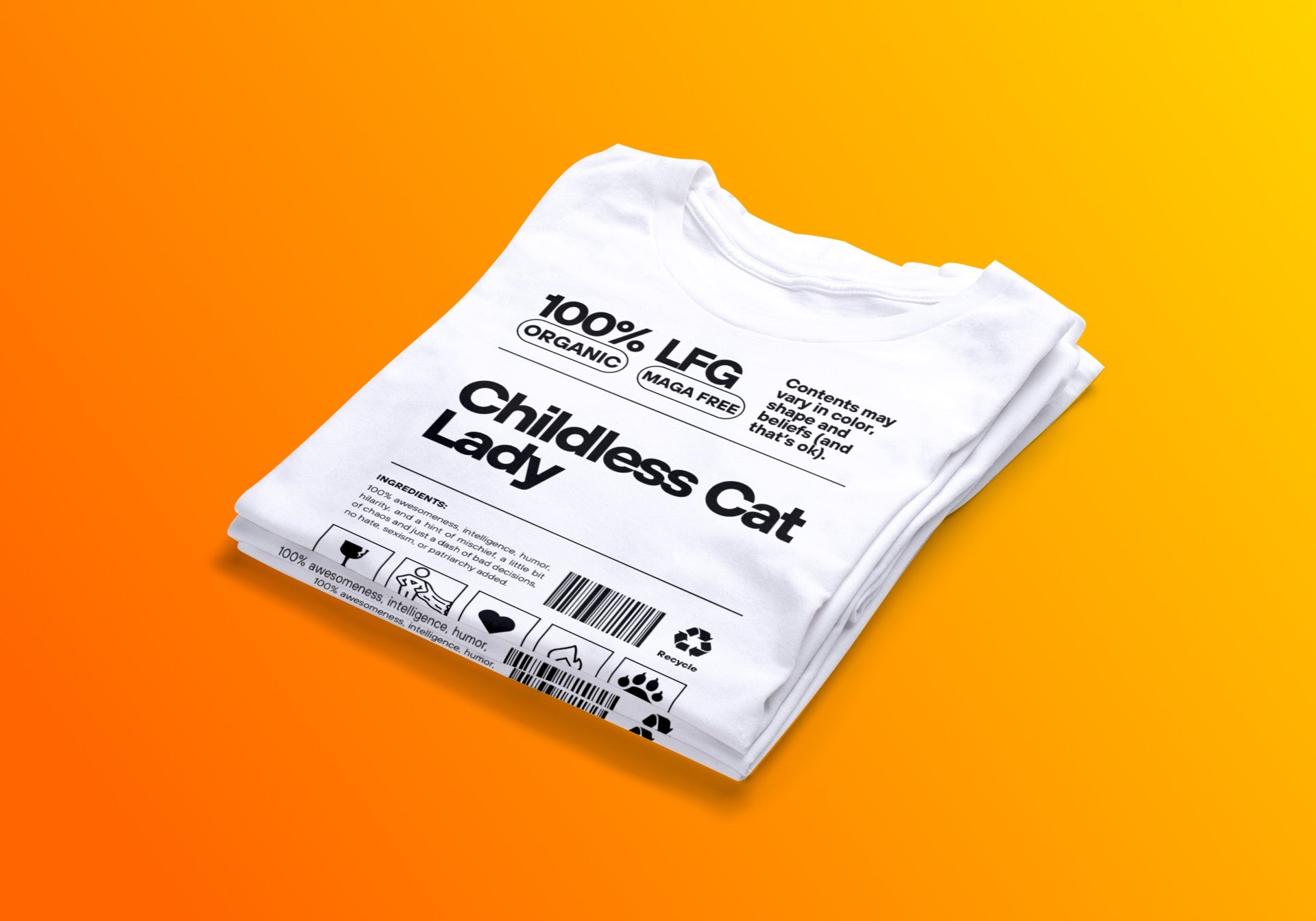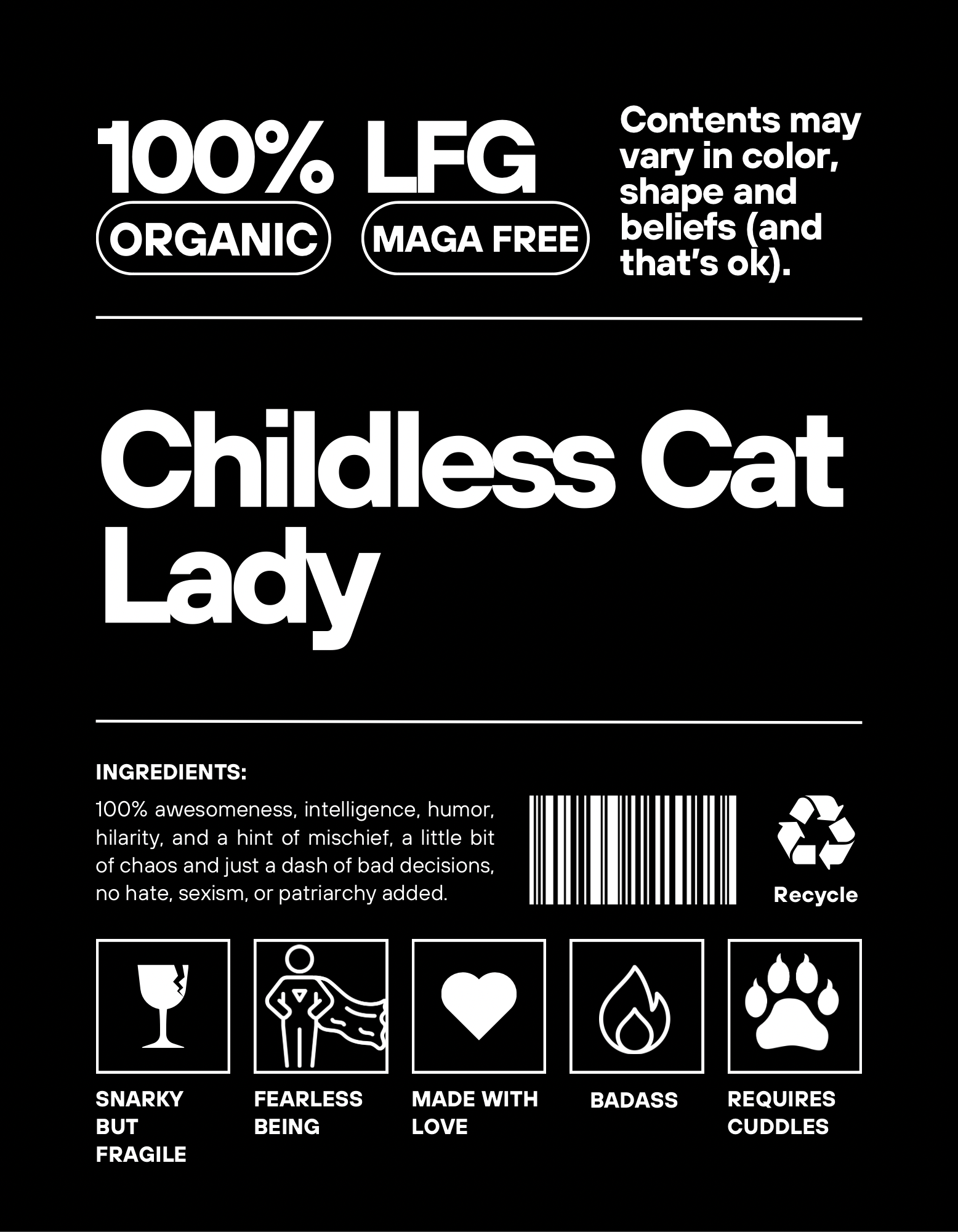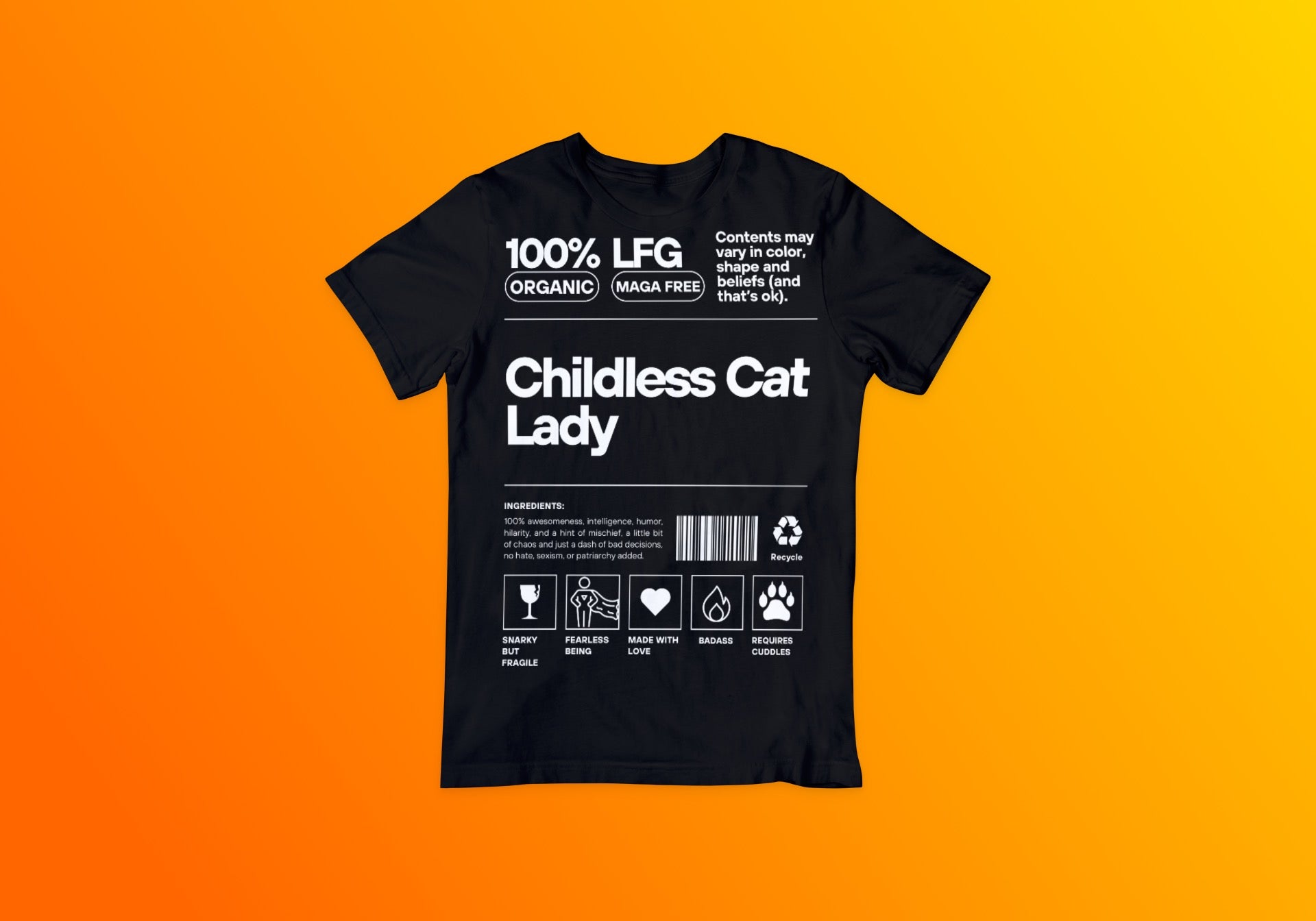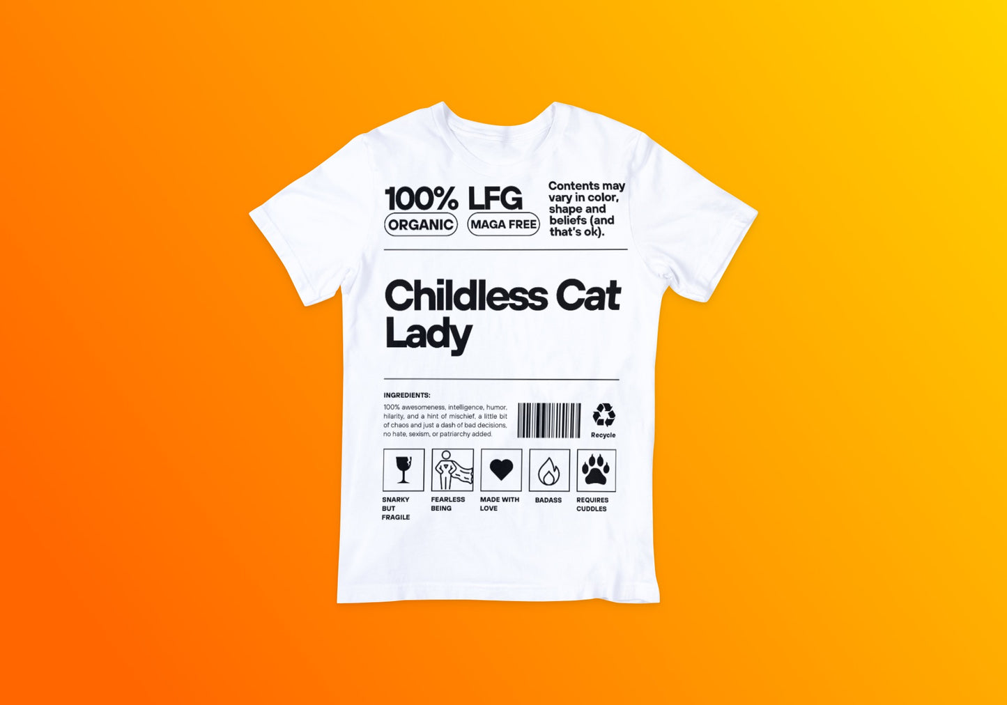 Introducing the "Childless Cat Lady Label Tee"—the ultimate statement piece for the modern, confident individual who embraces life with a blend of humor and charm. Crafted to mimic a product label, this T-shirt features a playful ingredients list that reads: