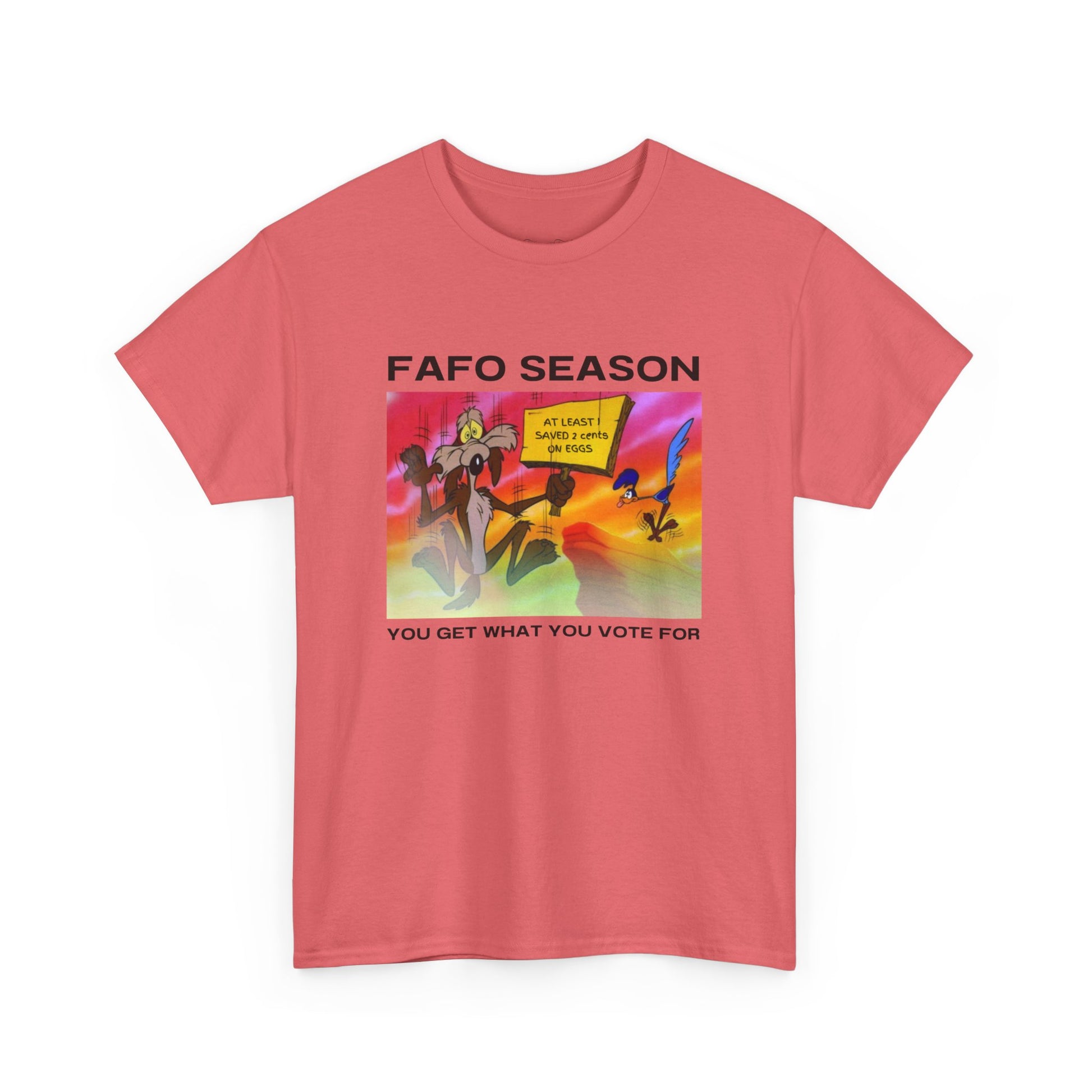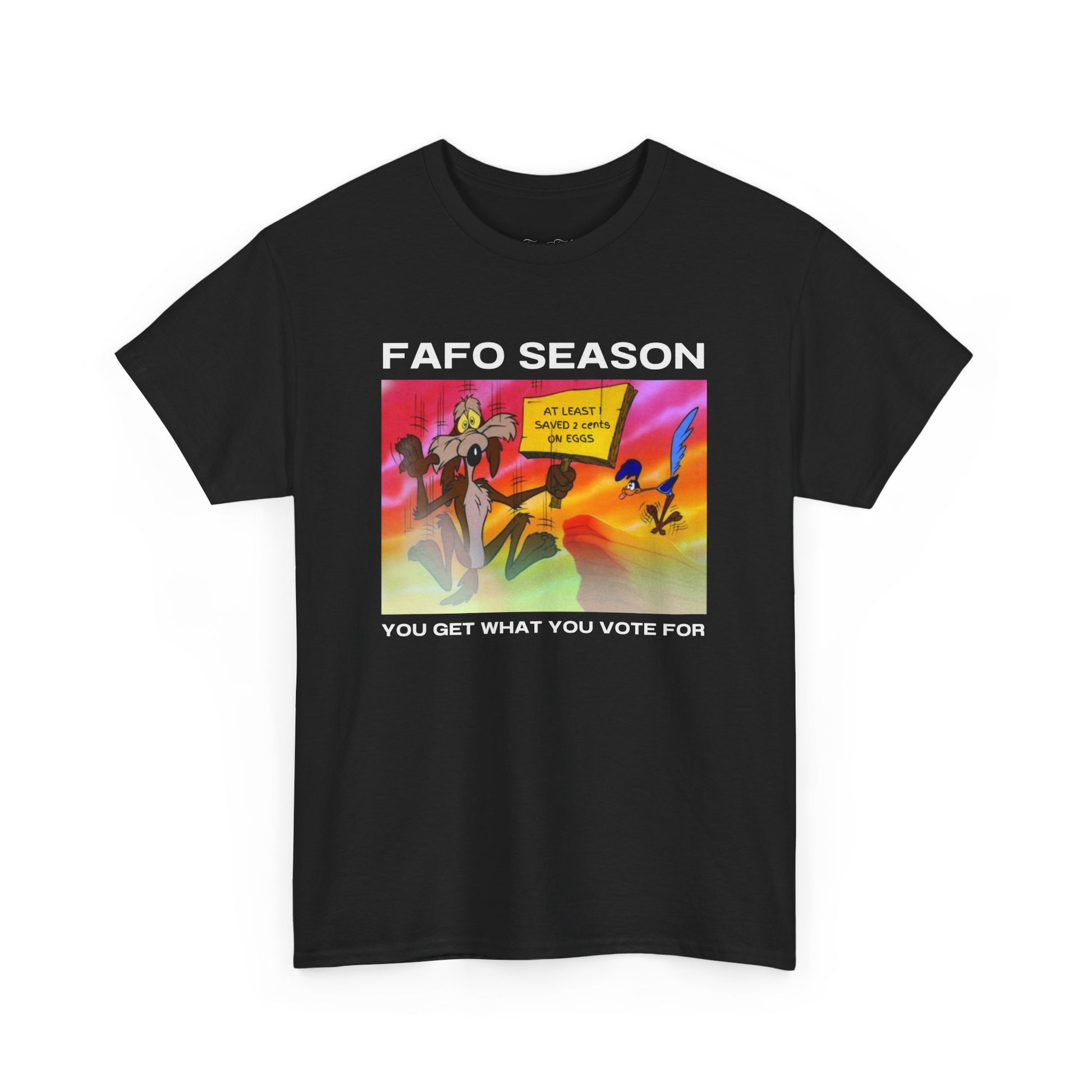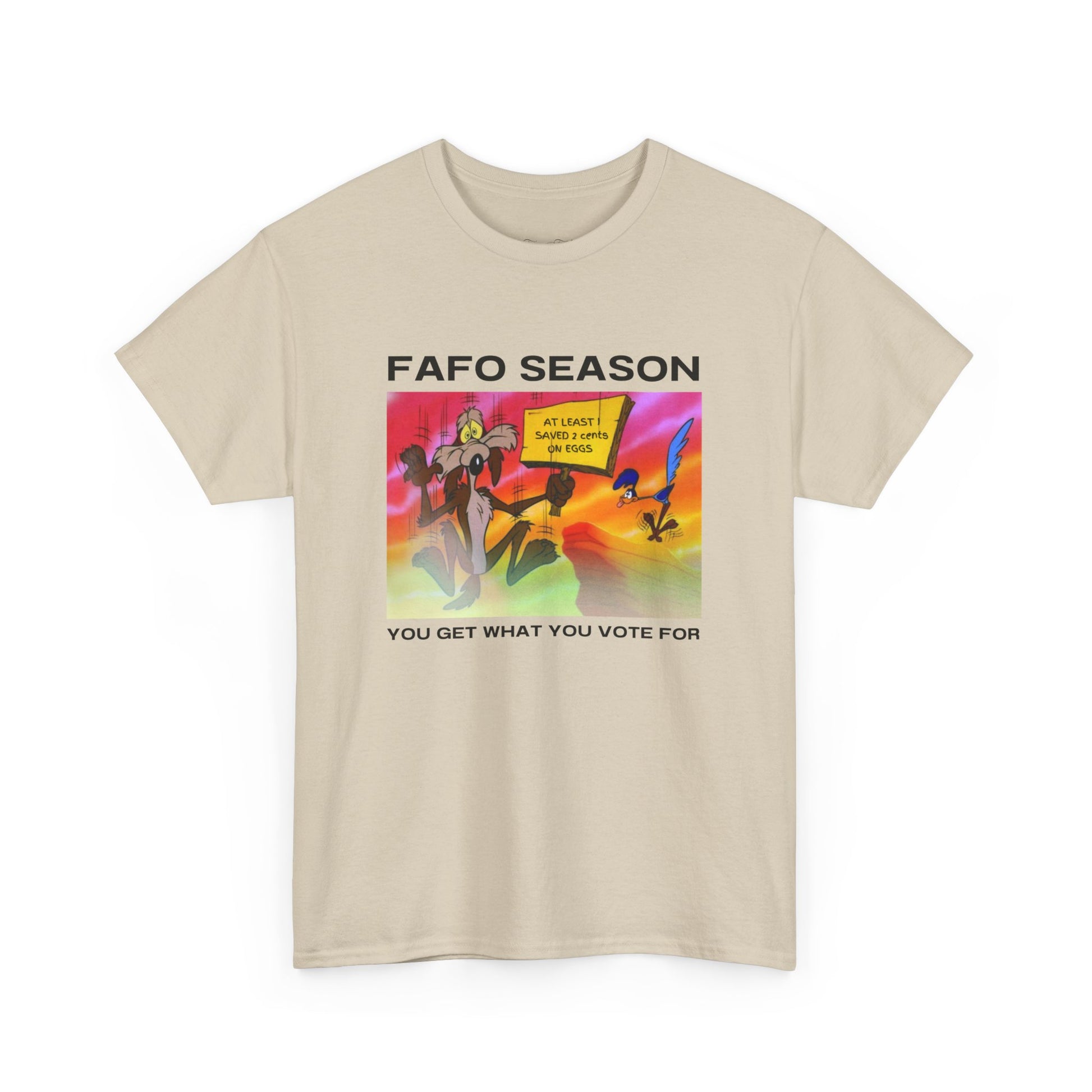 Make a bold statement with our "FAFO Season" T-shirt, featuring custom artwork inspired by the iconic Wile E. Coyote and Roadrunner dynamic. This design hilariously captures the message of "Fuck Around and Find Out," with the coyote holding a sign that reads, "At least I saved 2 cents on eggs." It's a biting commentary on those who voted for *HIM* and are now falling victim to their own antics, much like the coyote who always ends up outsmarted by his own schemes.