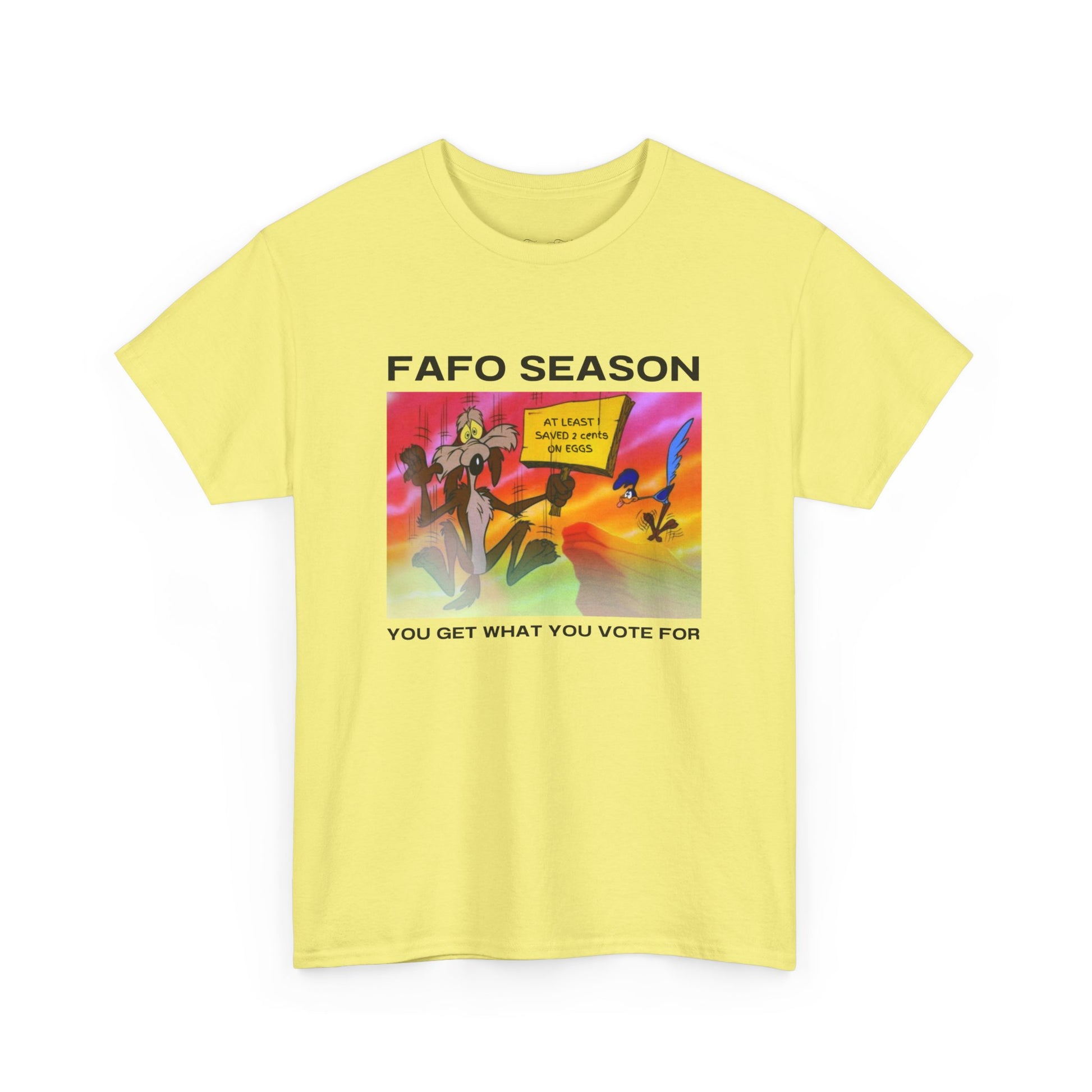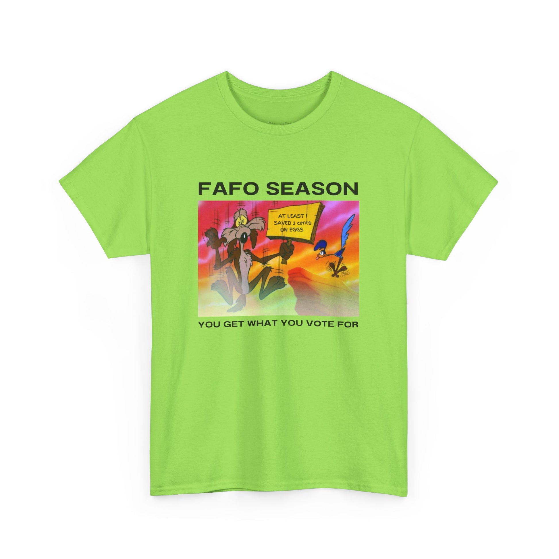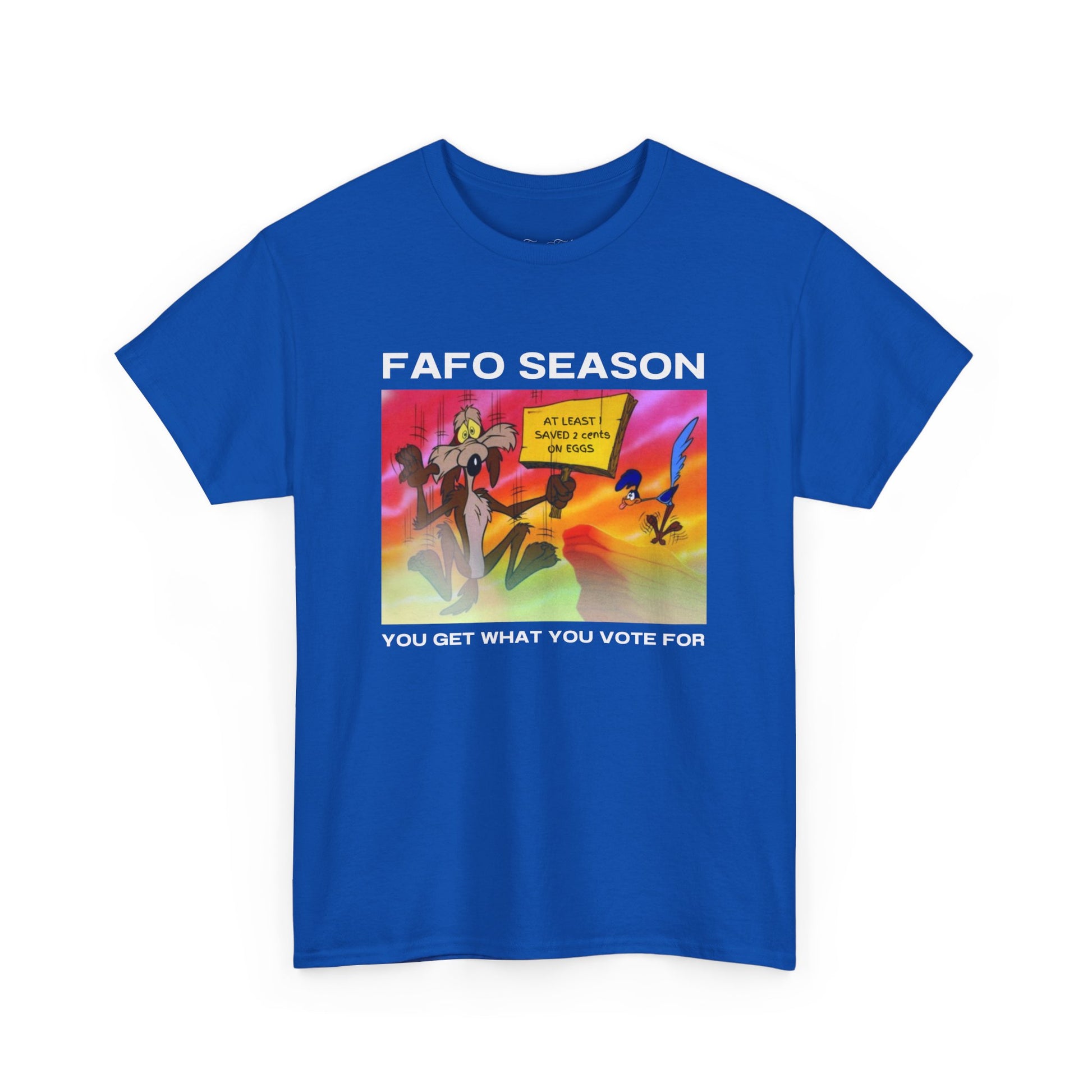 Make a bold statement with our "FAFO Season" T-shirt, featuring custom artwork inspired by the iconic Wile E. Coyote and Roadrunner dynamic. This design hilariously captures the message of "Fuck Around and Find Out," with the coyote holding a sign that reads, "At least I saved 2 cents on eggs." It's a biting commentary on those who voted for *HIM* and are now falling victim to their own antics, much like the coyote who always ends up outsmarted by his own schemes.