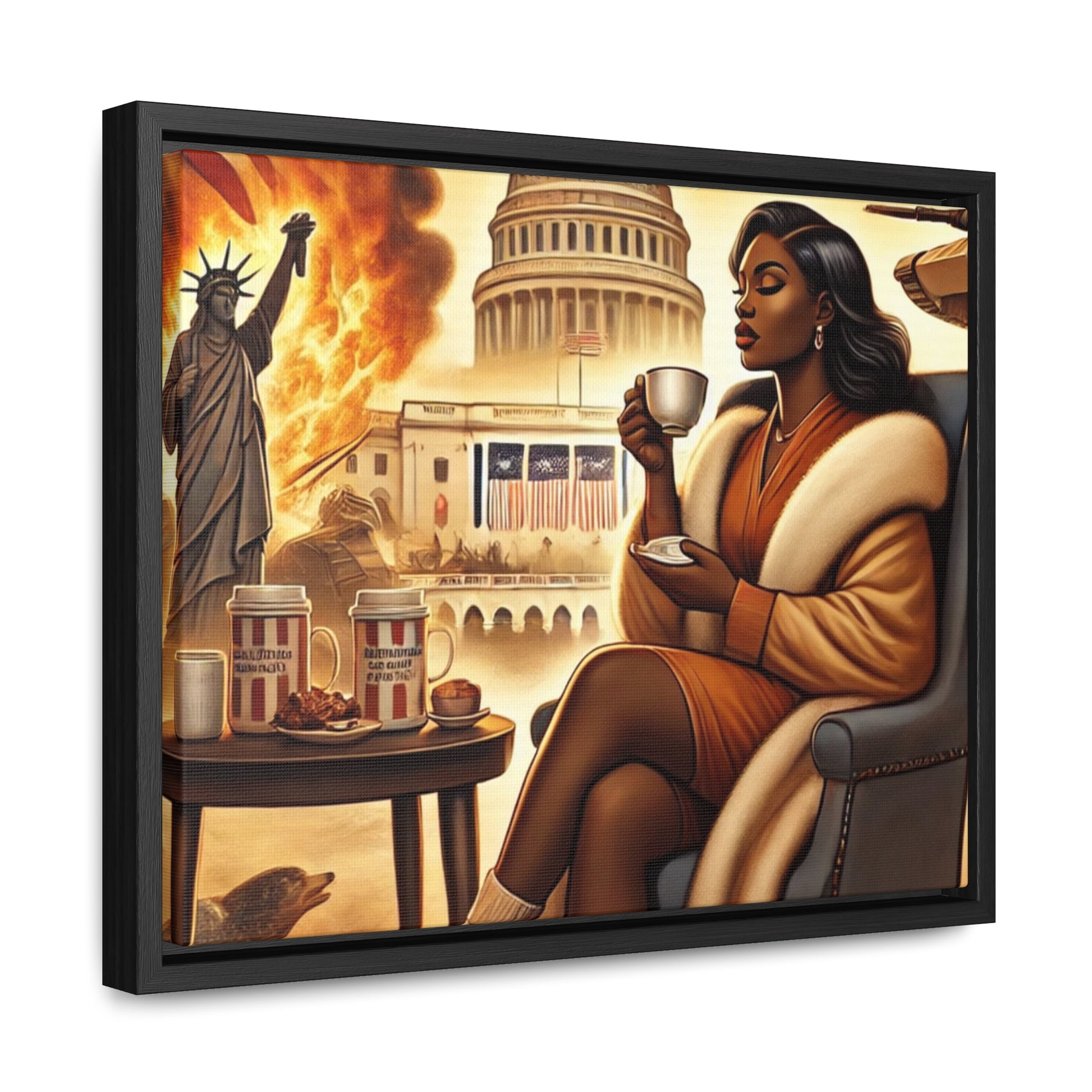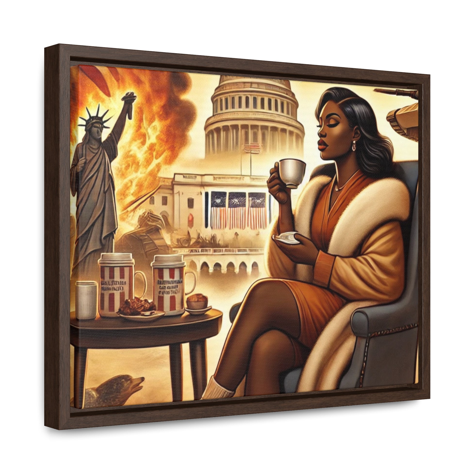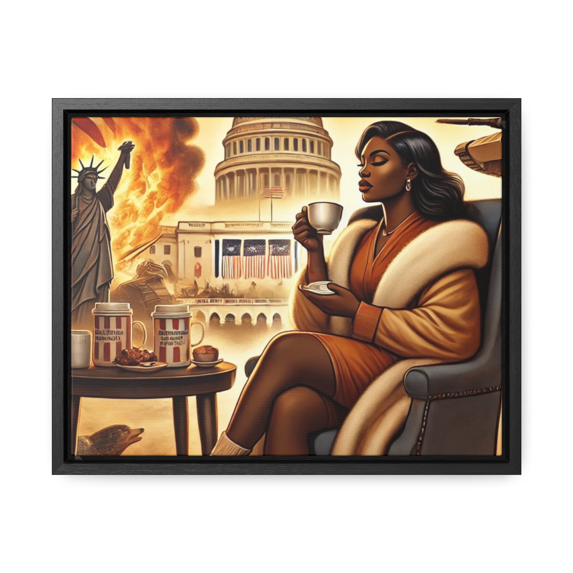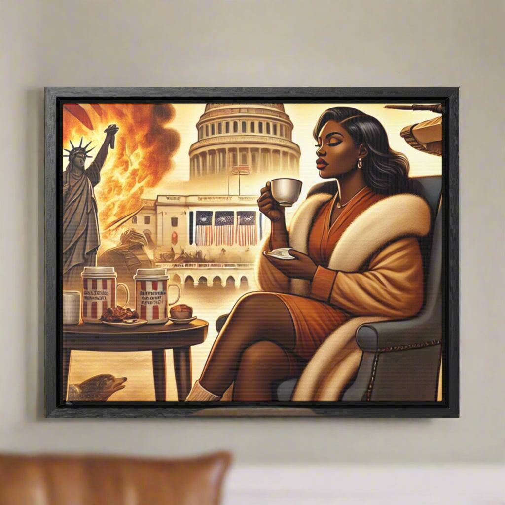 Celebrate resilience, self-care, and the unshakable strength of Black women with Grace Amid Chaos. This stunning framed canvas art captures a powerful moment of serenity as a Black woman sits composed, sipping tea amidst a backdrop of unrest. Inspired by the courage of Black women who chose themselves and prioritized peace in the wake of the 2024 presidential election, this piece is a testament to grace in the face of adversity.
