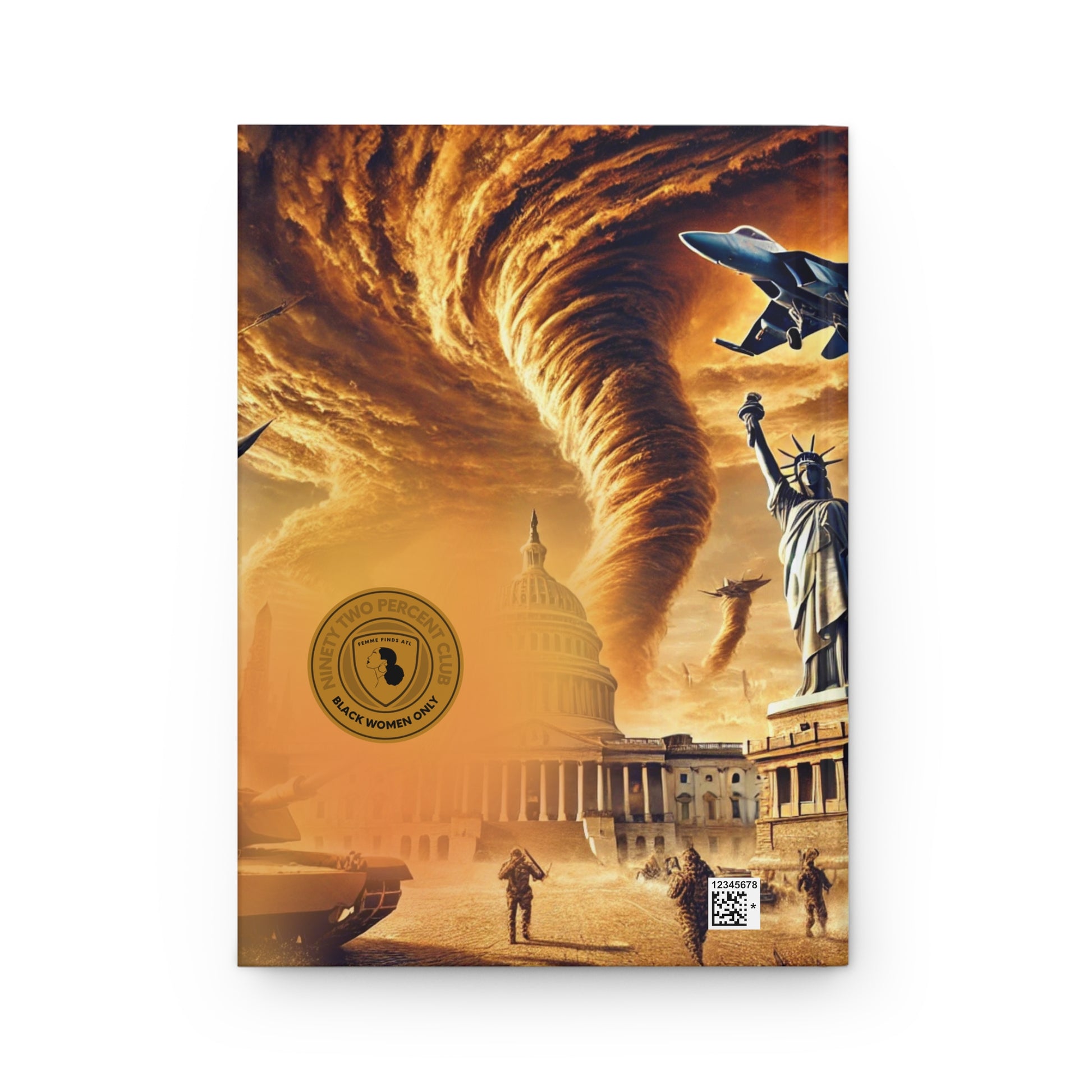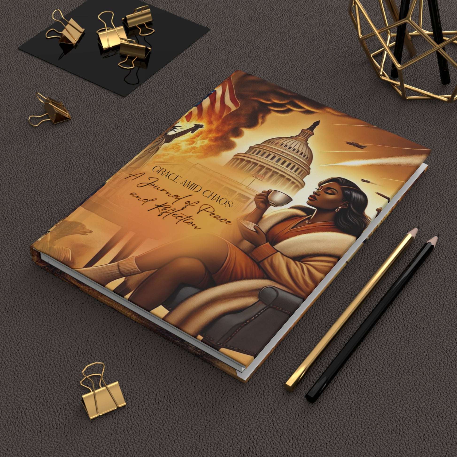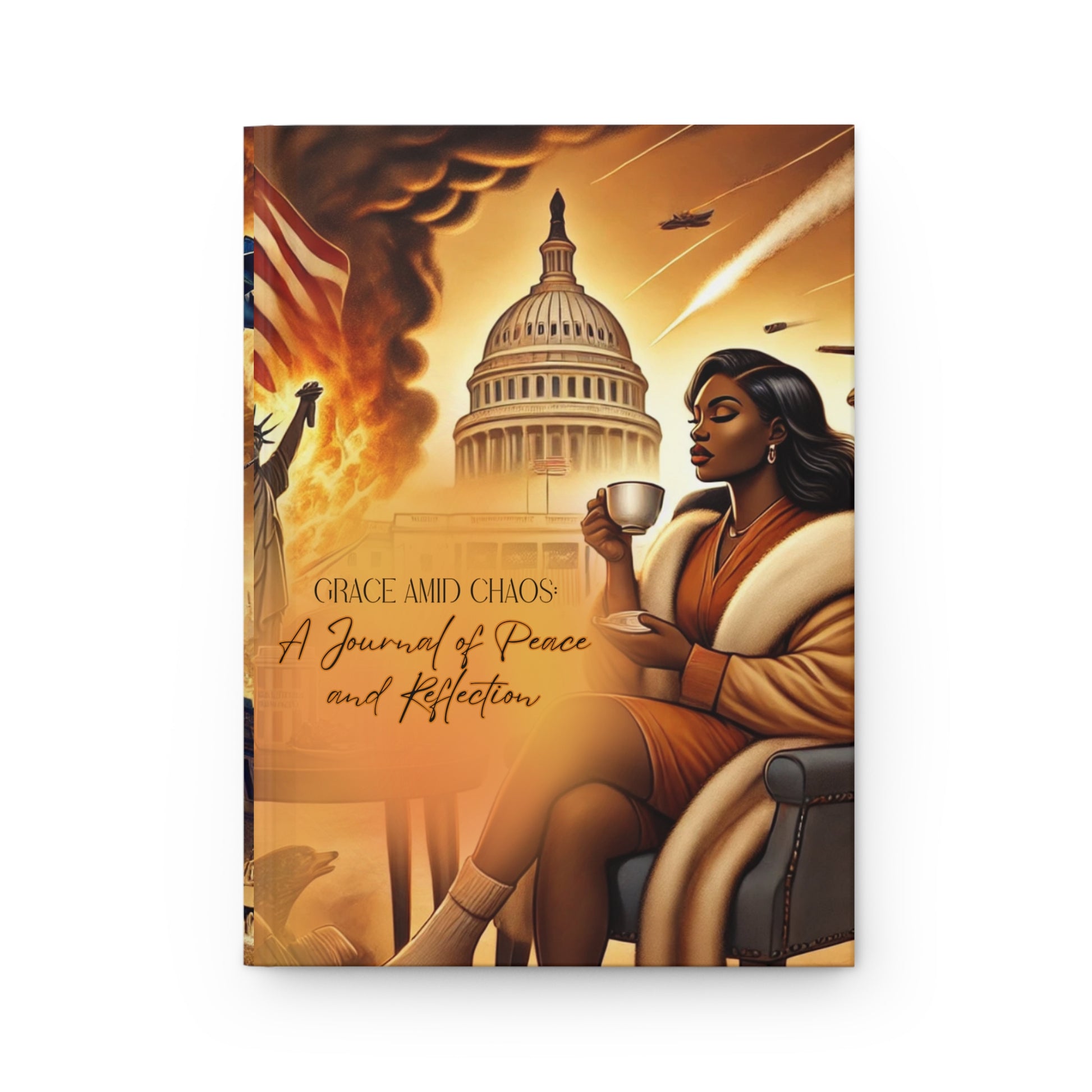 The journal's cover art depicts a serene Black woman sipping tea amid a backdrop of chaos, symbolizing the intentional choice of peace and reflection in tumultuous times. The golden-orange hues radiate hope, resilience, and the unshakable spirit of Black women who continue to shape the narrative and push for change.