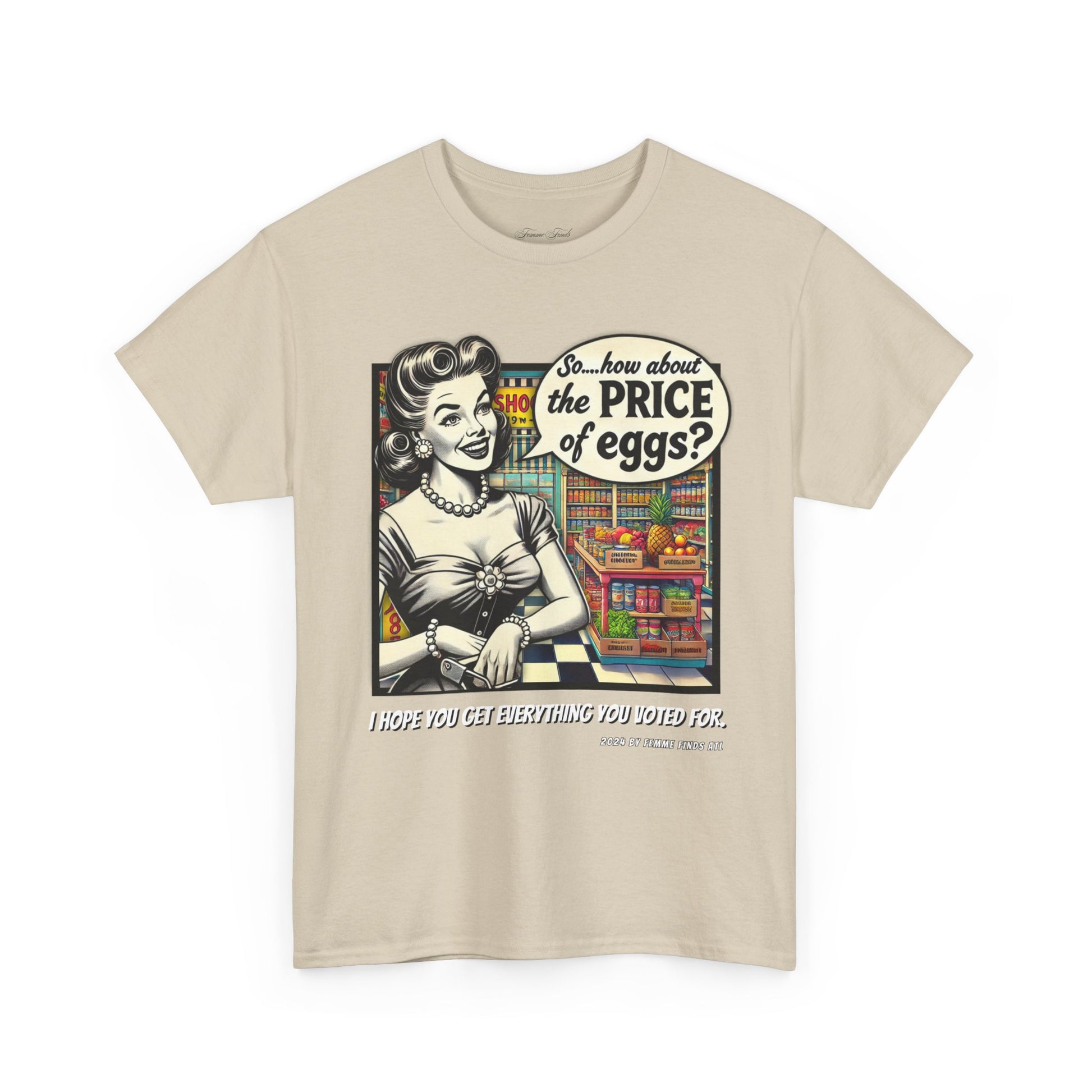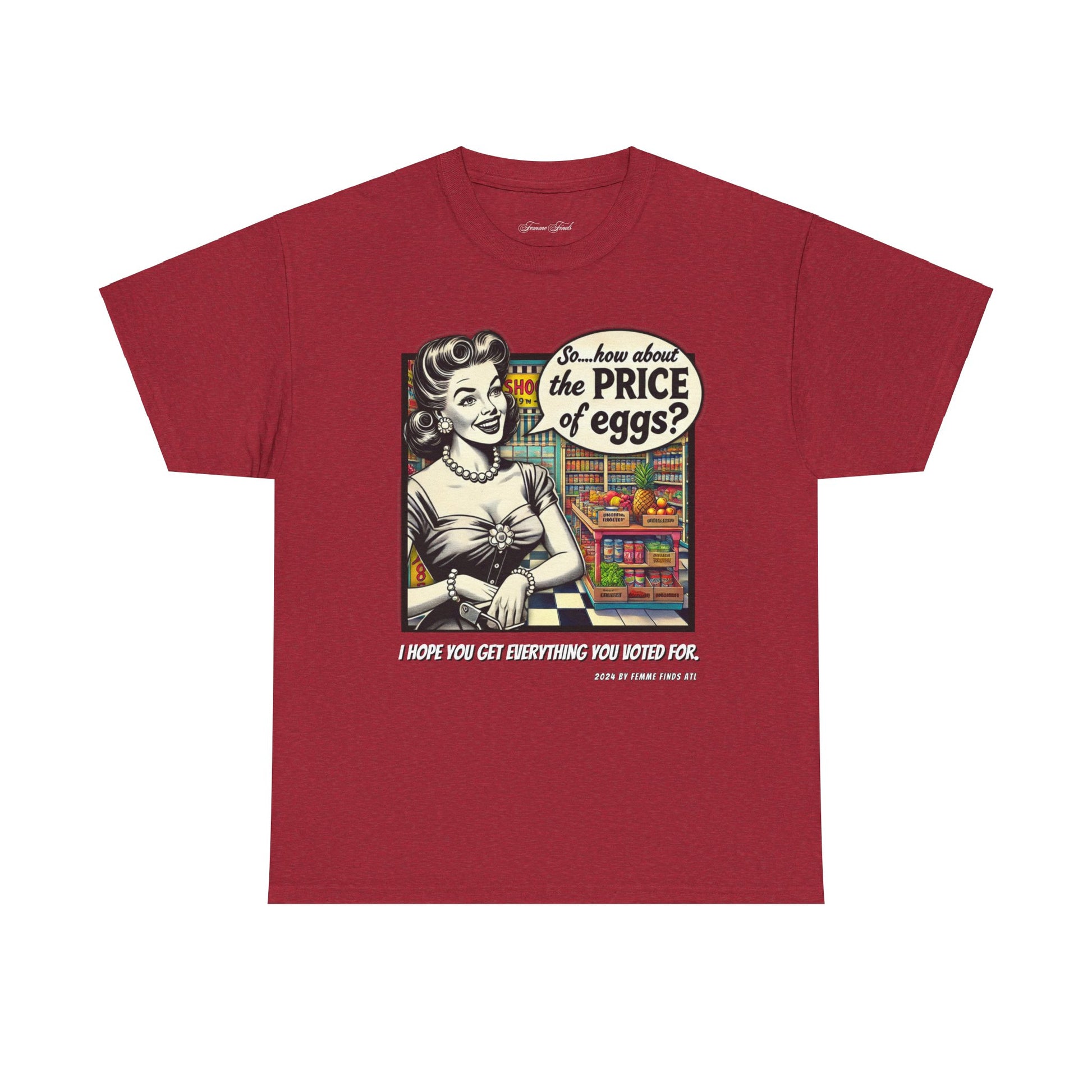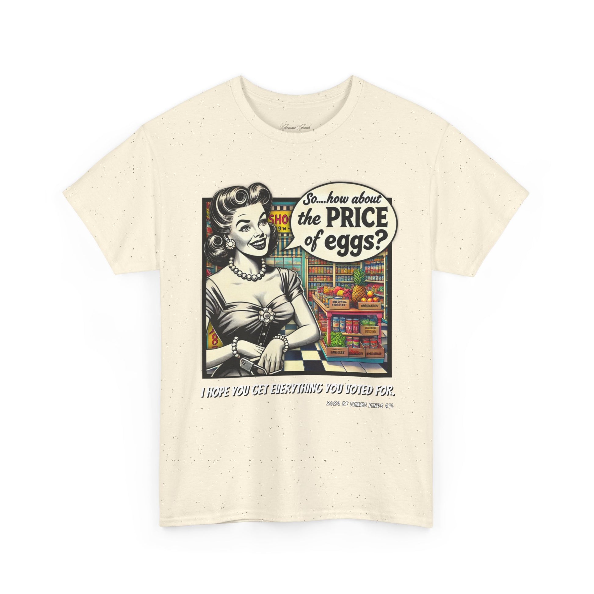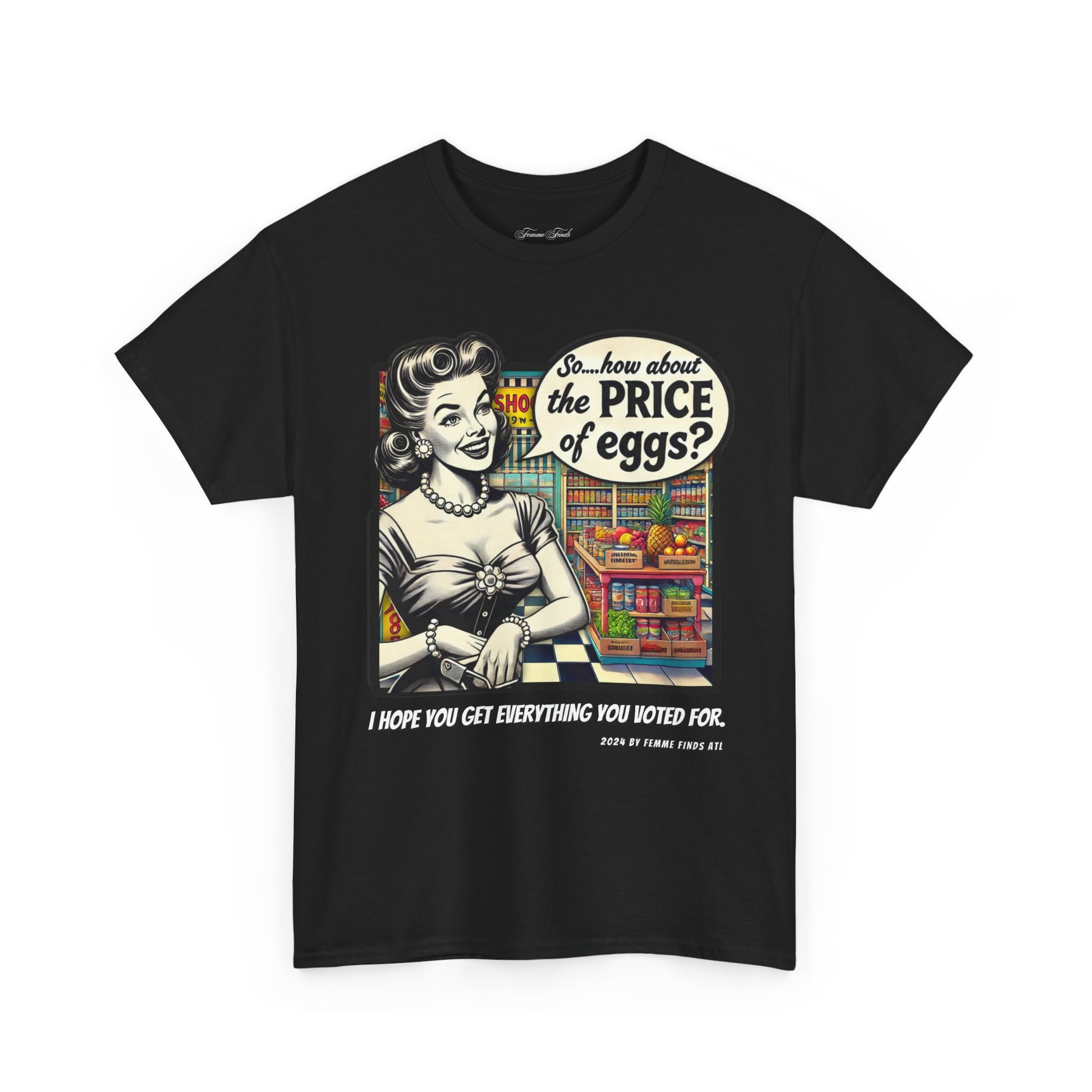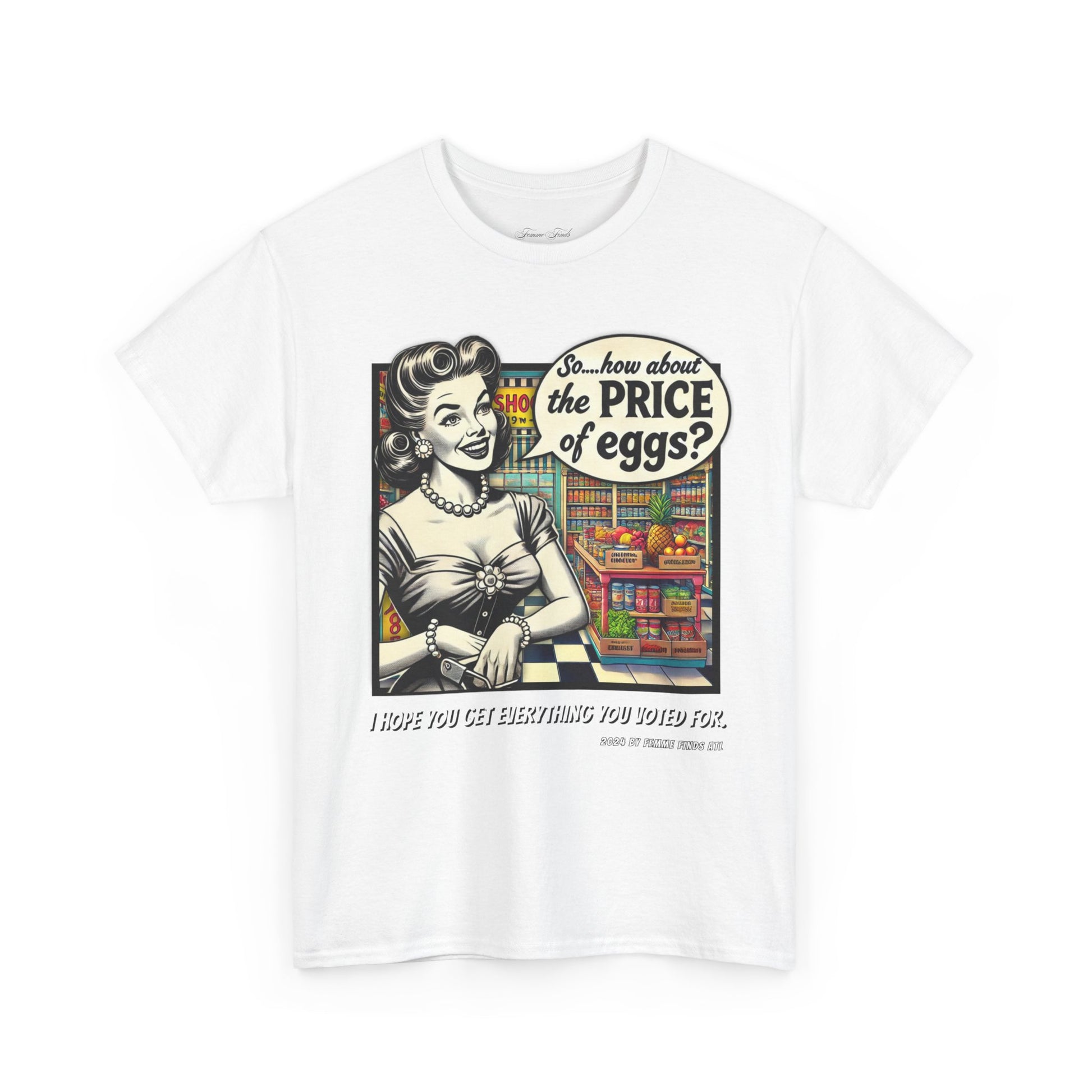 Serve up a bold dose of satire with this vintage-inspired T-shirt featuring a 1950s-style cartoon of a housewife in a grocery store, pondering the skyrocketing cost of eggs. But don't let the nostalgic charm fool you—this shirt pulls no punches. It's a witty and biting commentary on the aftermath of promises broken by Trump, who claimed he would lower grocery prices only to reveal post-election that it was never in the cards.