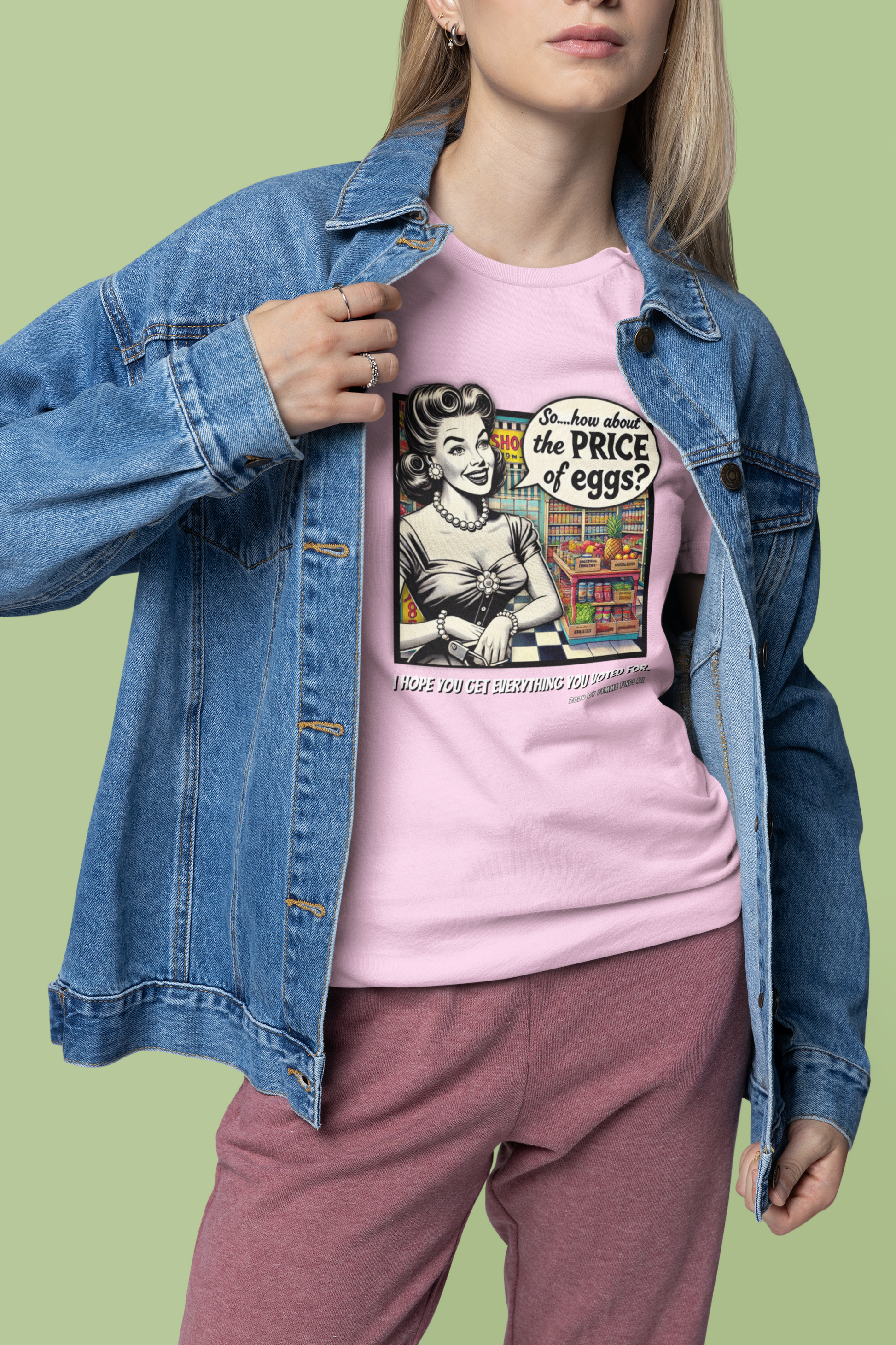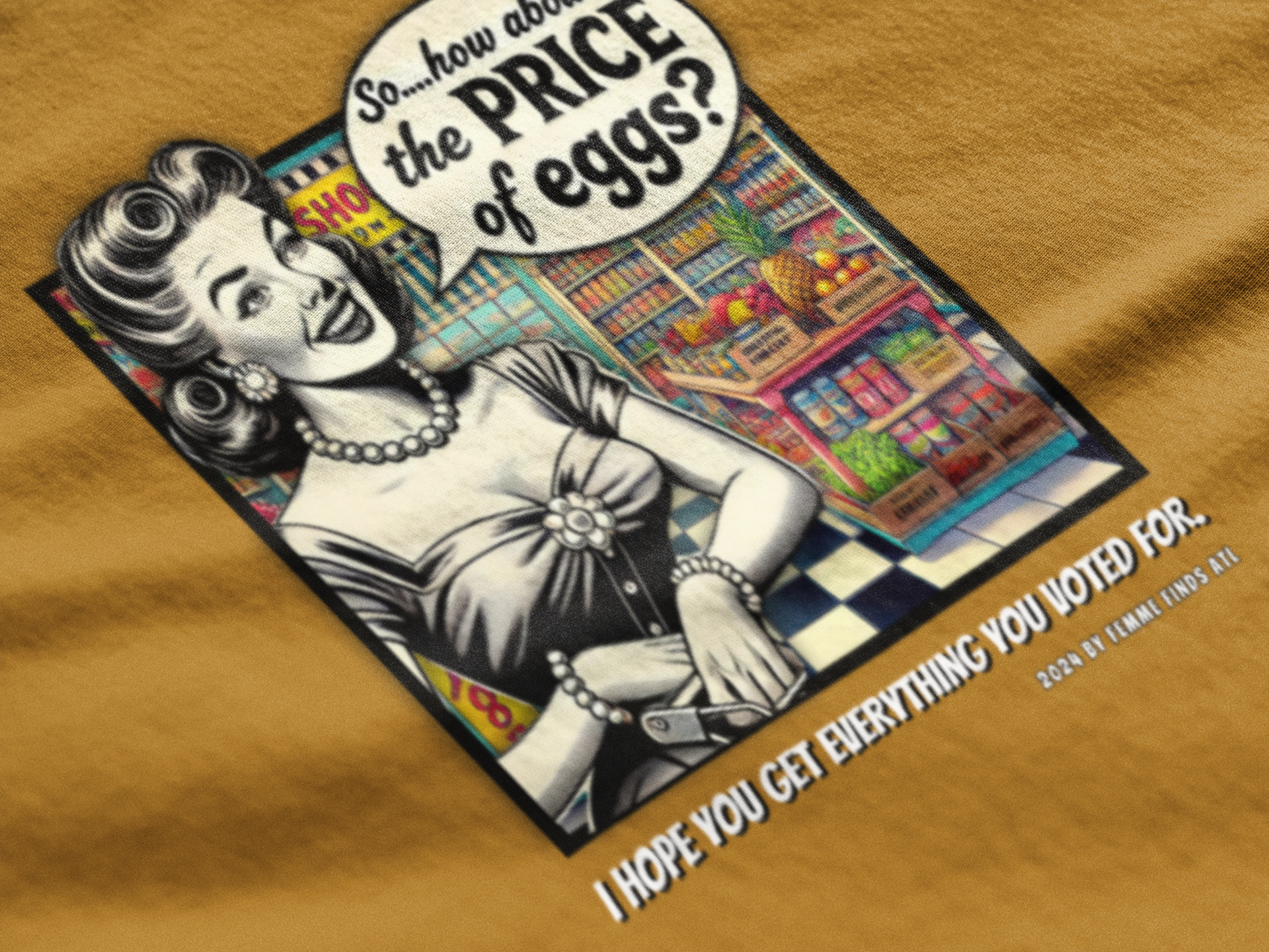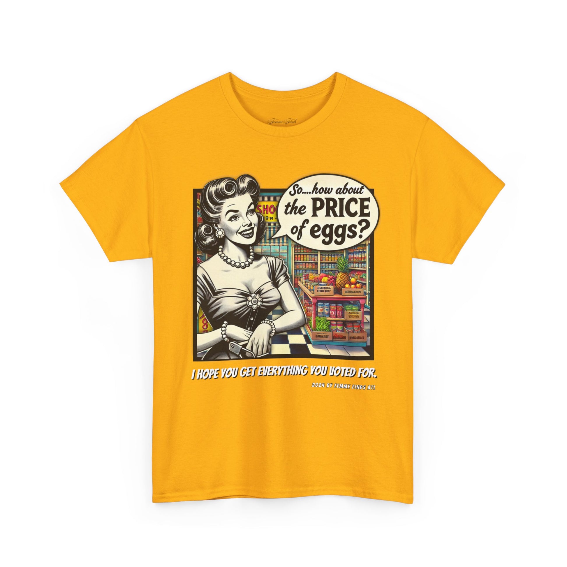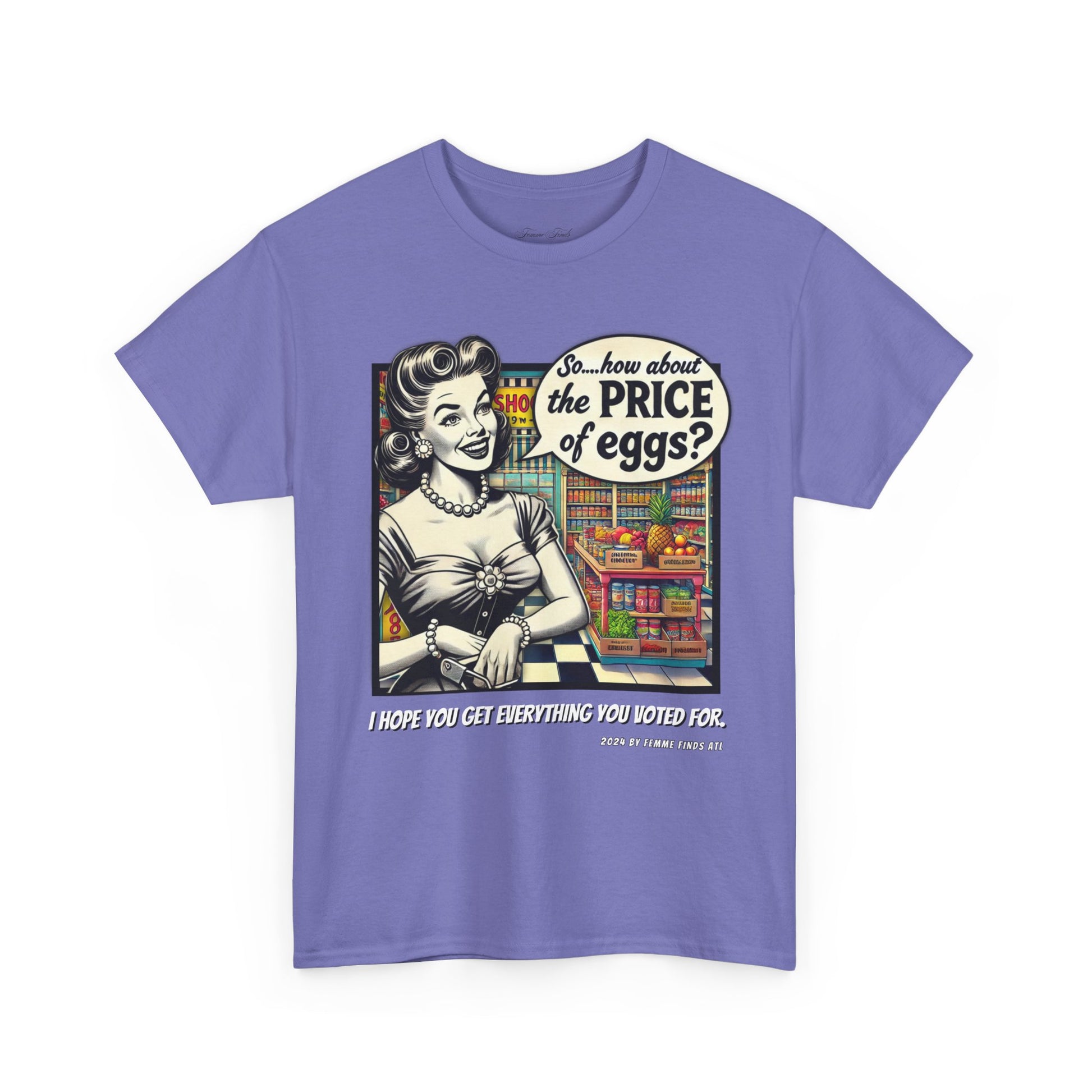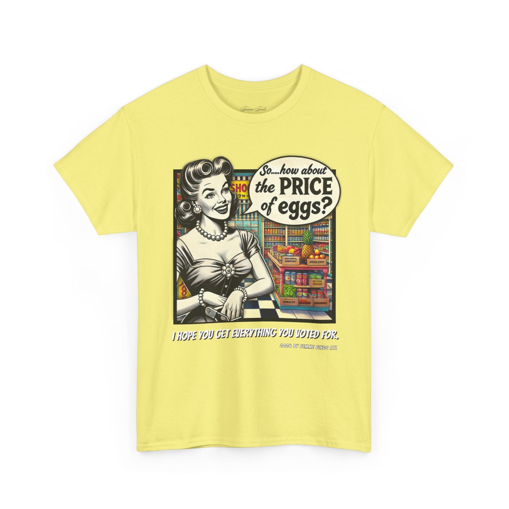 Serve up a bold dose of satire with this vintage-inspired T-shirt featuring a 1950s-style cartoon of a housewife in a grocery store, pondering the skyrocketing cost of eggs. But don't let the nostalgic charm fool you—this shirt pulls no punches. It's a witty and biting commentary on the aftermath of promises broken by Trump, who claimed he would lower grocery prices only to reveal post-election that it was never in the cards.