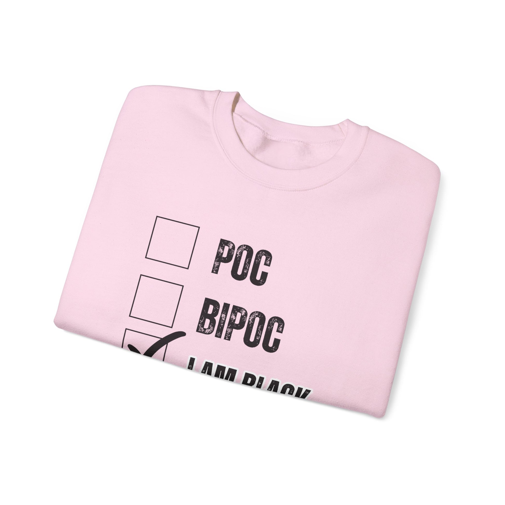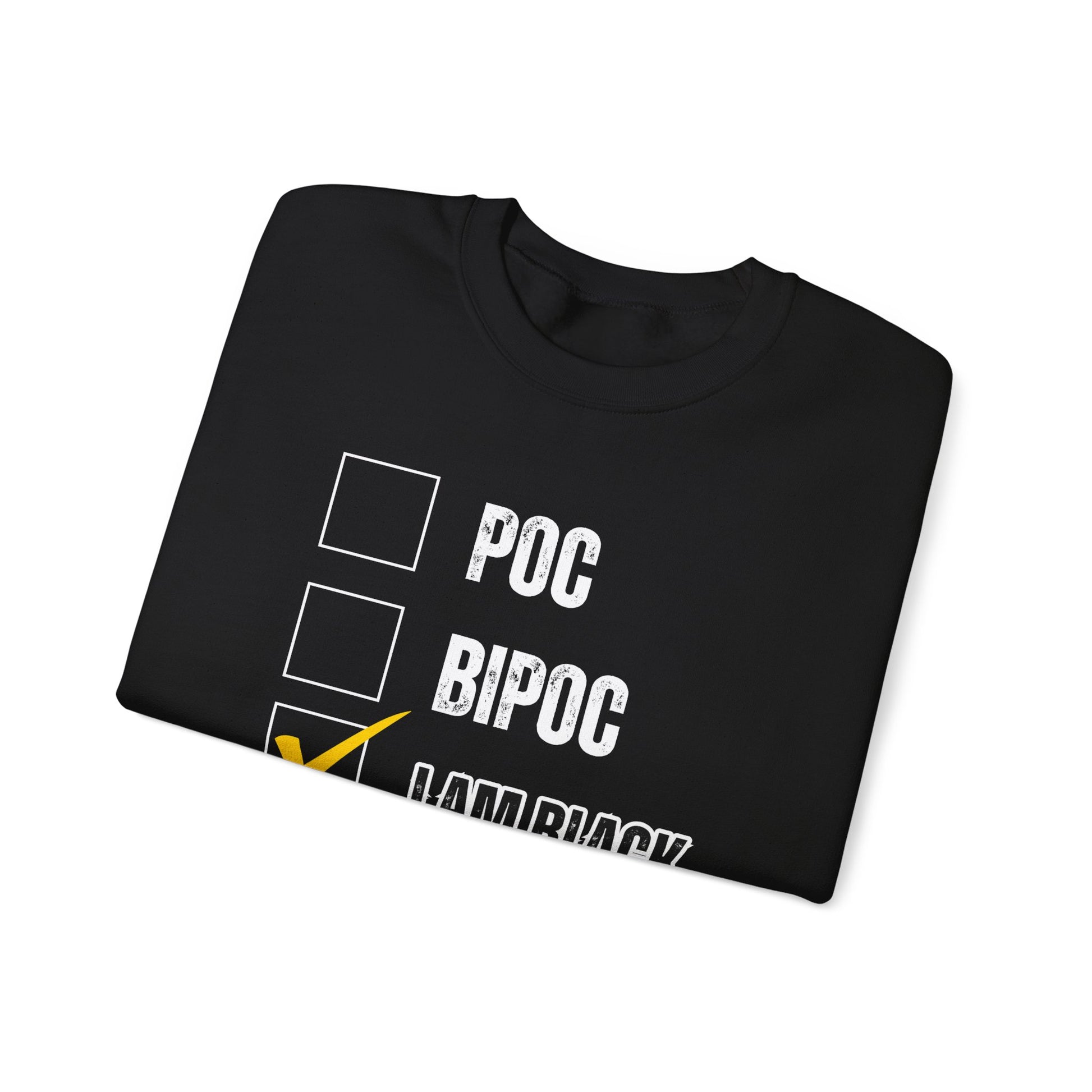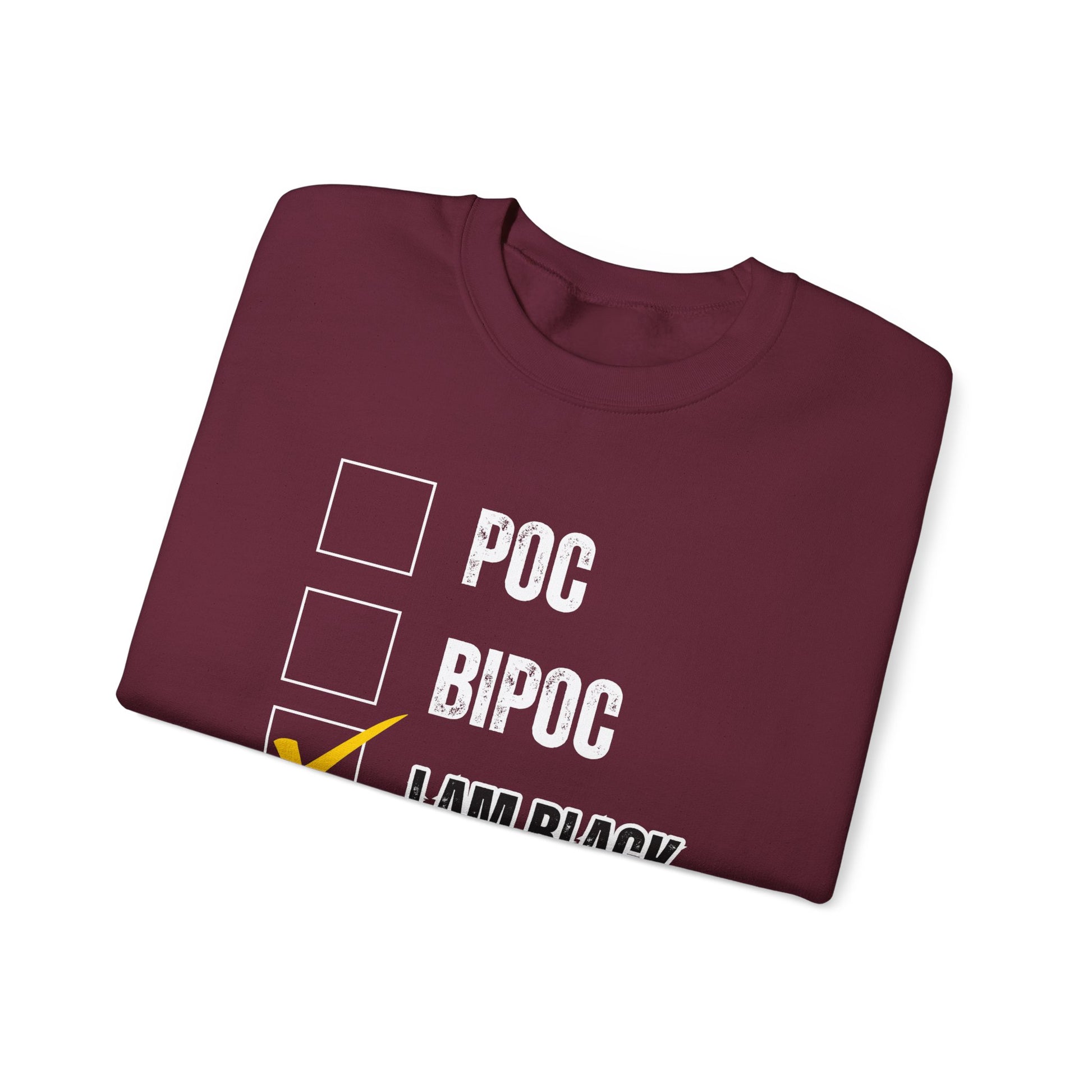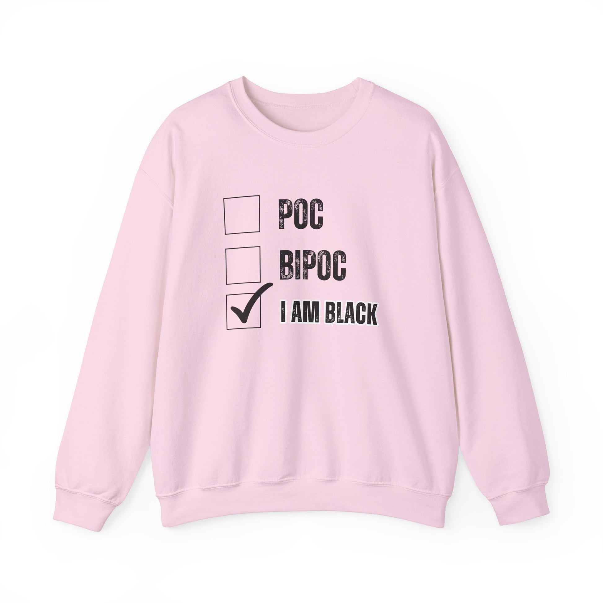 Unisex crewneck sweatshirt with the bold statement, "I Am Black." This sweatshirt is designed for those who proudly embrace their culture and make a statement about the lack of support they feel in society. Featuring checkboxes for "POC" and "BIPOC," with the box next to "I Am Black" checked, it leaves no doubt about where the wearer stands.