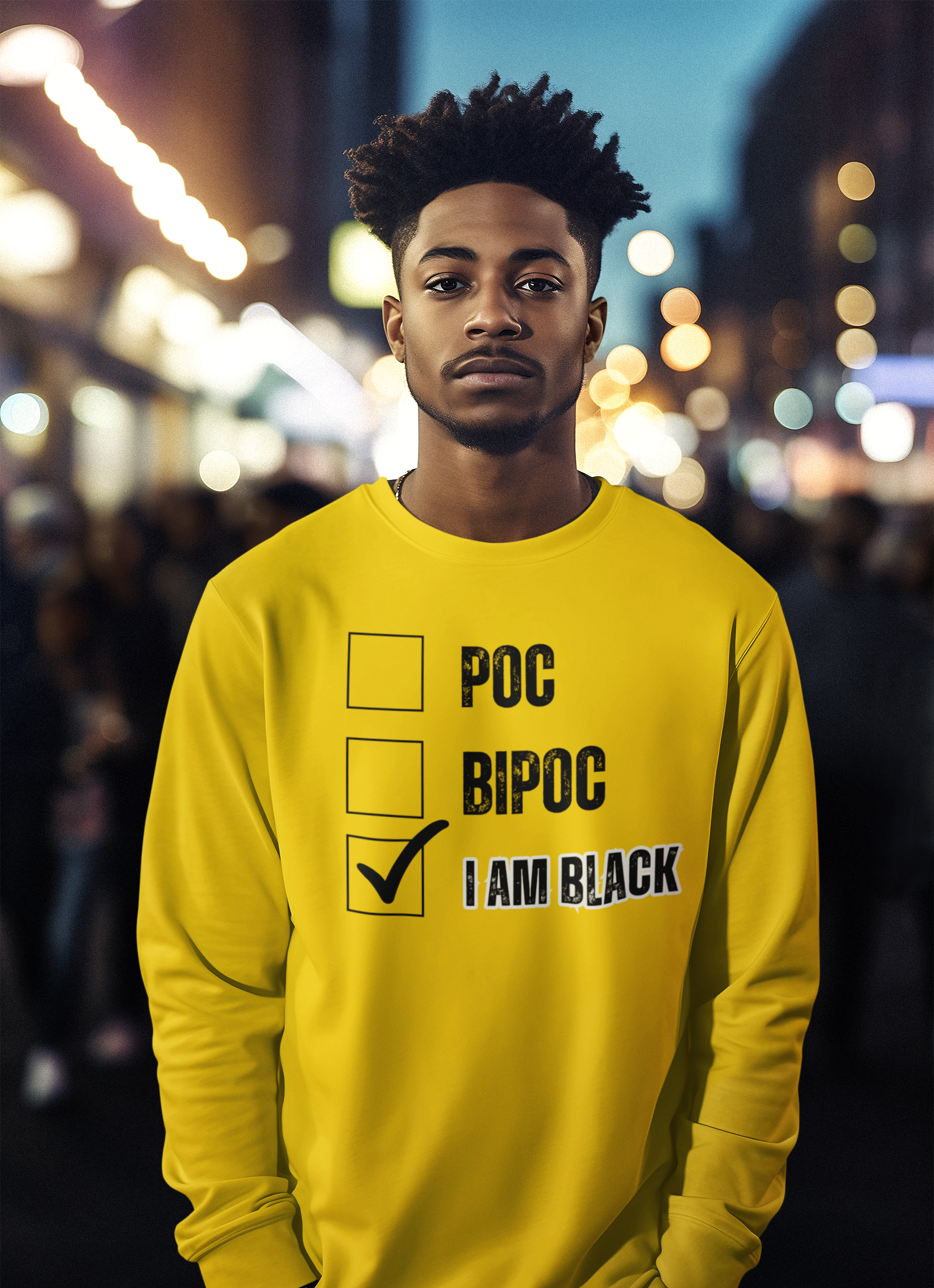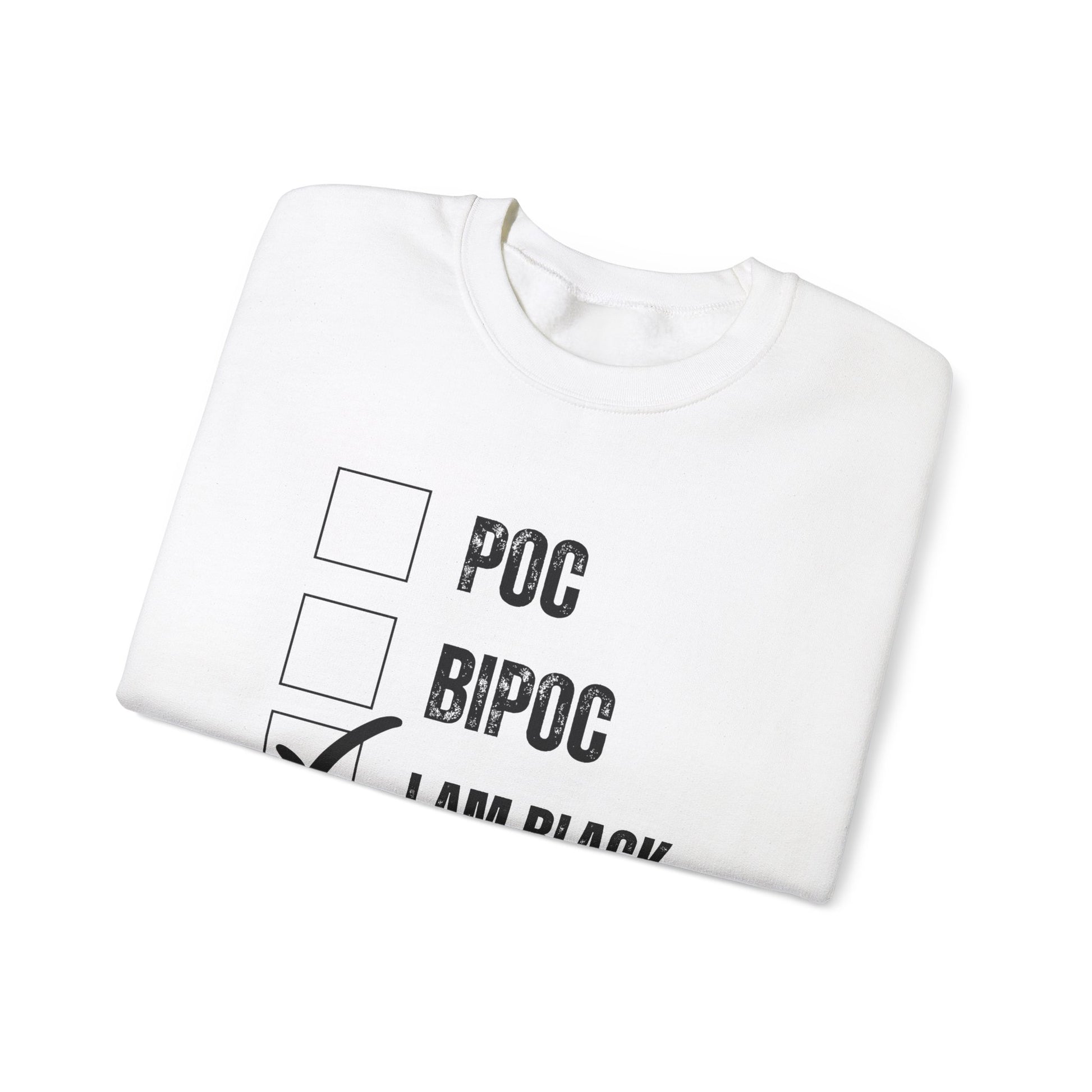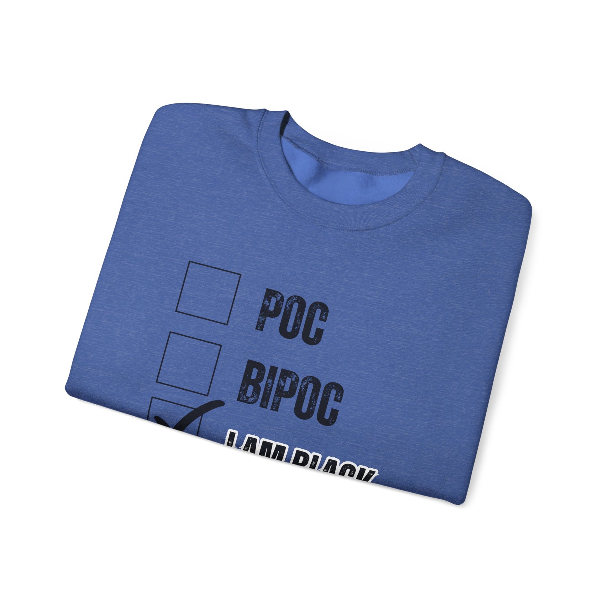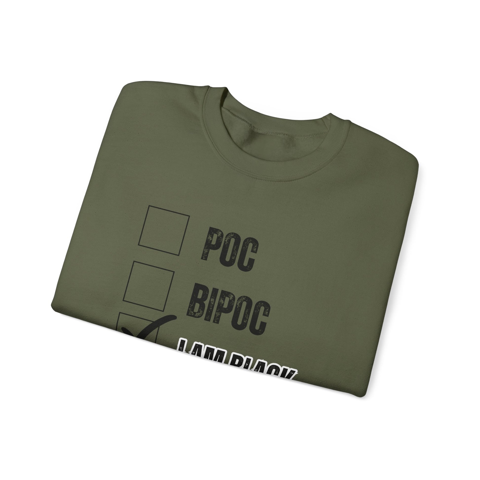 Unisex crewneck sweatshirt with the bold statement, "I Am Black." This sweatshirt is designed for those who proudly embrace their culture and make a statement about the lack of support they feel in society. Featuring checkboxes for "POC" and "BIPOC," with the box next to "I Am Black" checked, it leaves no doubt about where the wearer stands.