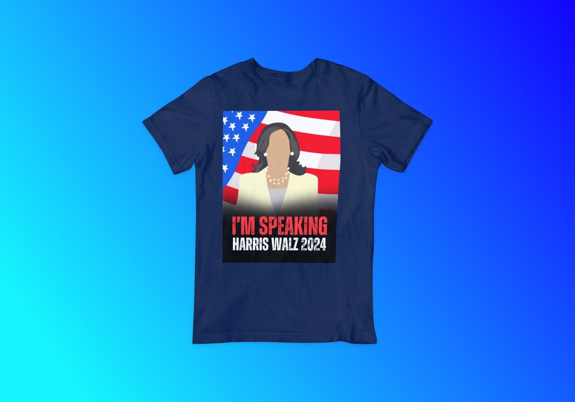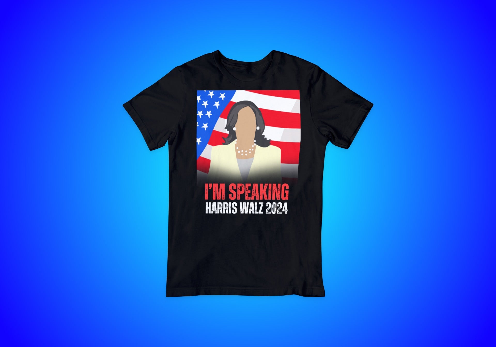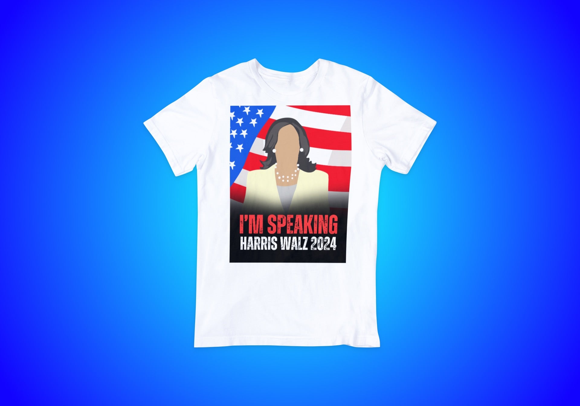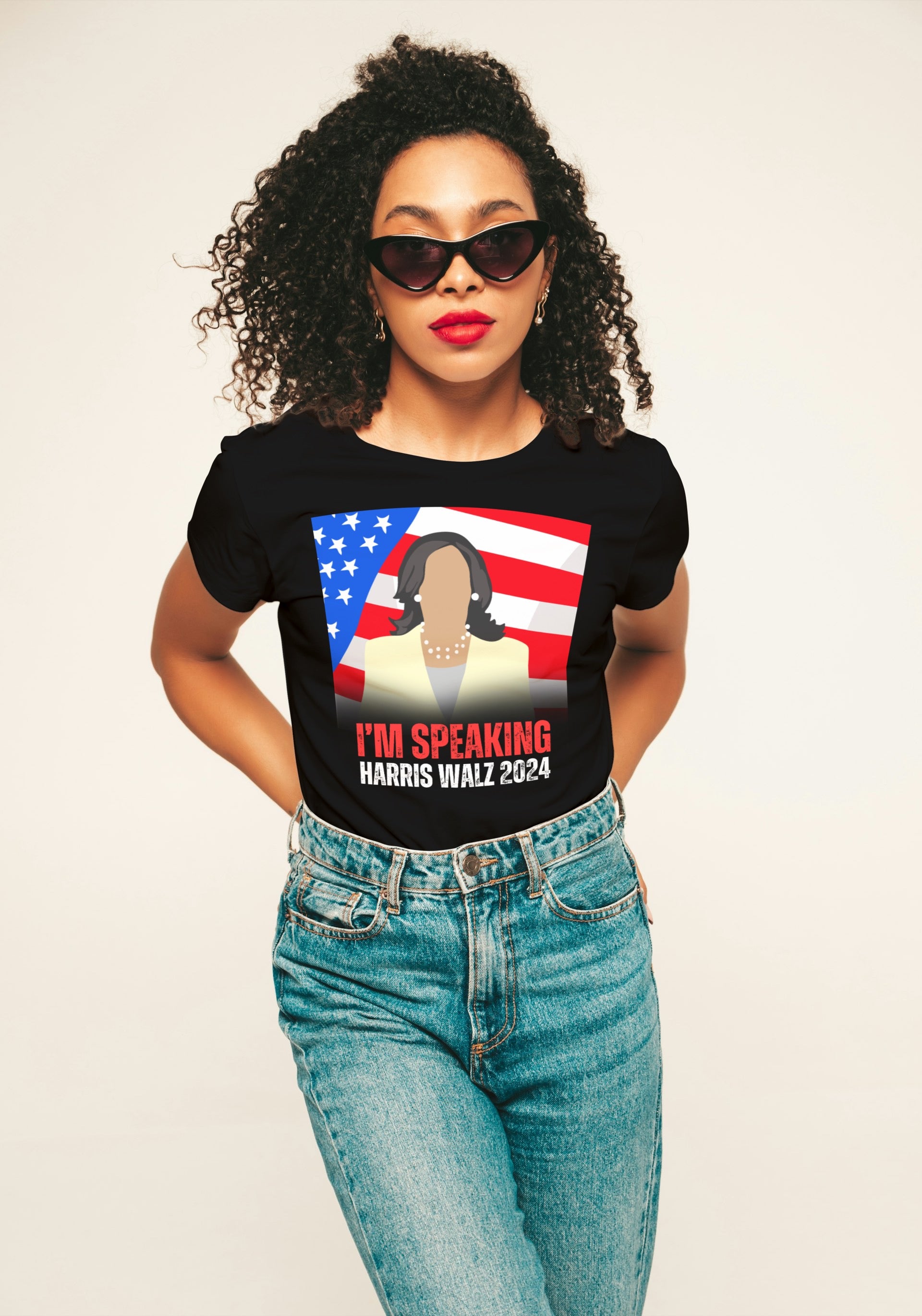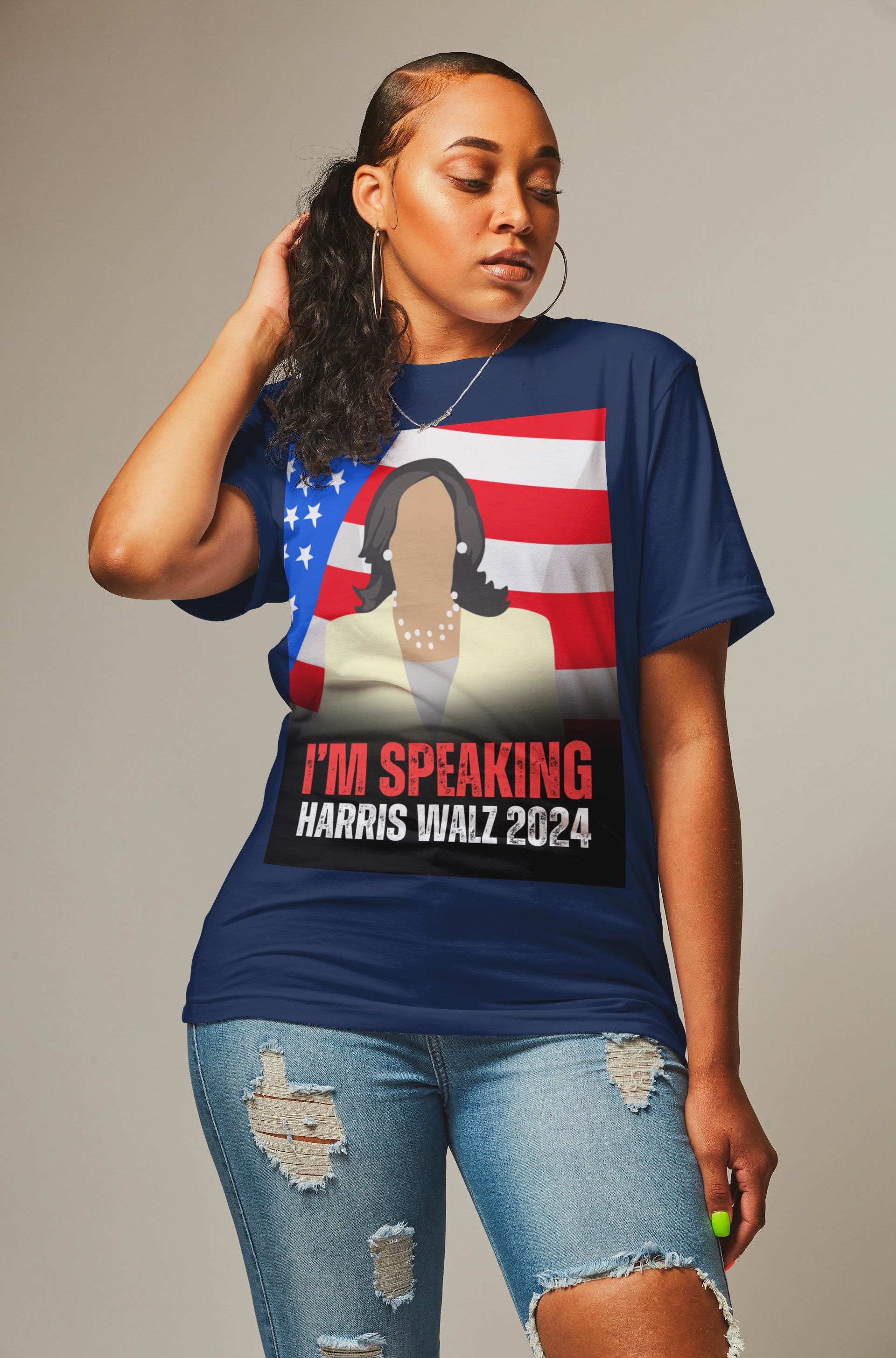 Celebrate the power of using your voice with our "I'm Speaking" T-shirt, inspired by Vice President Kamala Harris's iconic statement. This shirt embodies the spirit of standing up for your rights and commanding respect with grace and confidence. Crafted from soft, high-quality cotton, it offers both comfort and style. The bold, eye-catching print serves as a reminder of the importance of speaking out and being heard. Wear it proudly to make a statement about empowerment and respect in every conversation.
