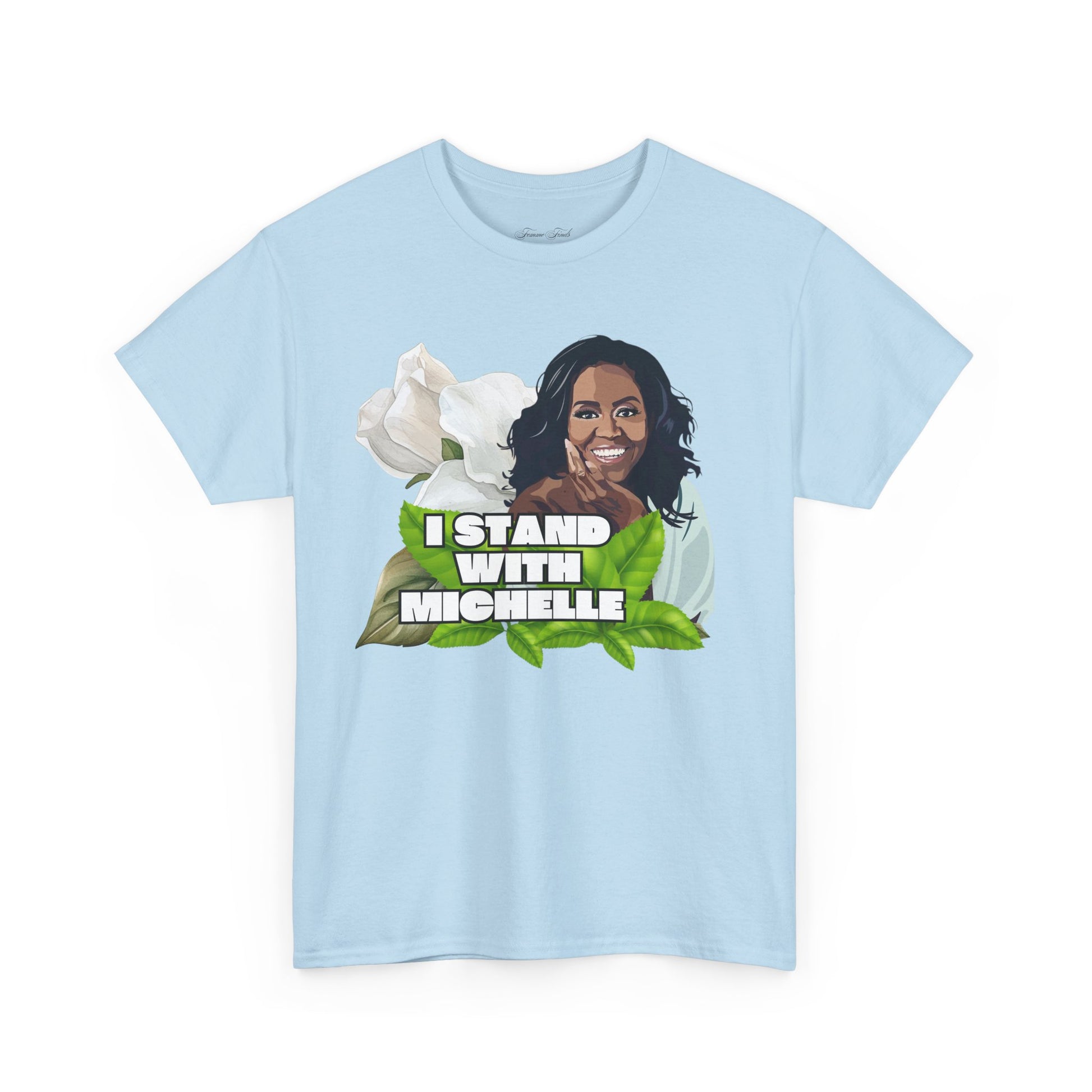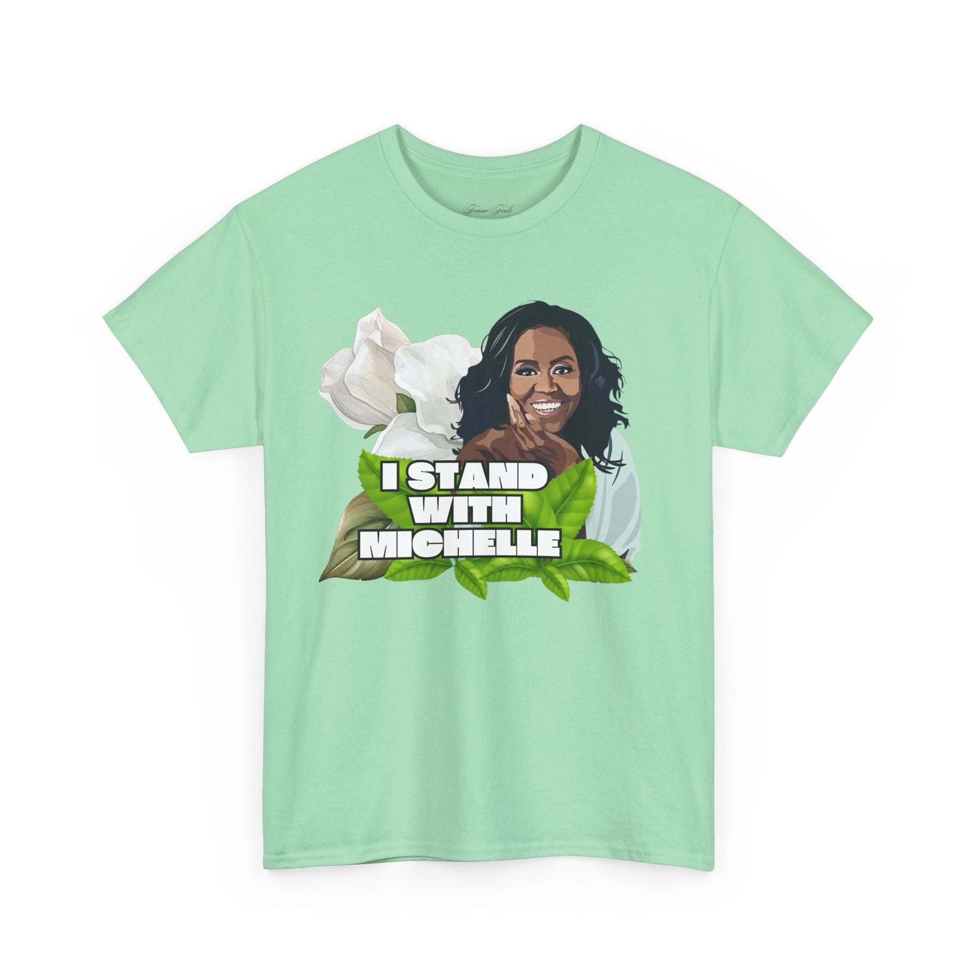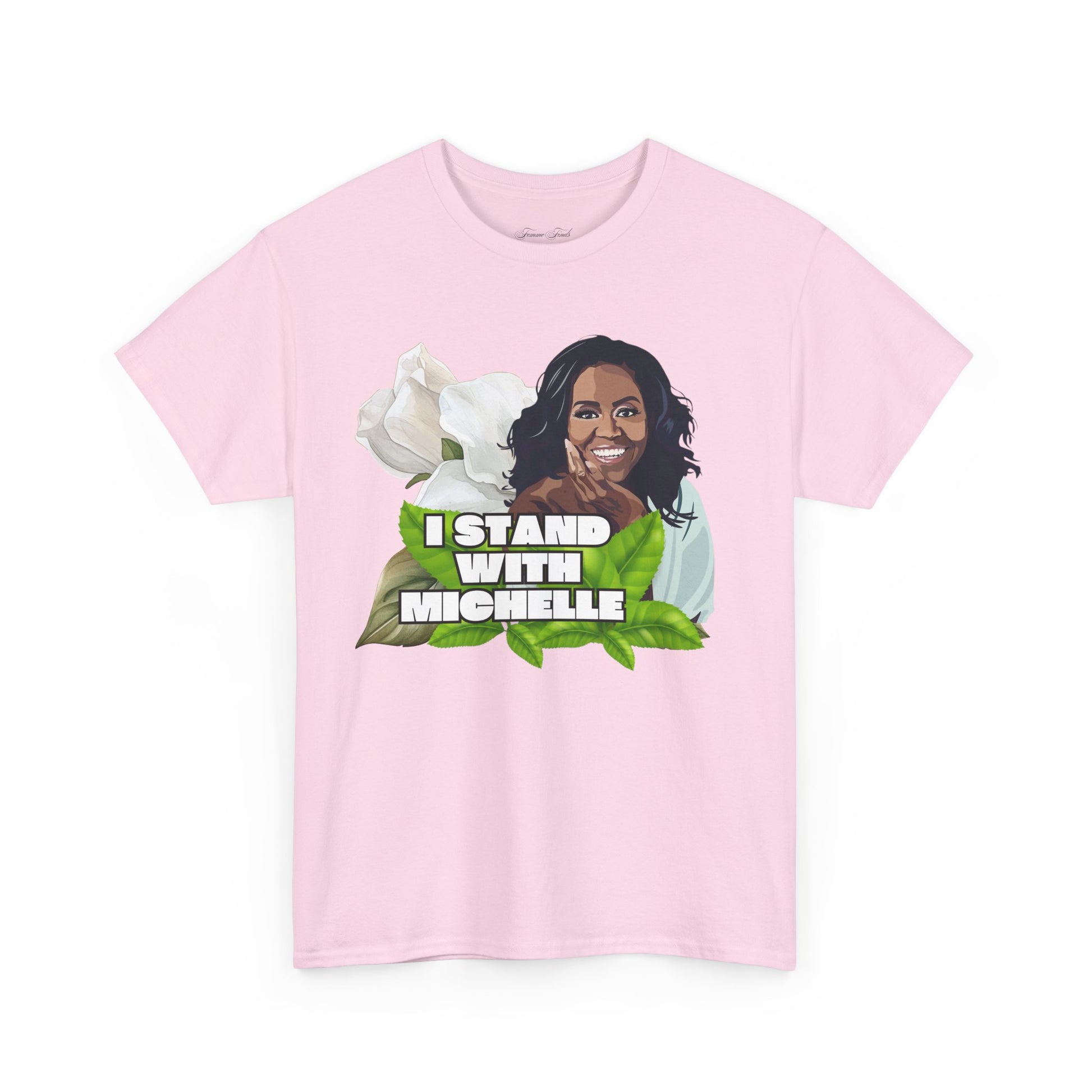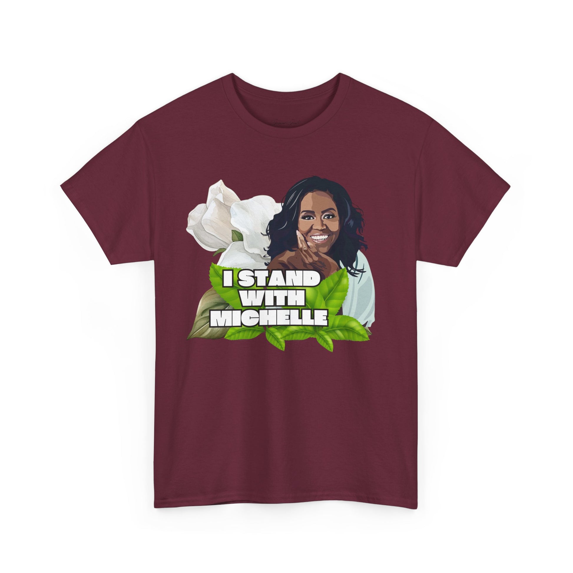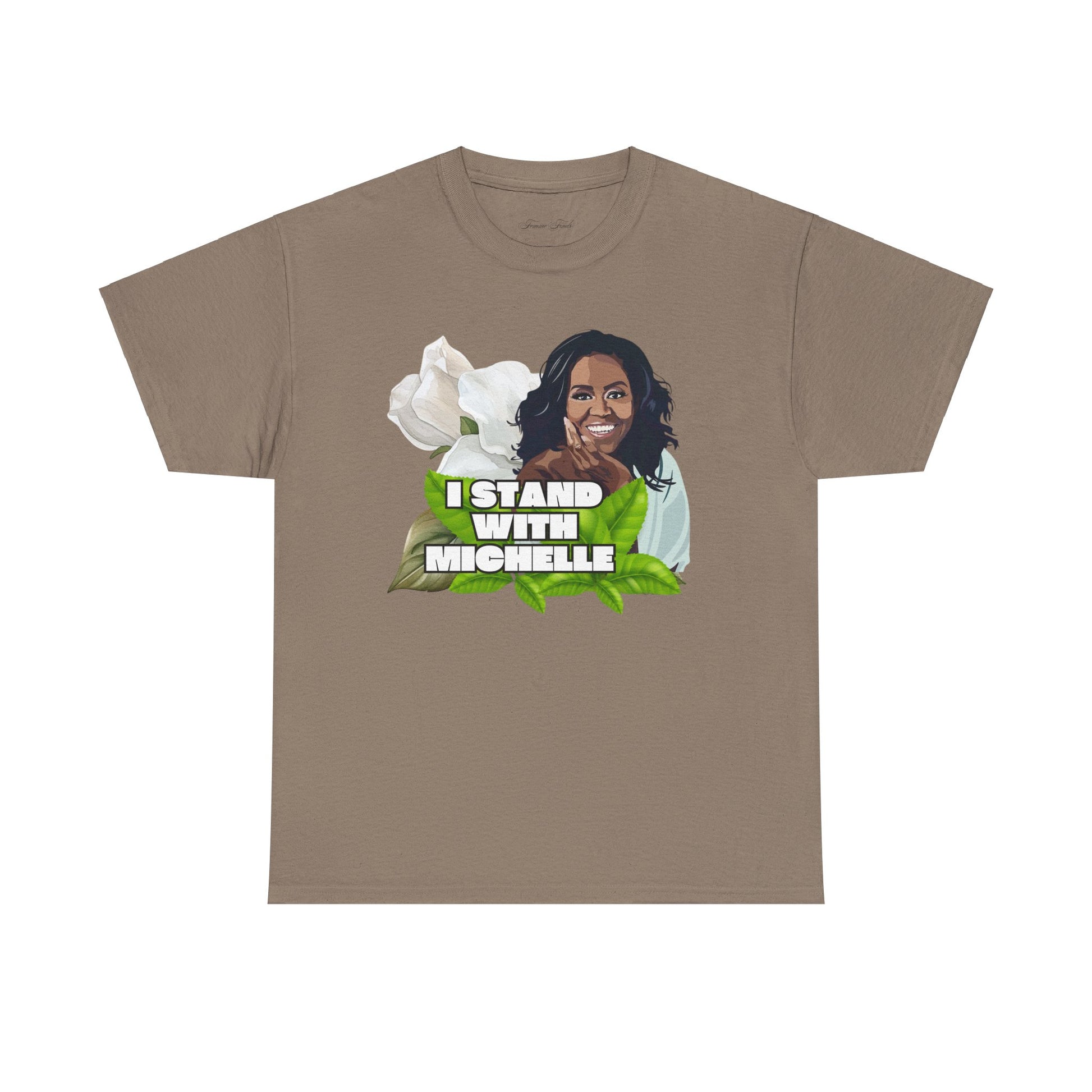Make a statement with this stunning I Stand With Michelle T-shirt, featuring a vibrant design of Michelle Obama surrounded by elegant floral accents and bold typography. This artwork honors Michelle's strength, grace, and unwavering commitment to standing up for what's right—even when it's not easy.
