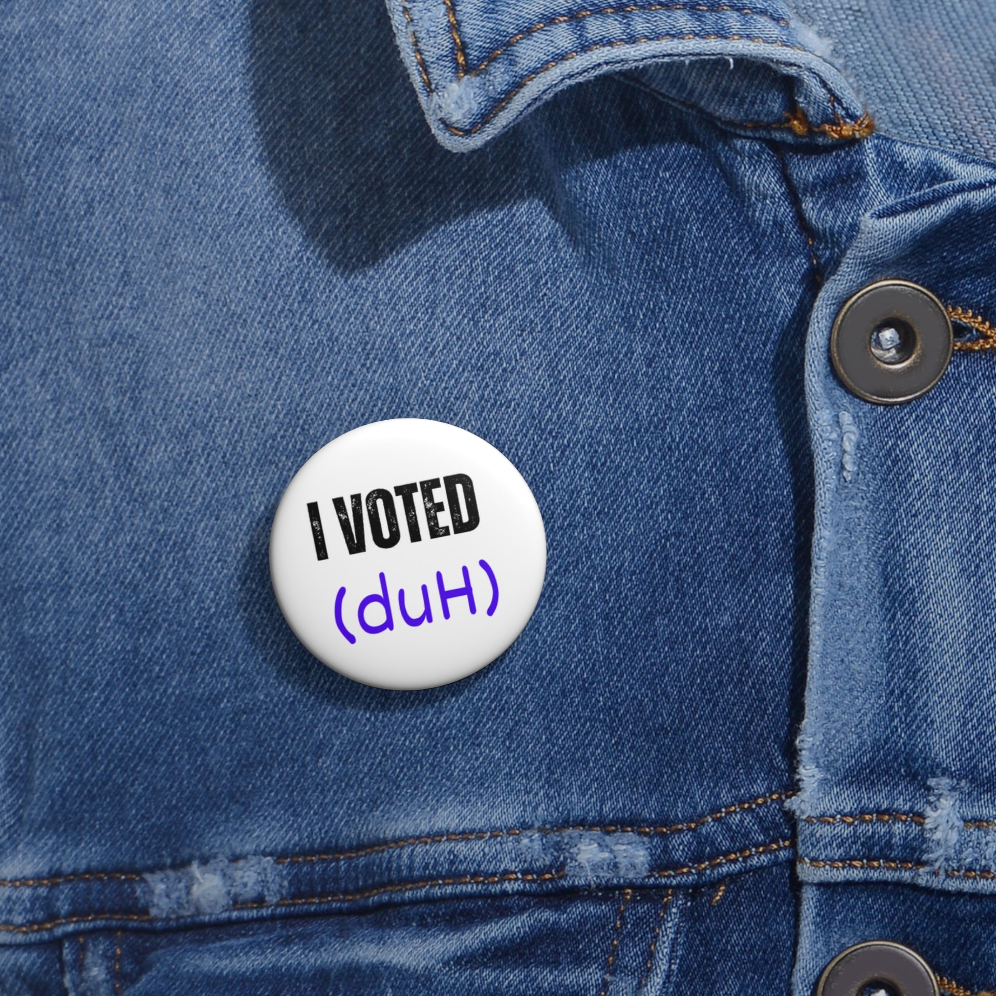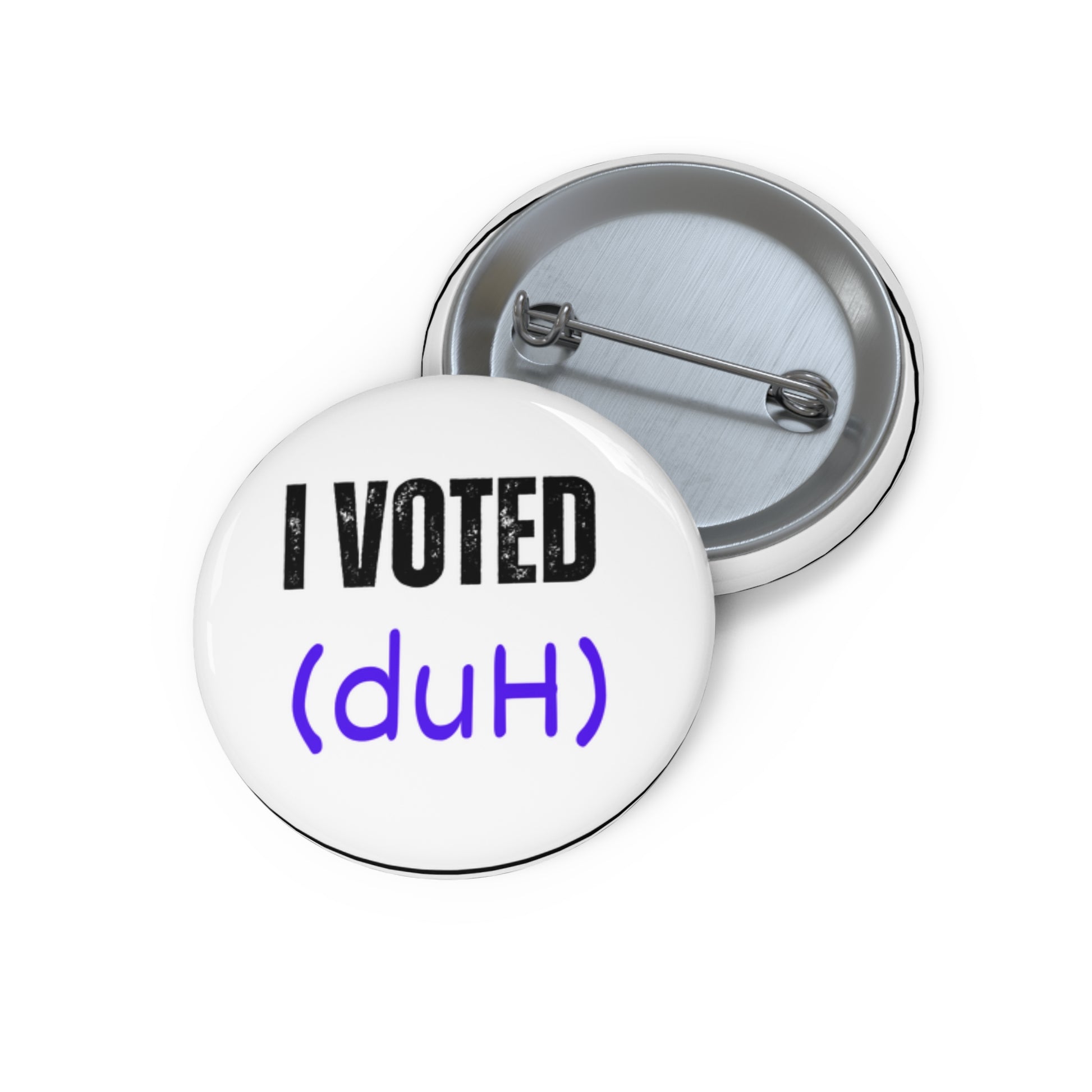Stand out and share your message loud and clear. Get your I Voted (Duh) button today and let the world know that being involved is the only way forward! These Custom Pin Buttons are made from metal, yet are lightweight and durable with a strong safety pin.