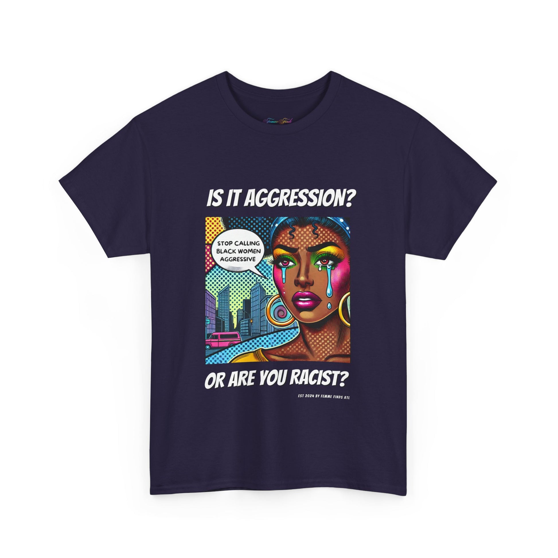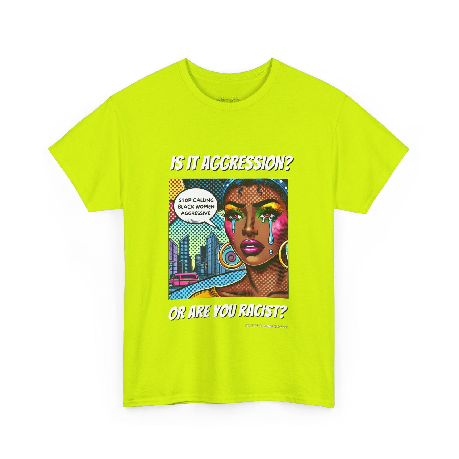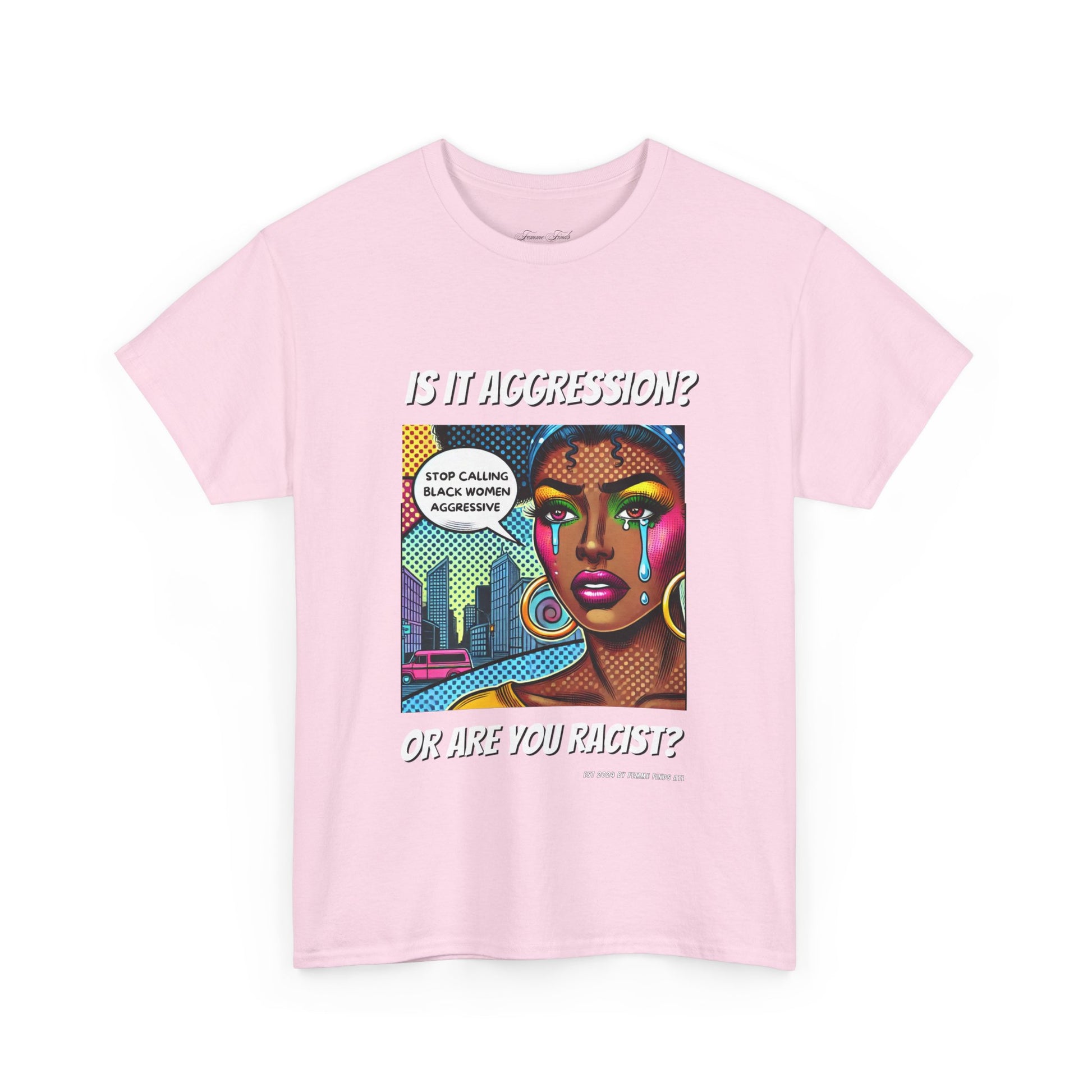 This bold T-shirt is more than just clothing—it's a call to action. Featuring a striking pop art design of a Black woman and the words “Stop calling Black women aggressive.