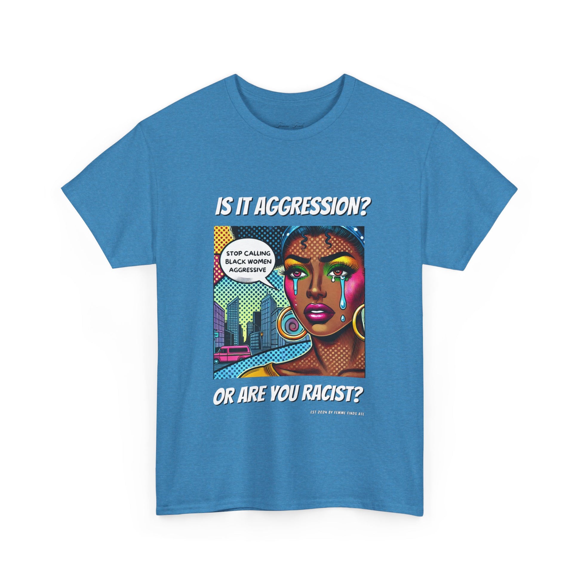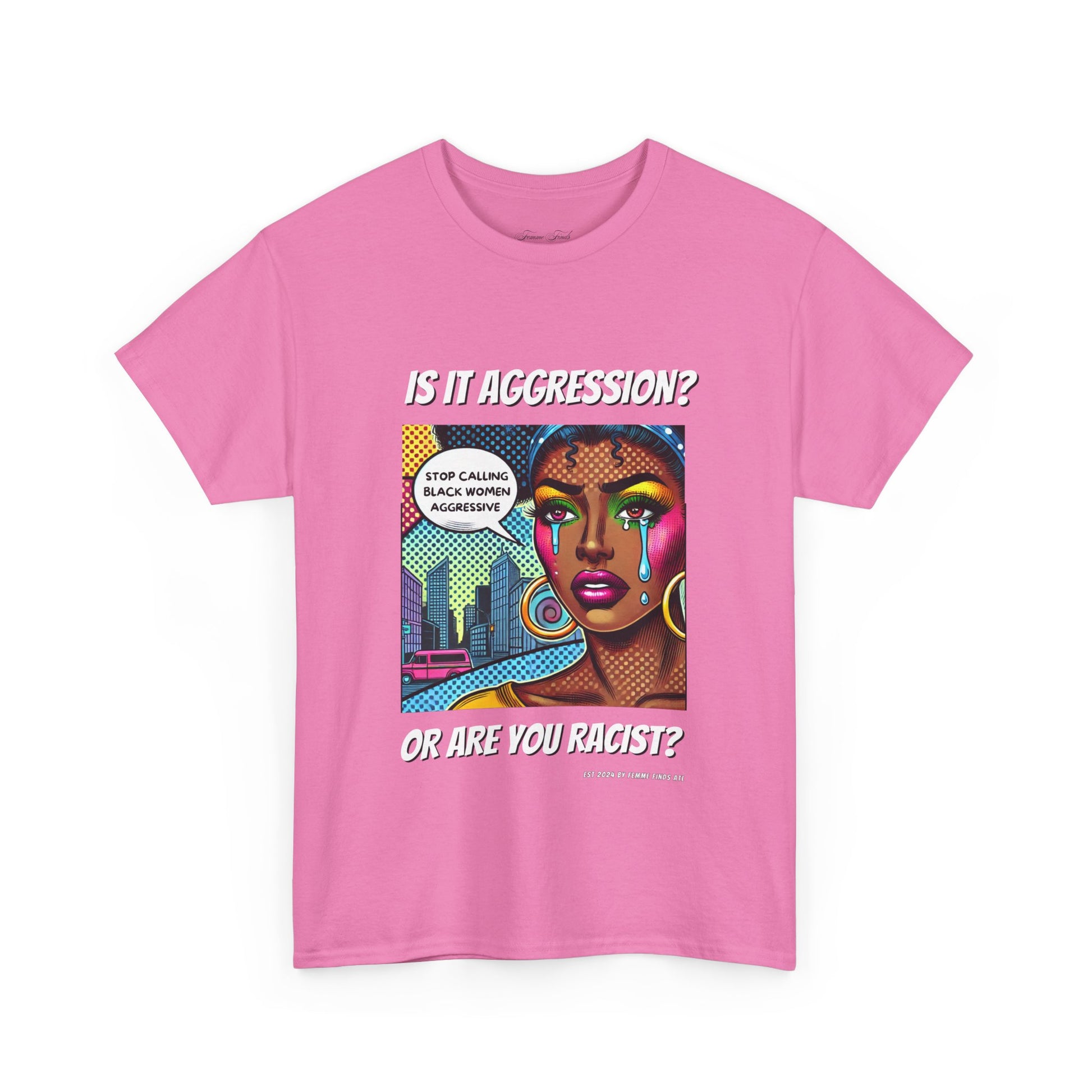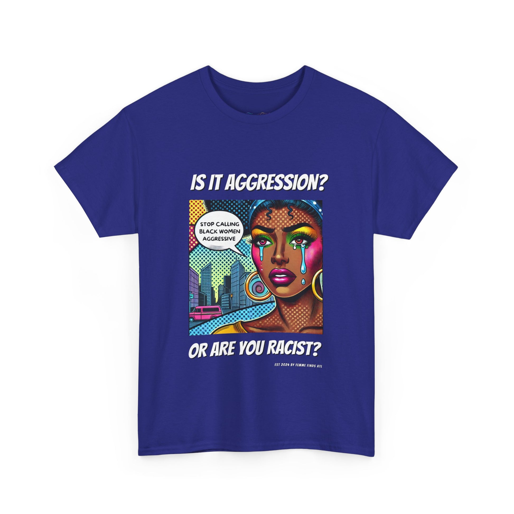This bold T-shirt is more than just clothing—it's a call to action. Featuring a striking pop art design of a Black woman and the words “Stop calling Black women aggressive.