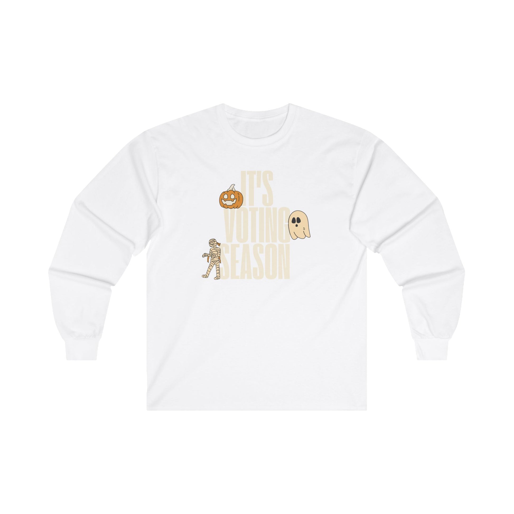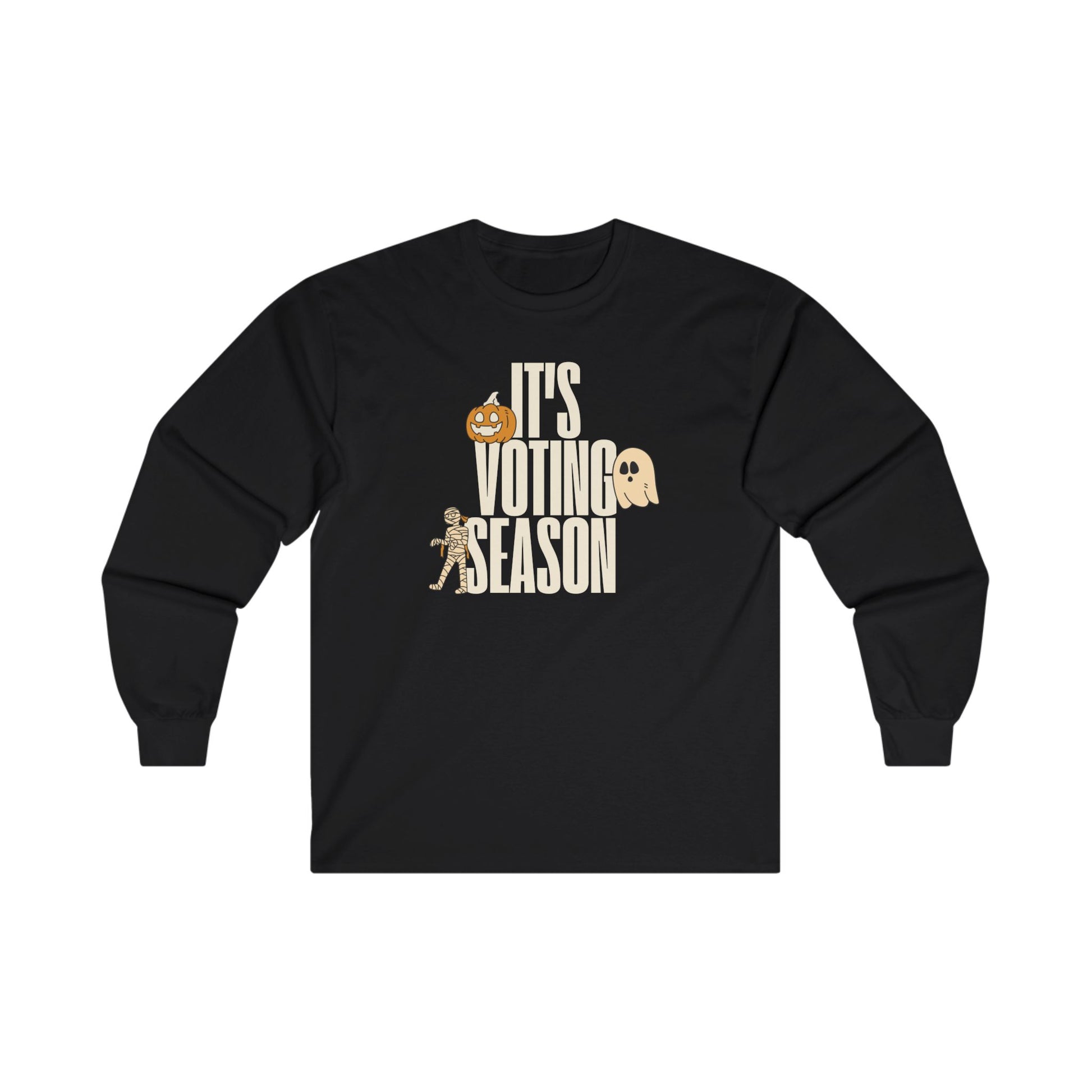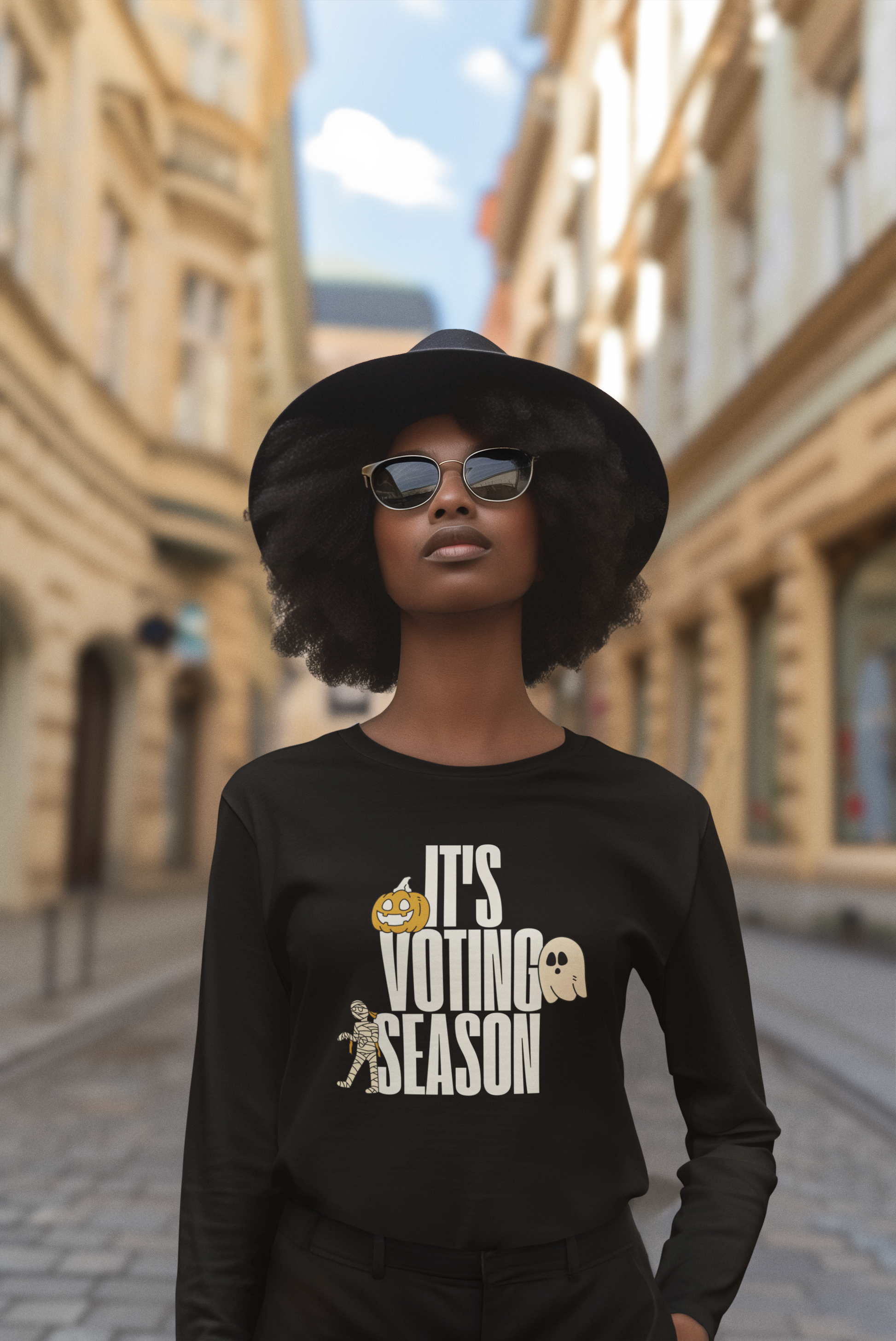 Unleash your spooky spirit and civic duty with our "It's Voting Season" Halloween-themed T-shirt! Perfect for October, this shirt combines the thrill of election season with the fun of Halloween. Featuring eerie, bold lettering and festive Halloween elements like pumpkins, bats, and ghosts, it reminds everyone that the scariest thing this season is not voting. Whether you’re hitting the polls or a Halloween party, this soft, breathable tee makes a statement—your voice matters!