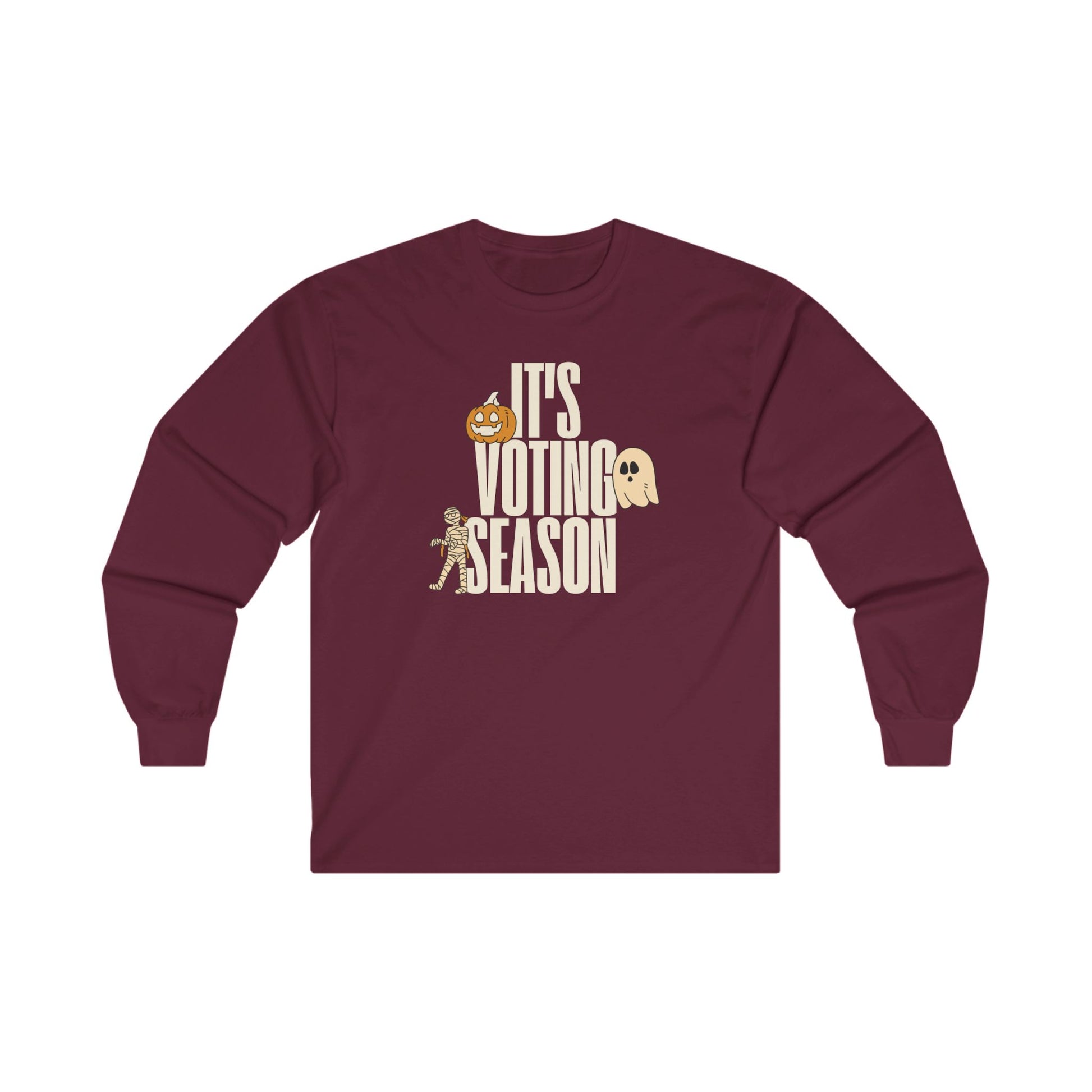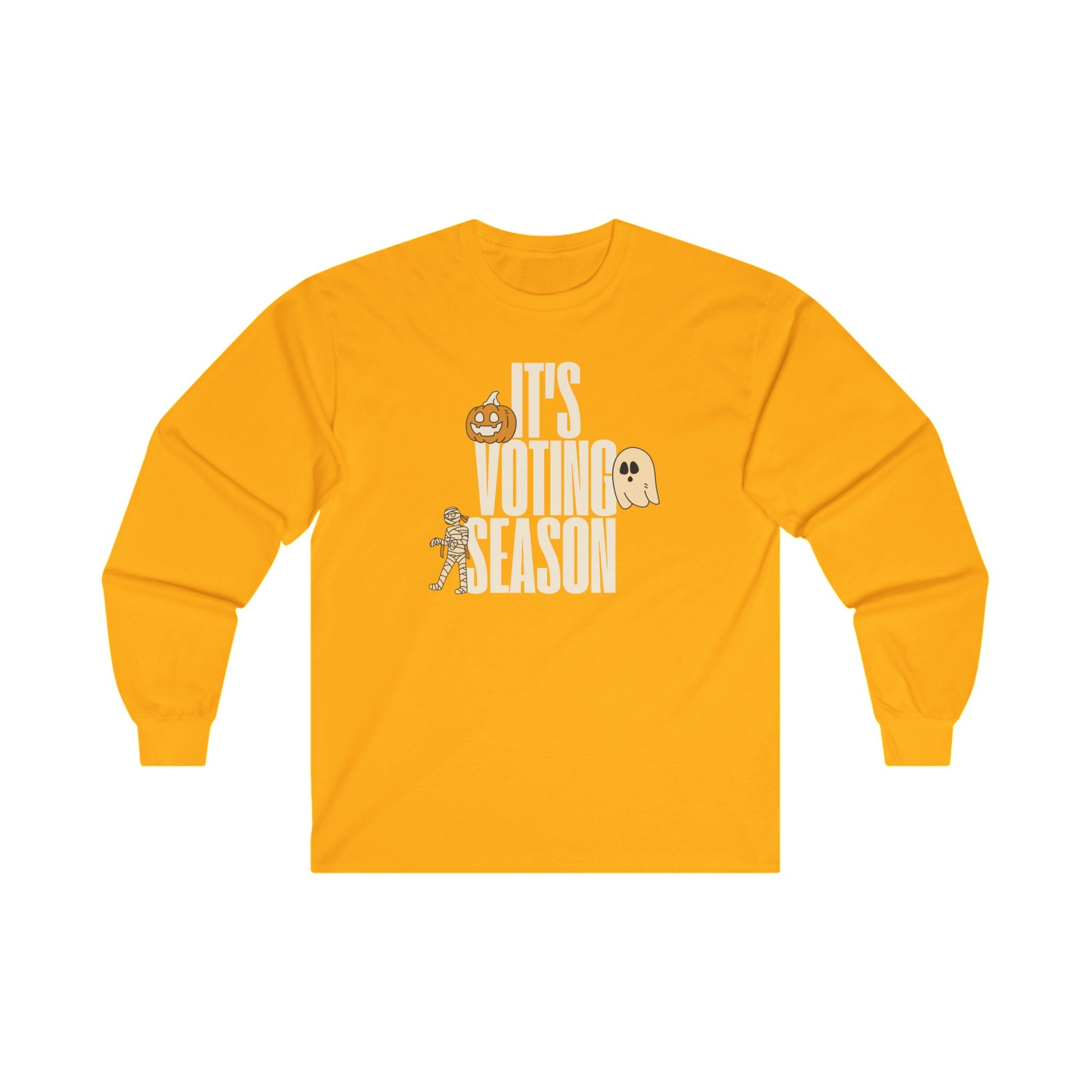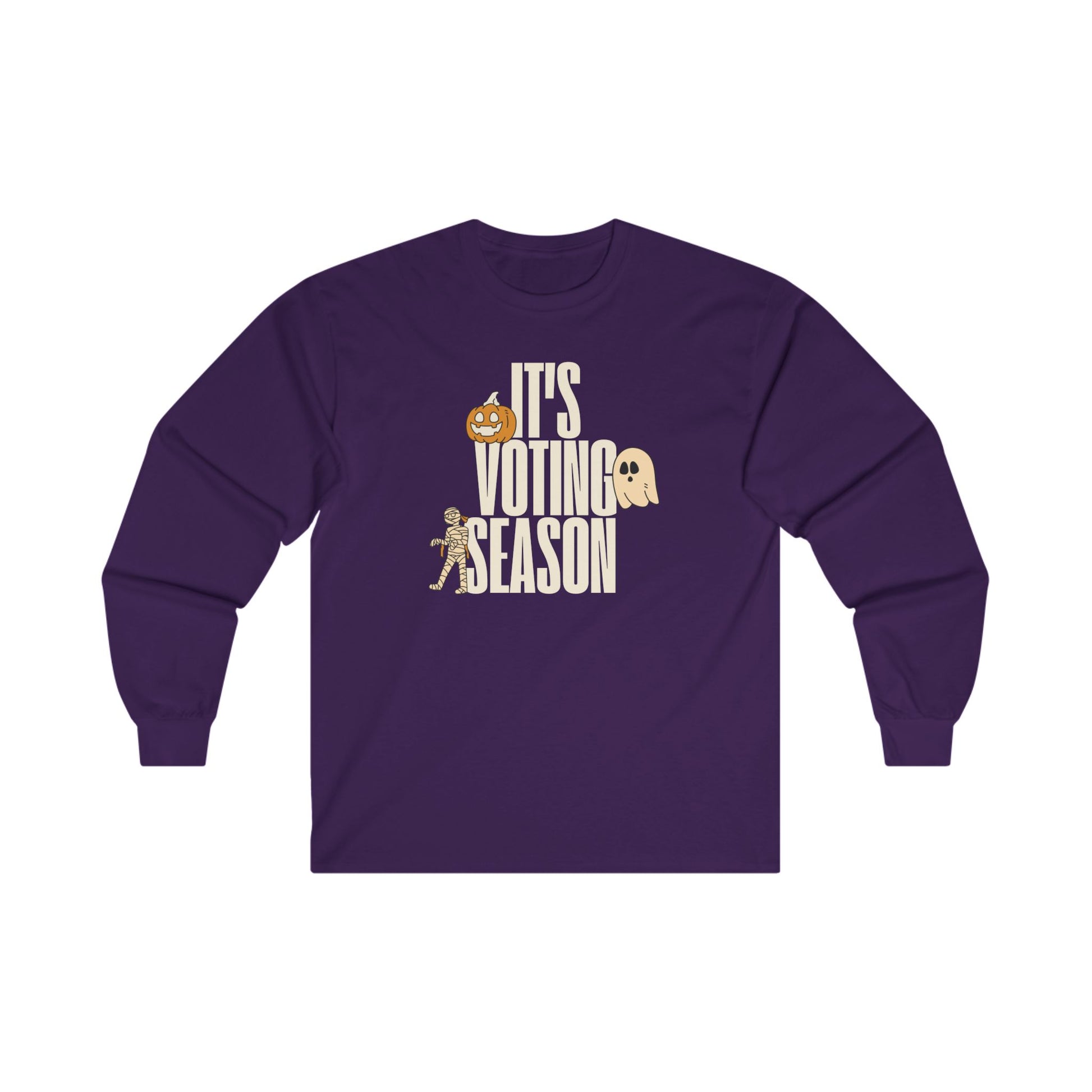 Unleash your spooky spirit and civic duty with our "It's Voting Season" Halloween-themed T-shirt! Perfect for October, this shirt combines the thrill of election season with the fun of Halloween. Featuring eerie, bold lettering and festive Halloween elements like pumpkins, bats, and ghosts, it reminds everyone that the scariest thing this season is not voting. Whether you’re hitting the polls or a Halloween party, this soft, breathable tee makes a statement—your voice matters!
