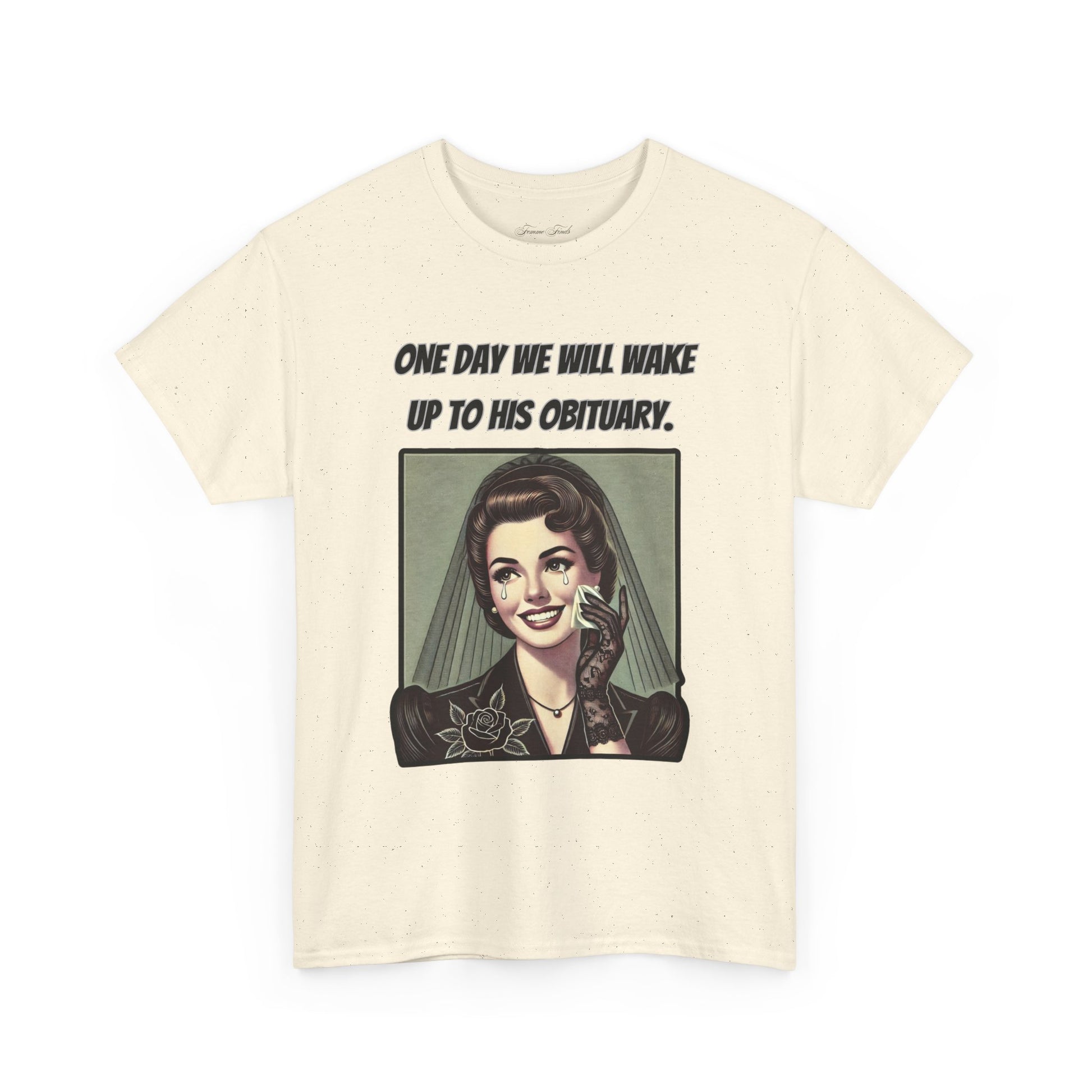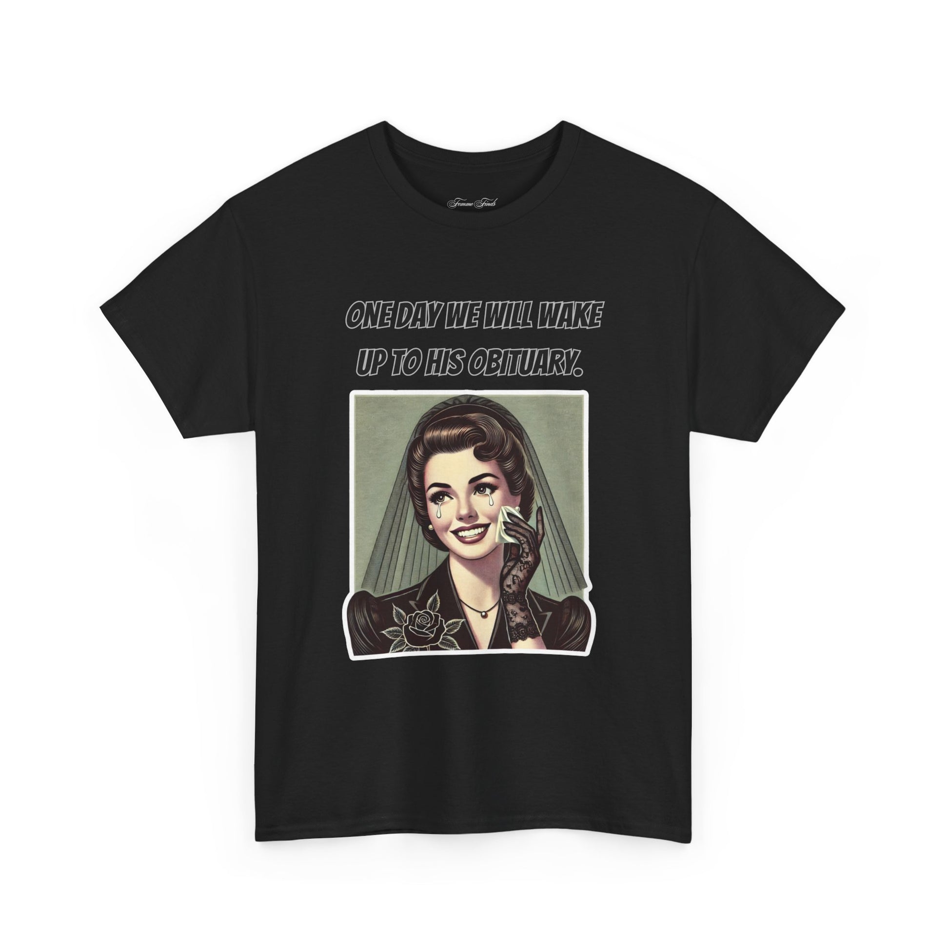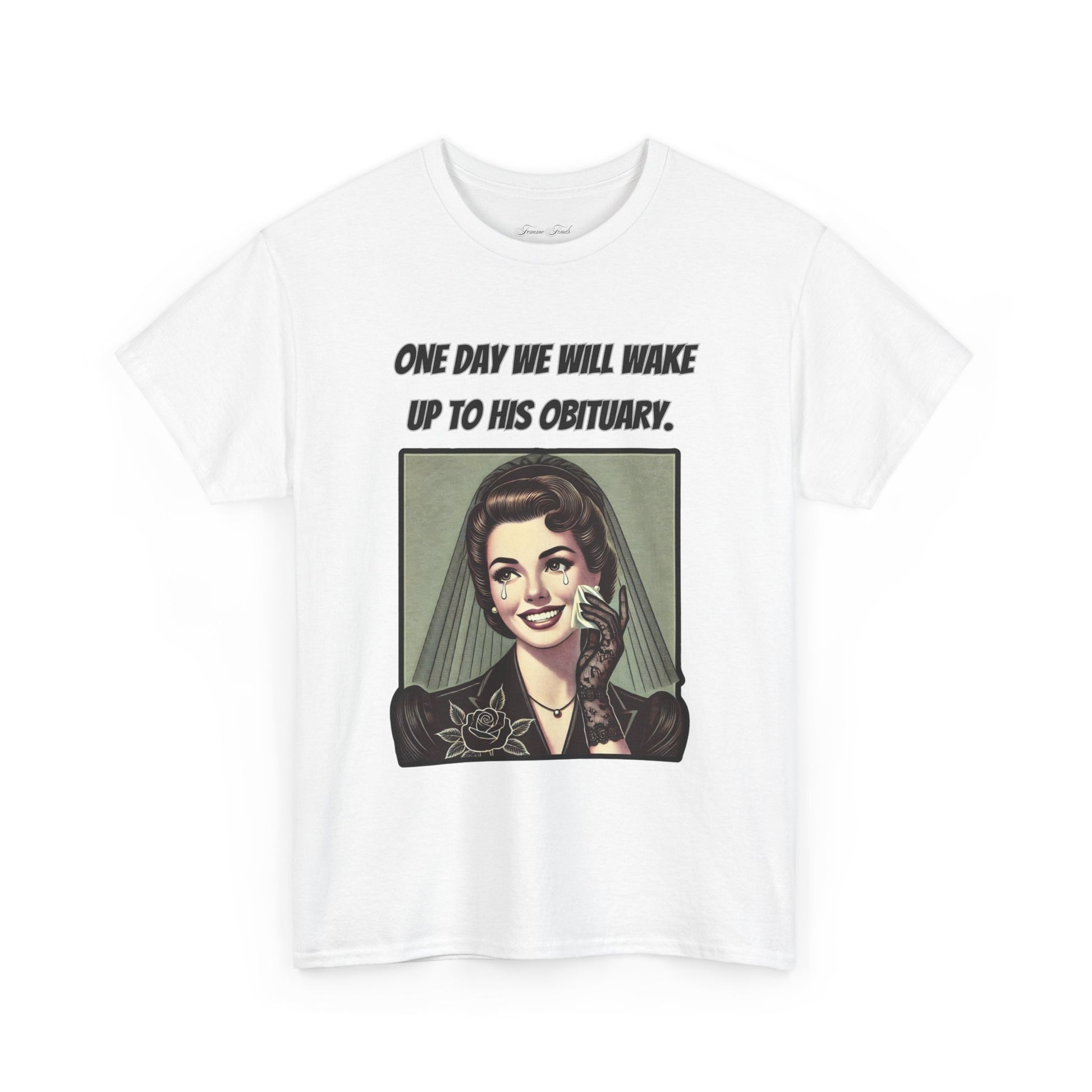 Inspired by a viral meme, this vintage-style design captures the quiet understanding shared by many. Featuring an elegant, mourning woman in retro illustration, this T-shirt embodies a moment of reflection wrapped in irony. The phrase “One day we will wake up to his obituary” serves as a powerful statement—one that needs no further explanation.