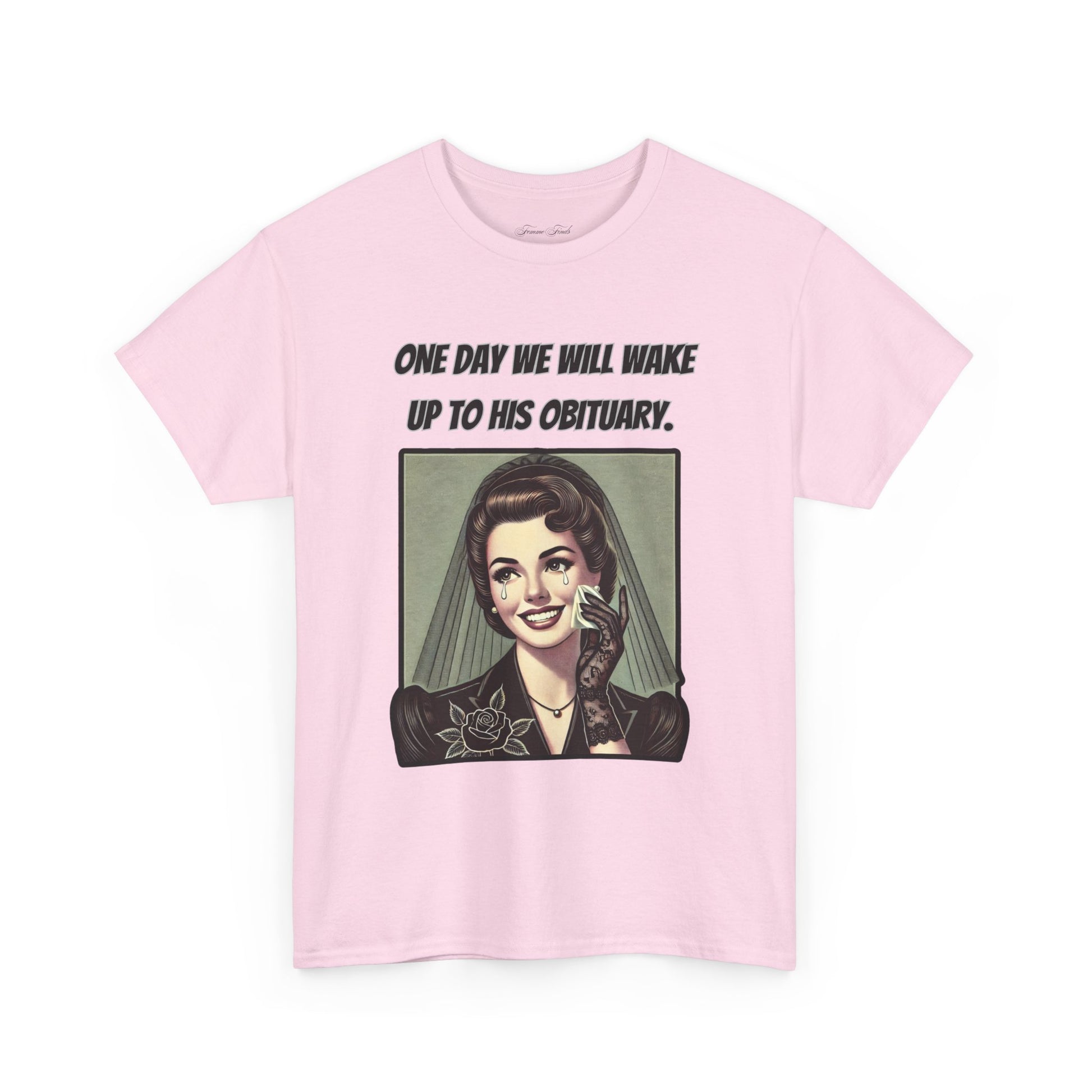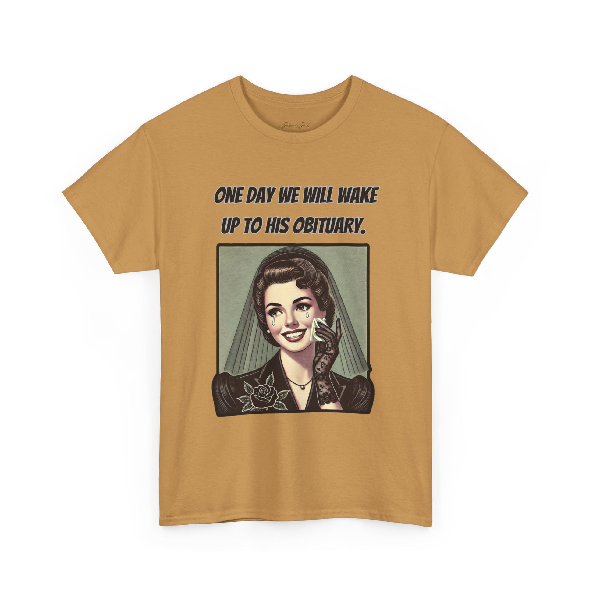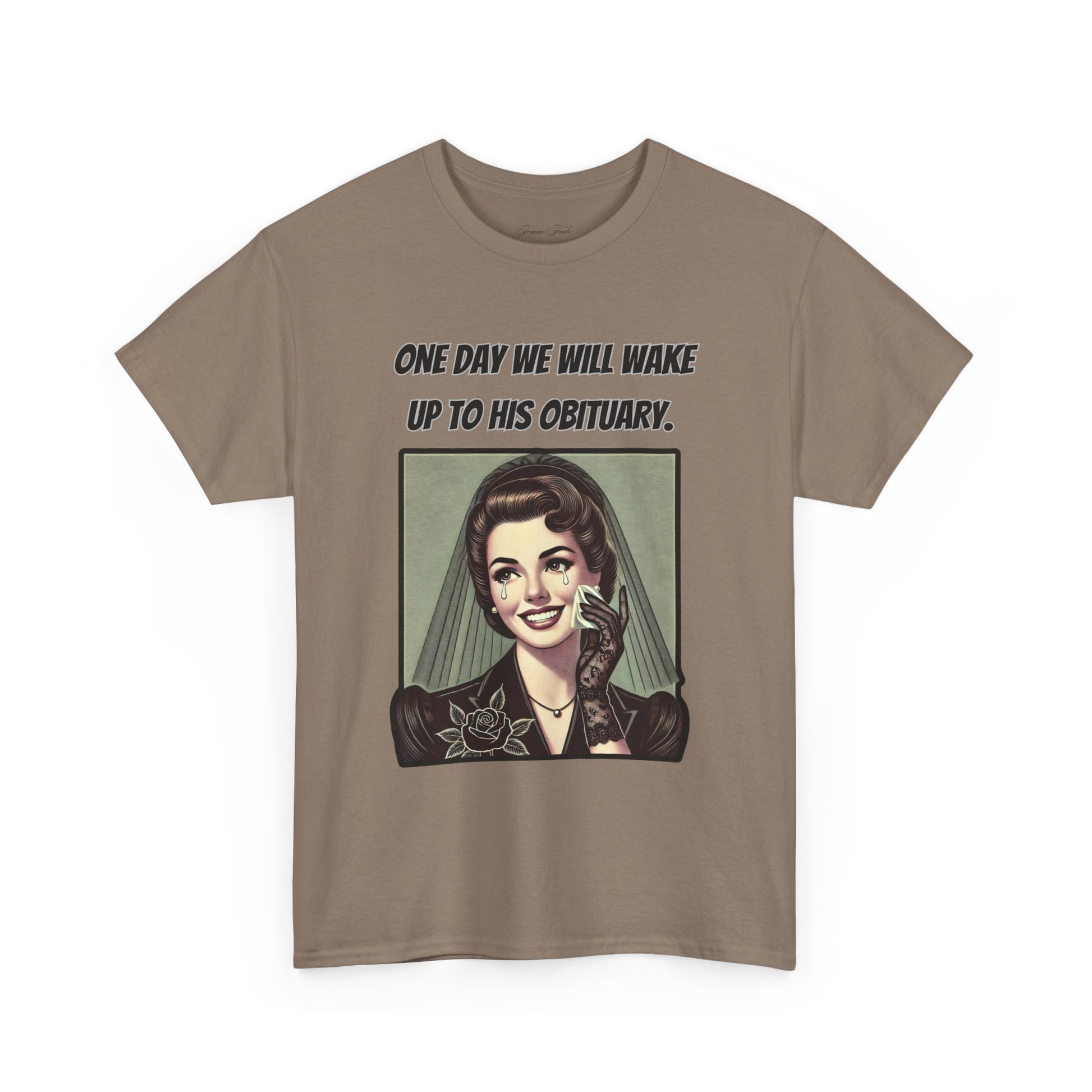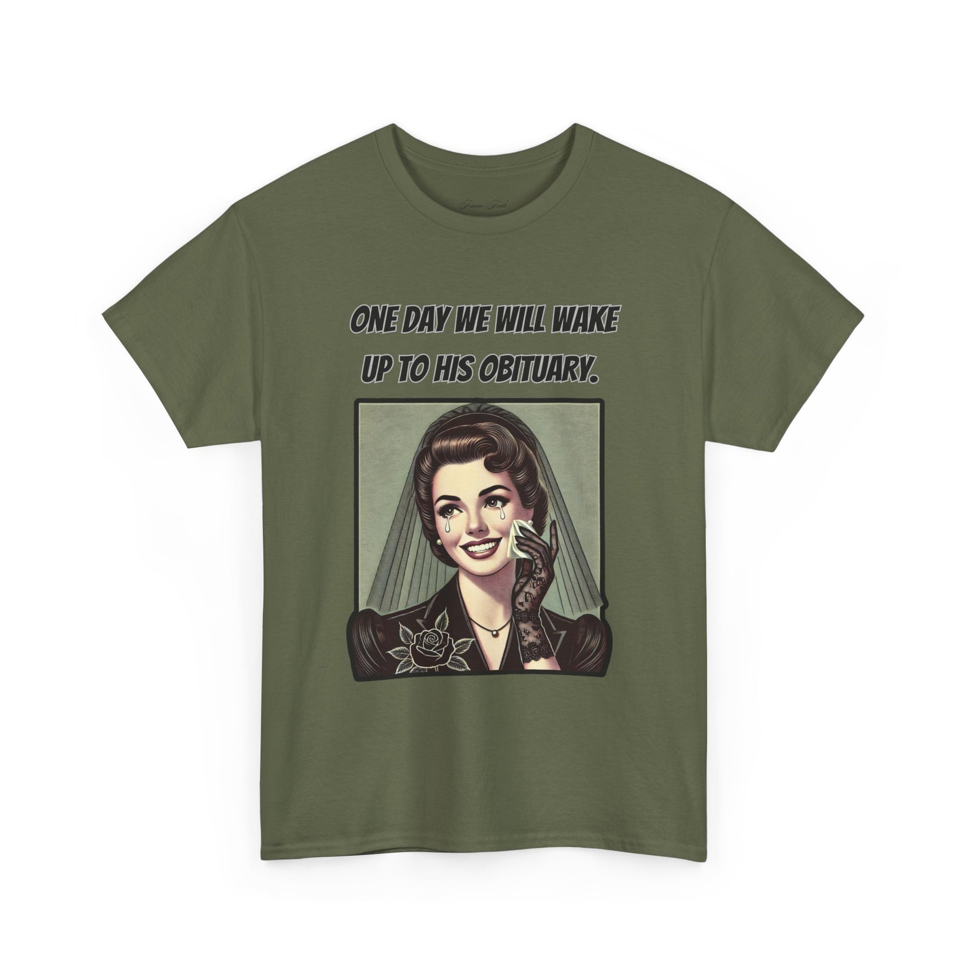 Inspired by a viral meme, this vintage-style design captures the quiet understanding shared by many. Featuring an elegant, mourning woman in retro illustration, this T-shirt embodies a moment of reflection wrapped in irony. The phrase “One day we will wake up to his obituary” serves as a powerful statement—one that needs no further explanation.
