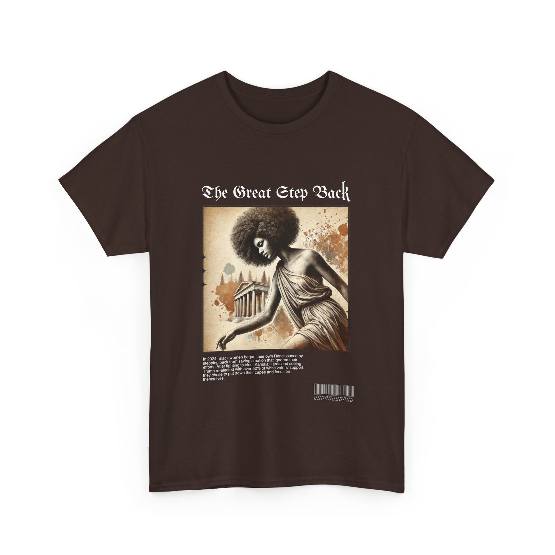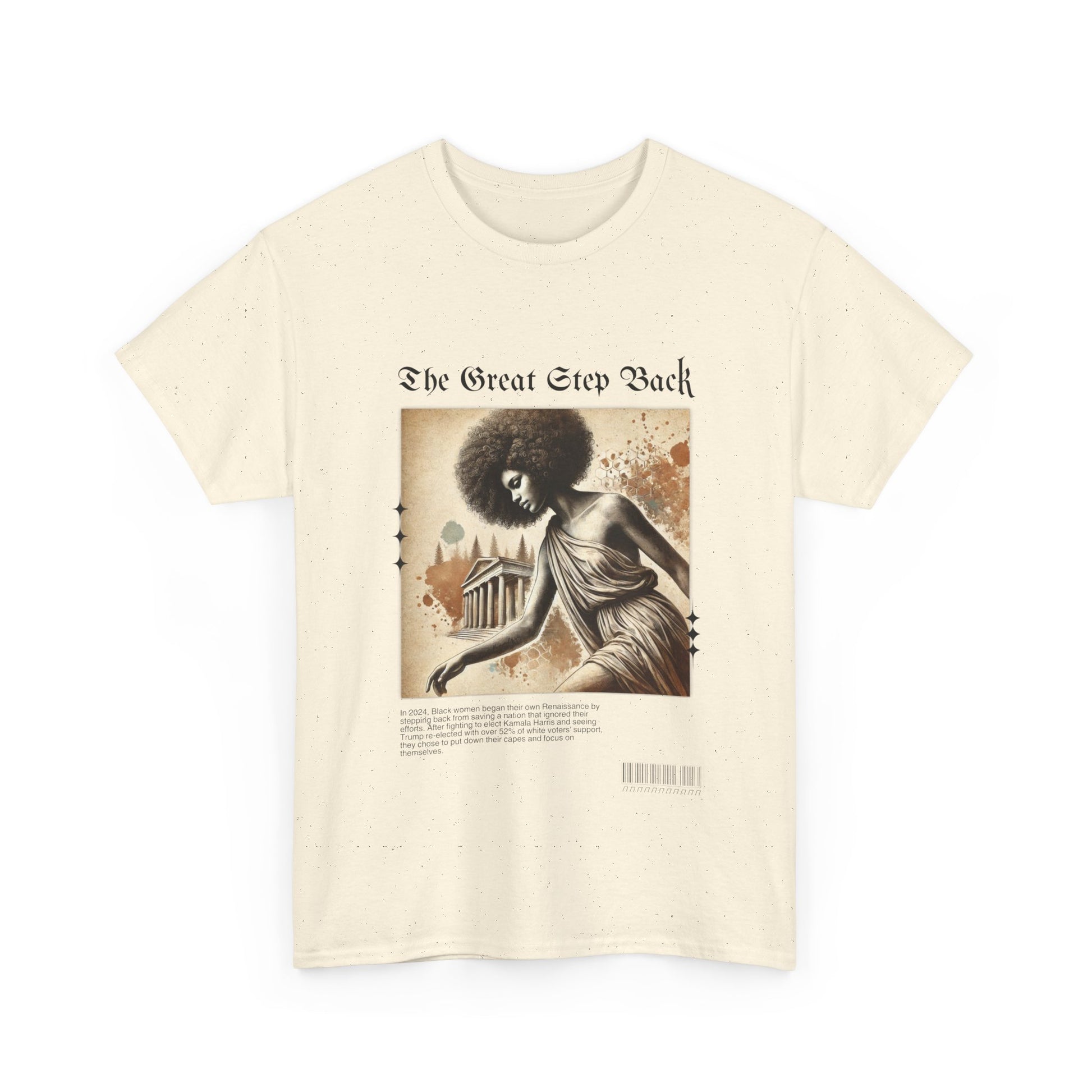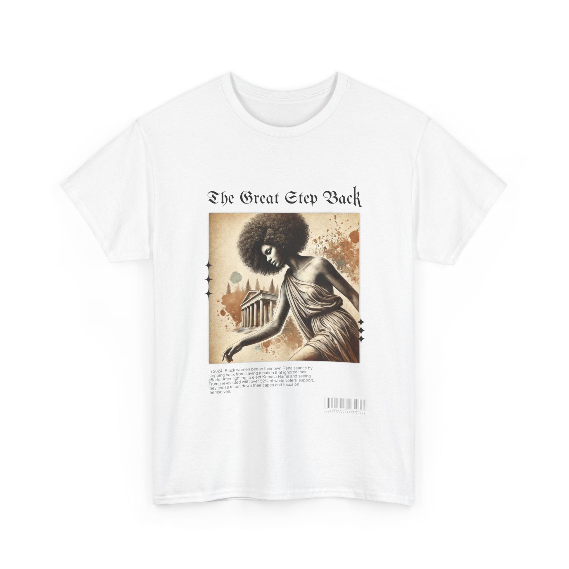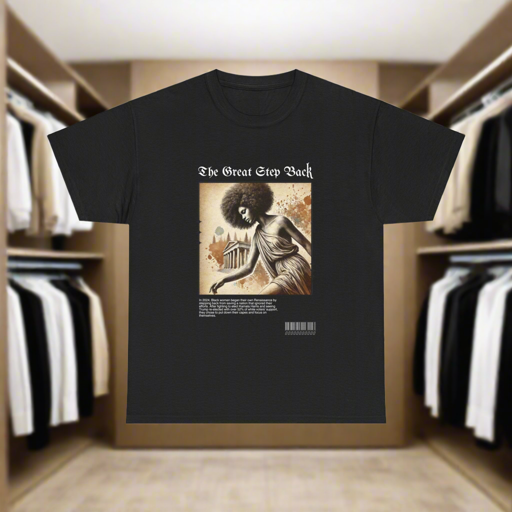 Celebrate the Renaissance of self-empowerment with our “The Great Step Back” T-Shirt. Featuring stunning artwork inspired by classical elegance, this design showcases a powerful Black woman gracefully taking a symbolic step back. The bold text, “The Great Step Back,” embodies a movement led by Black women who fought for Kamala Harris but chose to refocus their energy inward after being ignored by a nation they worked tirelessly to uplift.