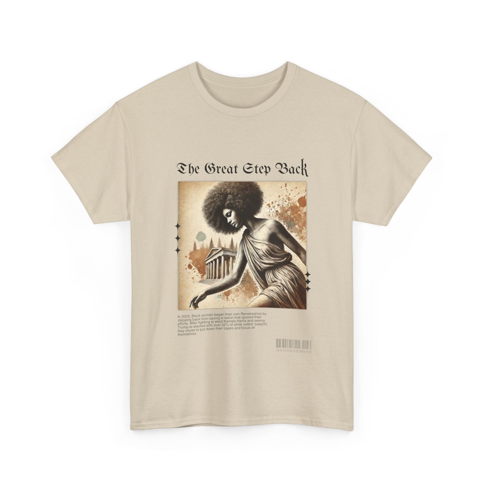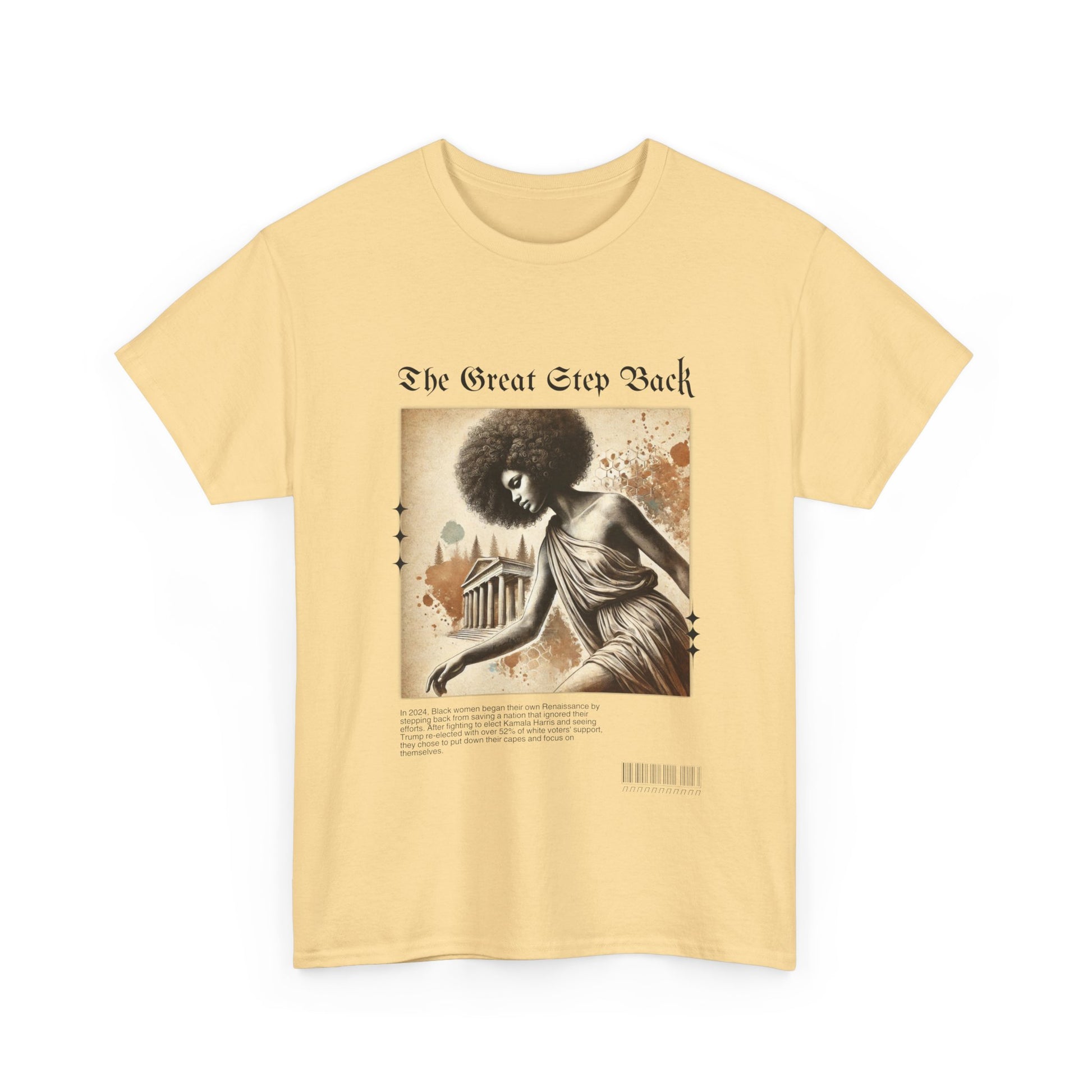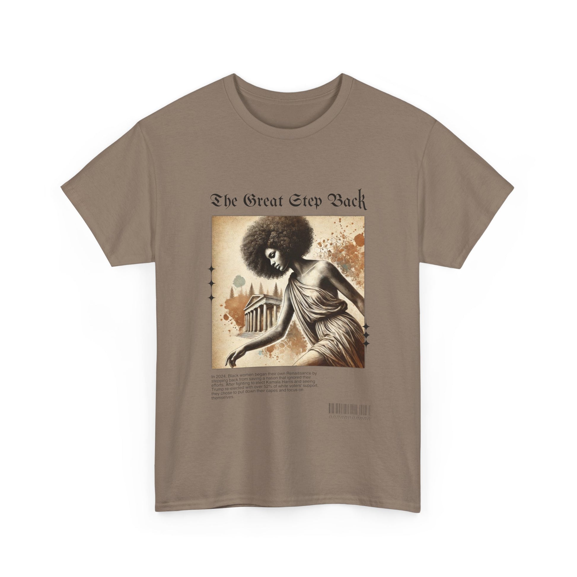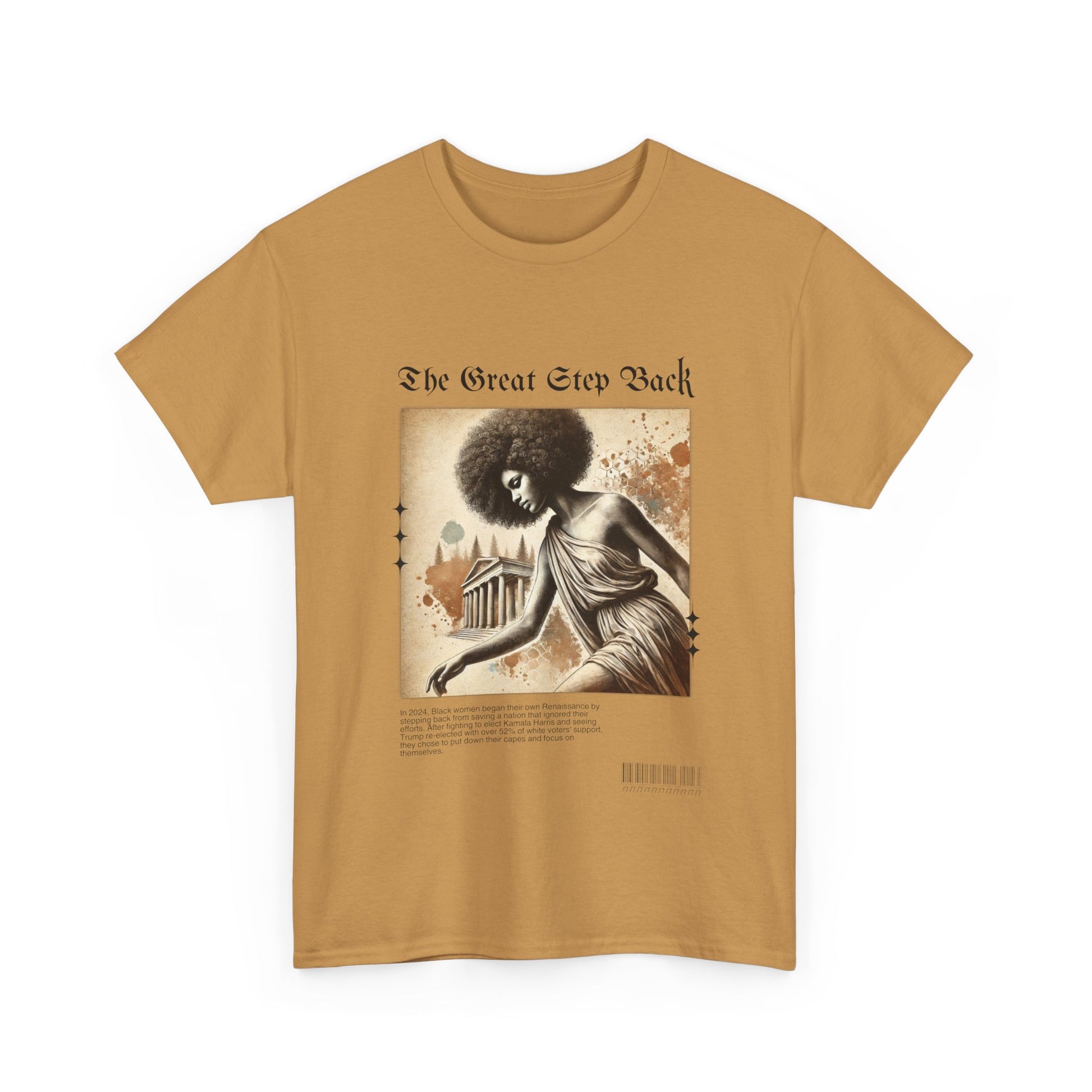 Celebrate the Renaissance of self-empowerment with our “The Great Step Back” T-Shirt. Featuring stunning artwork inspired by classical elegance, this design showcases a powerful Black woman gracefully taking a symbolic step back. The bold text, “The Great Step Back,” embodies a movement led by Black women who fought for Kamala Harris but chose to refocus their energy inward after being ignored by a nation they worked tirelessly to uplift.