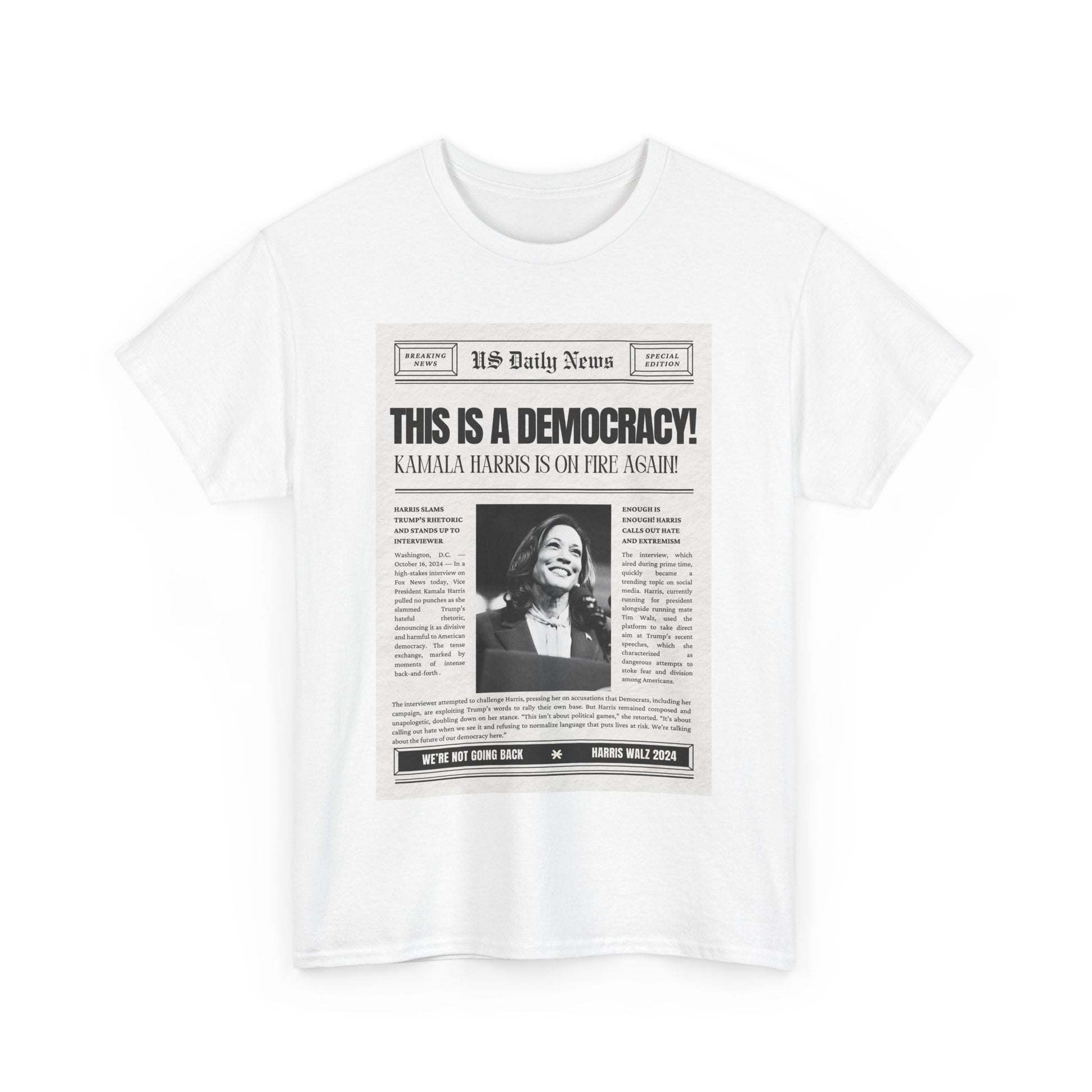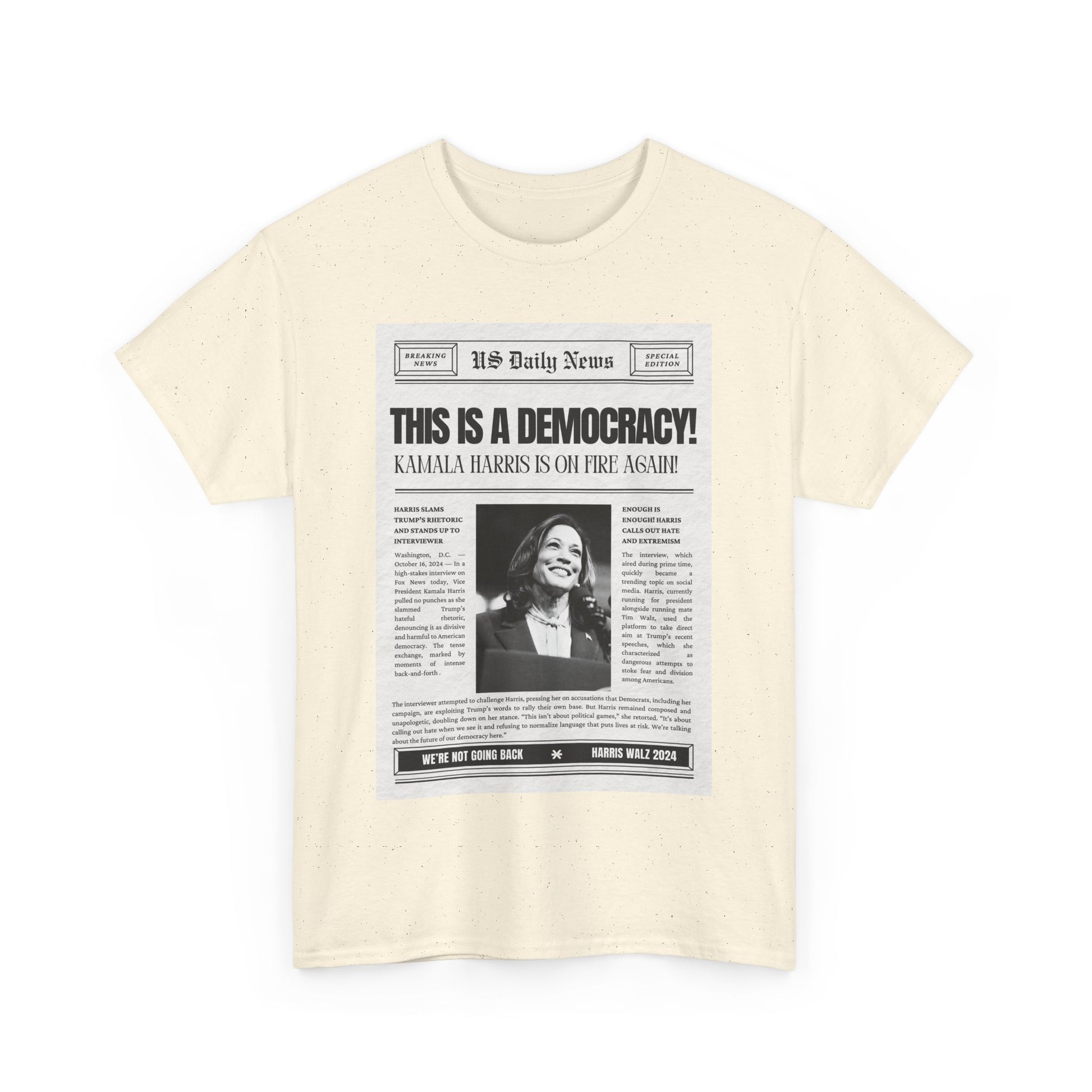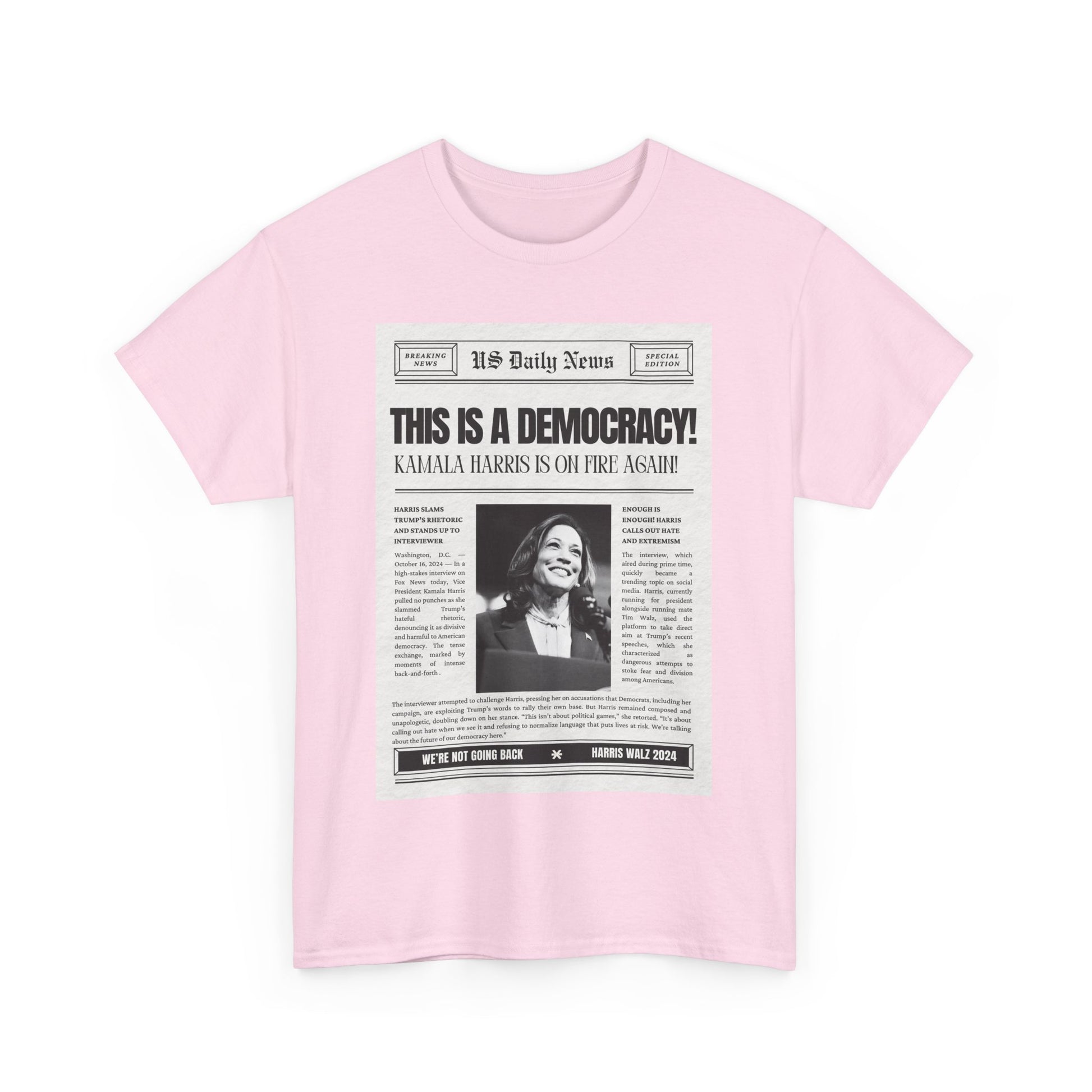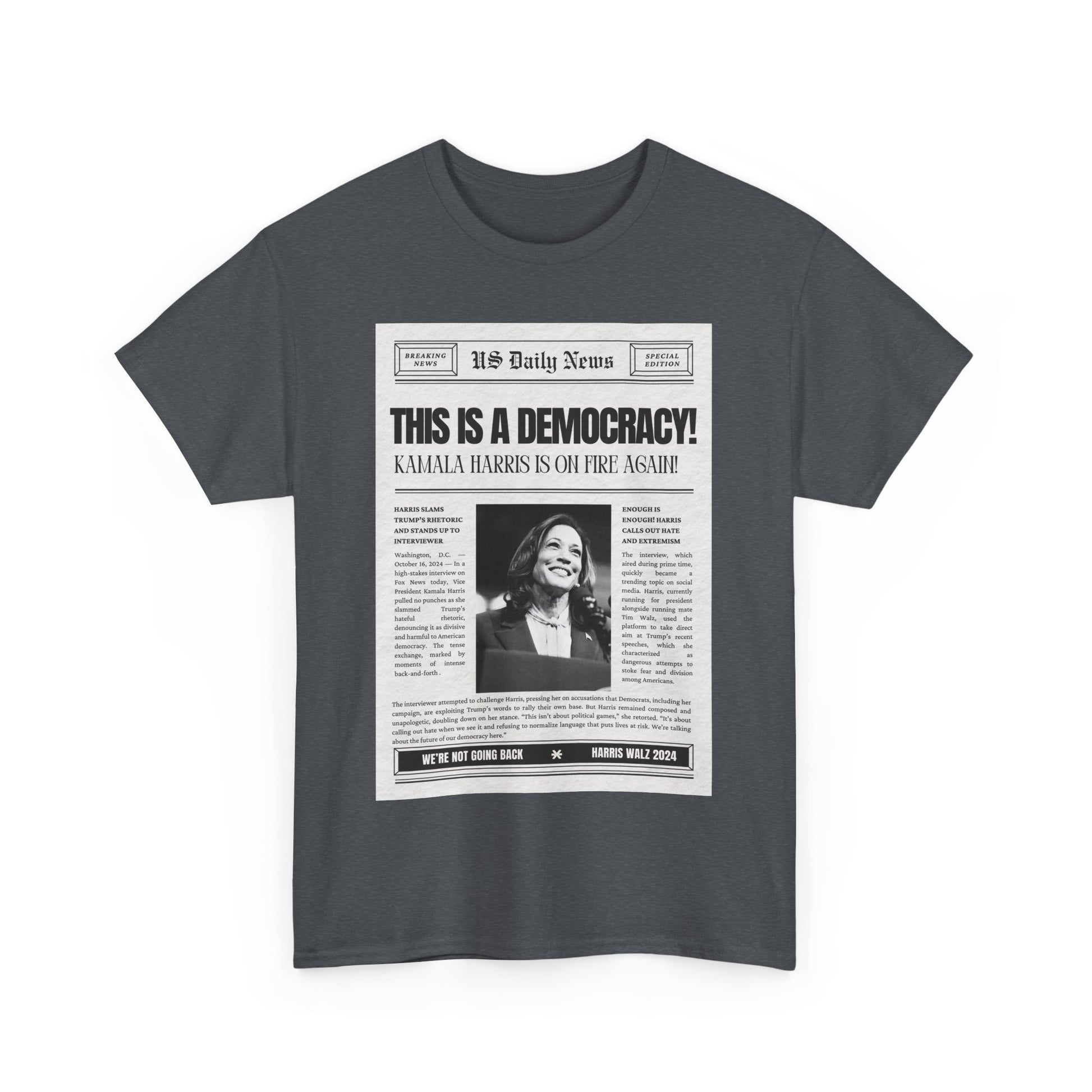 Inspired by Kamala Harris's impactful statement on Fox News, this T-shirt delivers a message that should be obvious, yet apparently still needs to be said: "This is a democracy." Designed with a vintage newspaper print, the tee combines retro style with a hint of sarcasm, reflecting the frustration of having to remind some that democracy is still the foundation of our nation. Made from soft, premium cotton, this shirt is perfect for anyone who stands for justice, unity, and the power of the people. Wear it proudly to rallies, casual outings, or whenever you need to make it clear that our rights aren’t up for debate.