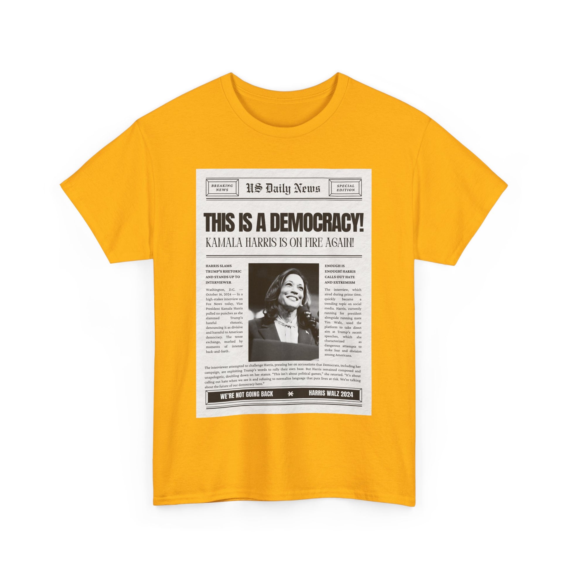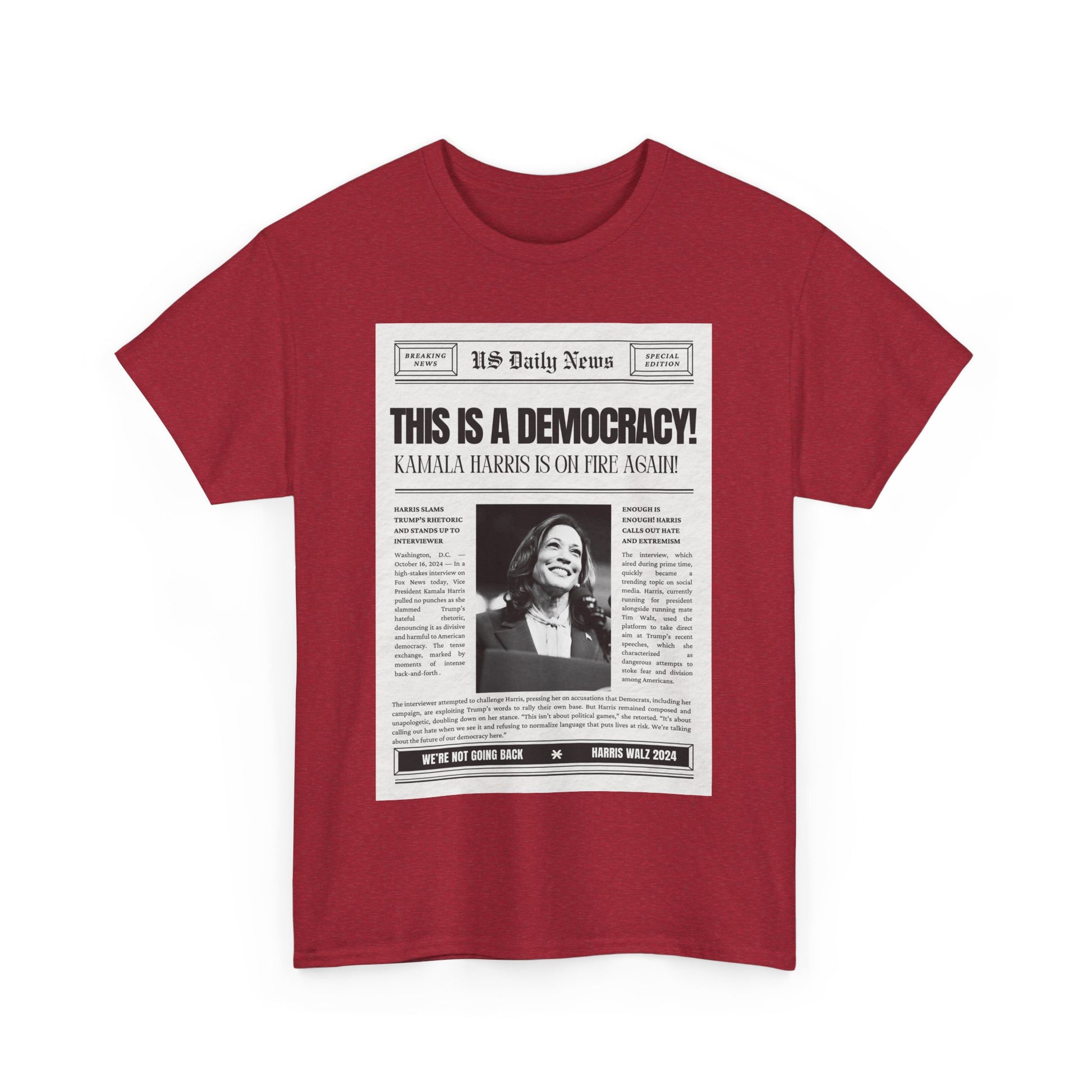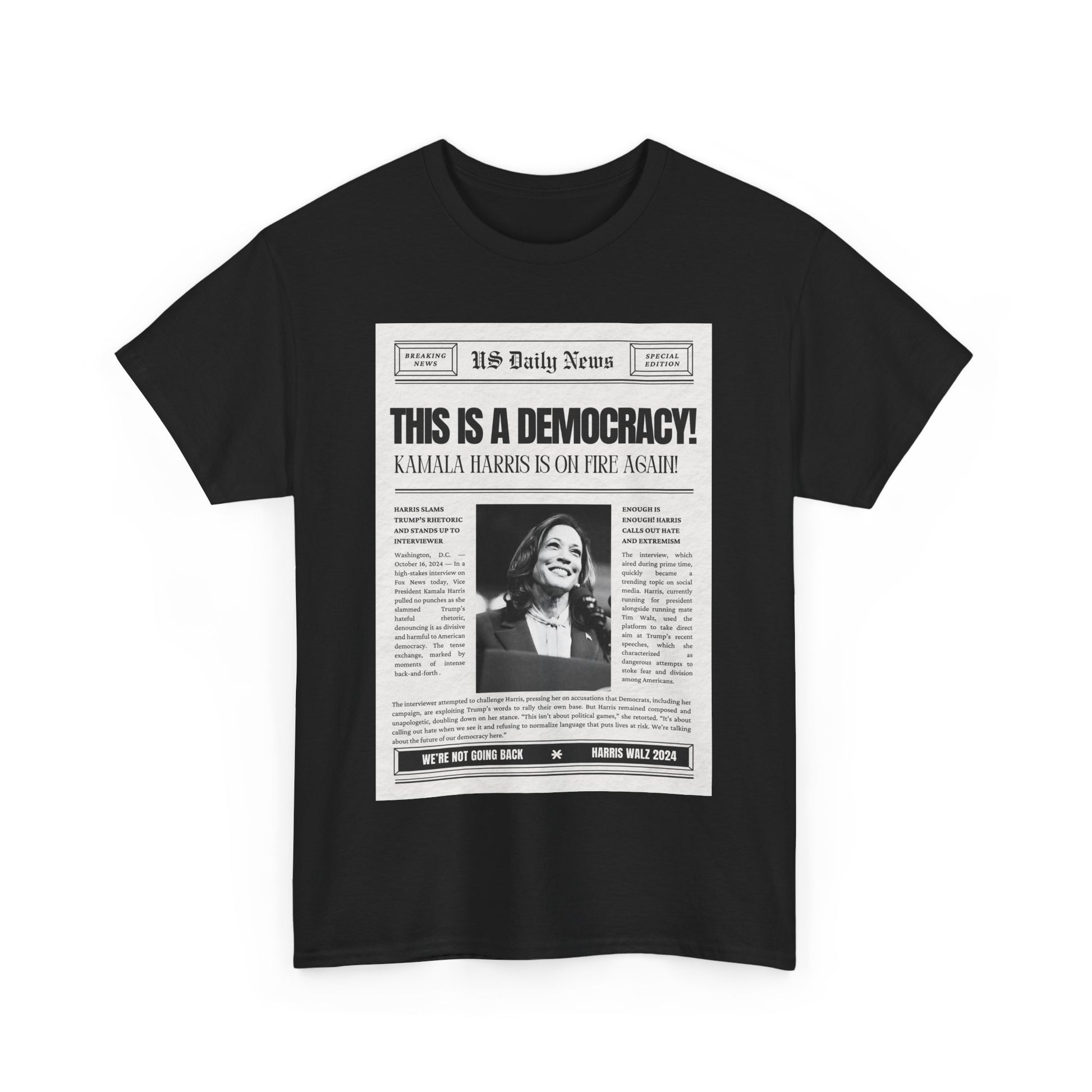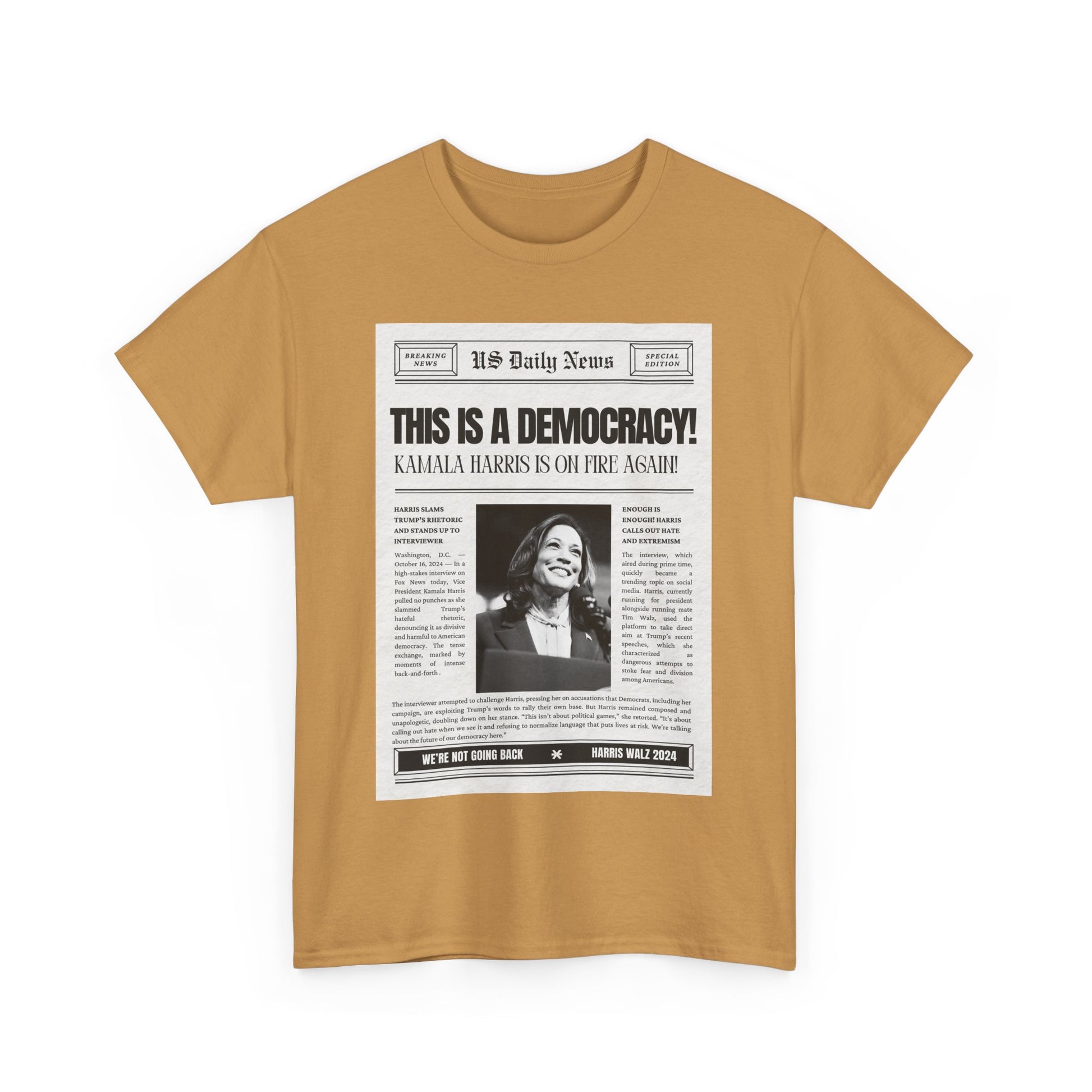 Inspired by Kamala Harris's impactful statement on Fox News, this T-shirt delivers a message that should be obvious, yet apparently still needs to be said: "This is a democracy." Designed with a vintage newspaper print, the tee combines retro style with a hint of sarcasm, reflecting the frustration of having to remind some that democracy is still the foundation of our nation. Made from soft, premium cotton, this shirt is perfect for anyone who stands for justice, unity, and the power of the people. Wear it proudly to rallies, casual outings, or whenever you need to make it clear that our rights aren’t up for debate.